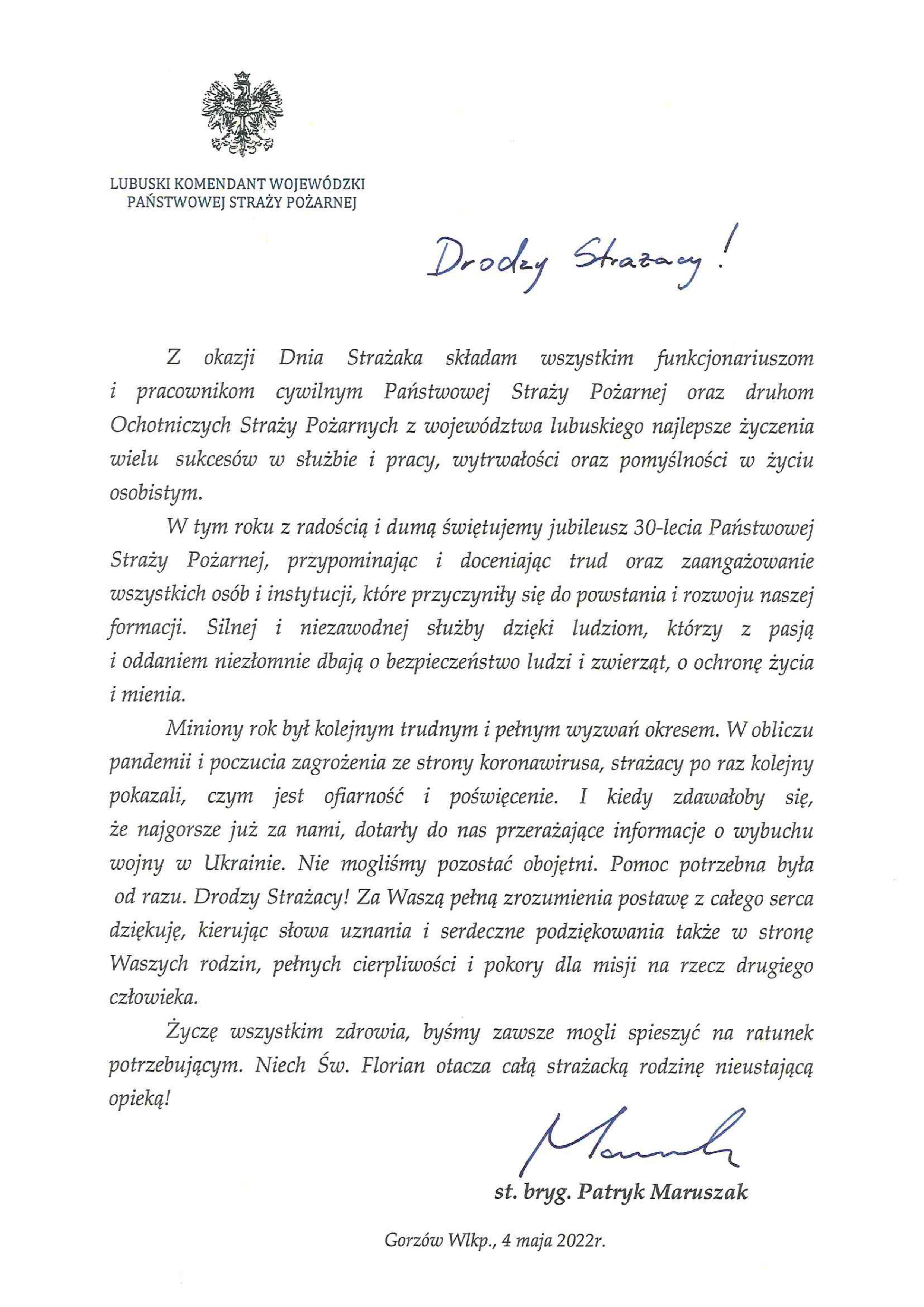 Poniżej pismo Lubuskiego Komendanta Wojewódzkiego PSP st. bryg. Patryka Maruszaka z okazji Dnia Strażaka.
