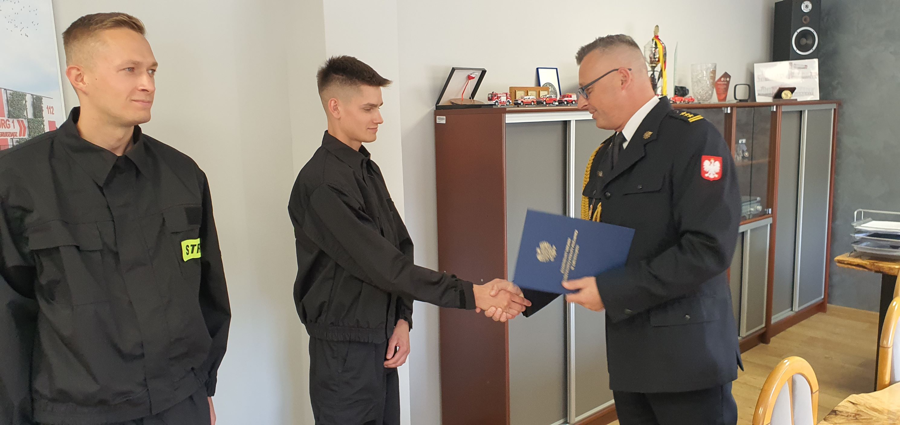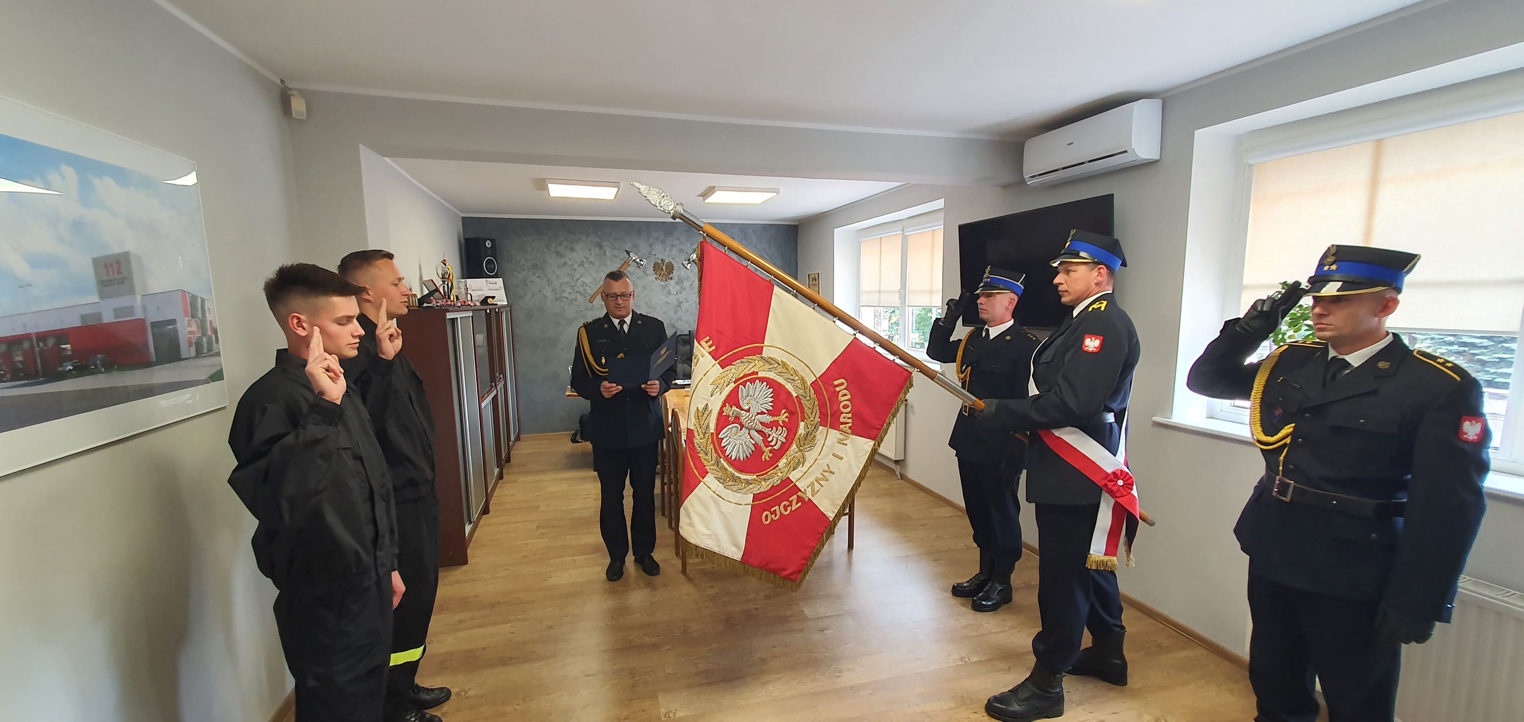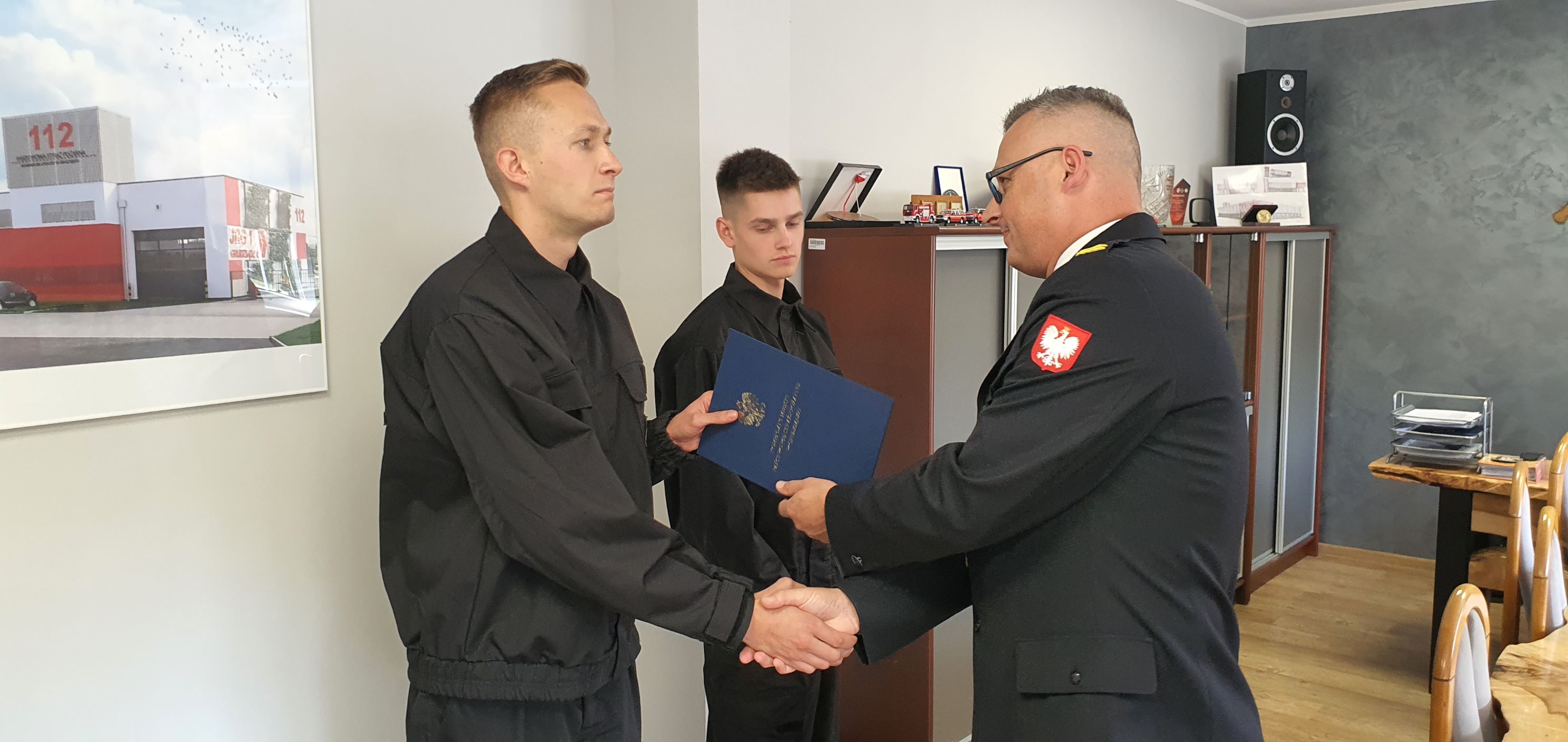 Dziś w gabinecie Komendanta Miejskiego PSP w Grudziądzu odbyło się ślubowanie dwóch funkcjonariuszy rozpoczynających służbę w naszej komendzie. Słowa roty „…ślubuję być ofiarnym i mężnym w ratowaniu zagrożonego życia ludzkiego i wszelkiego mienia - nawet z narażeniem życia…”, wypowiedziane przez: str. Kamila Antolaka i str. Wiktora Hulewicza przyjął st. bryg. Robert Gutowski. Obaj strażacy zasilą szeregi JRG nr 1 w Grudziądzu. Nowym kolegom życzymy zadowolenia z pełnienia służby w PSP i tradycyjnie tyle samo szczęśliwych powrotów co wyjazdów do akcji.