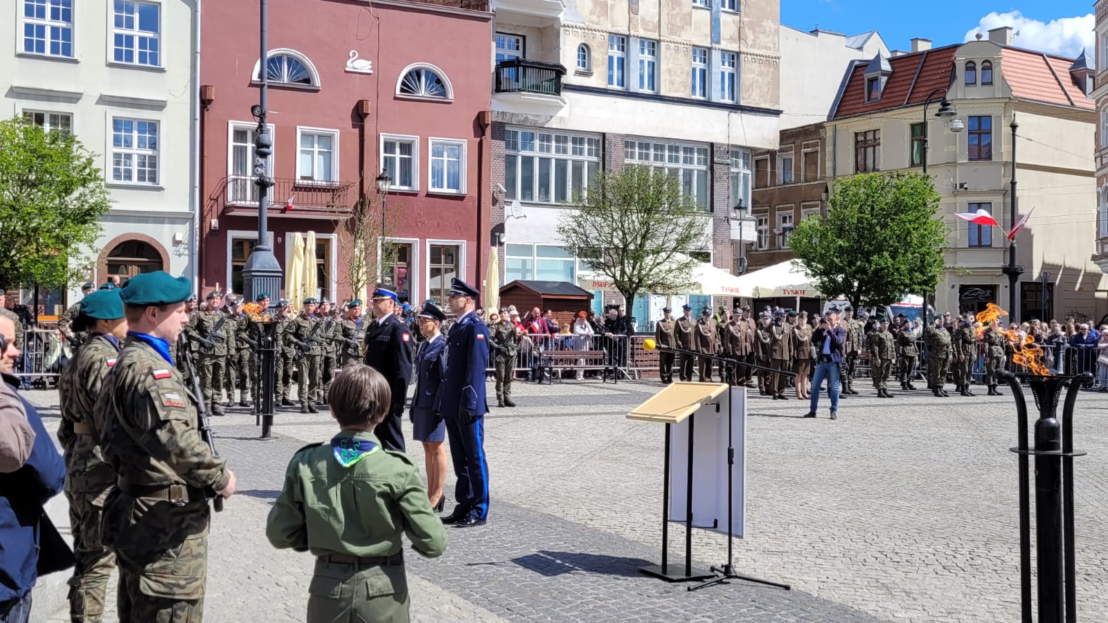 Dziś na grudziądzkim Rynku odbyła się uroczystość z okazji Narodowego Święta Trzeciego Maja. W 232 rocznicę uchwalenia drugiej na świecie, a pierwszej w Europie konstytucji, pod pomnikiem Żołnierza Polskiego, wiązanki złożyły delegacje samorządowców i służb mundurowych. W imieniu strażaków hołd twórcom konstytucji oddał st. bryg. Robert Gutowski - Komendant Miejski PSP w Grudziądzu.