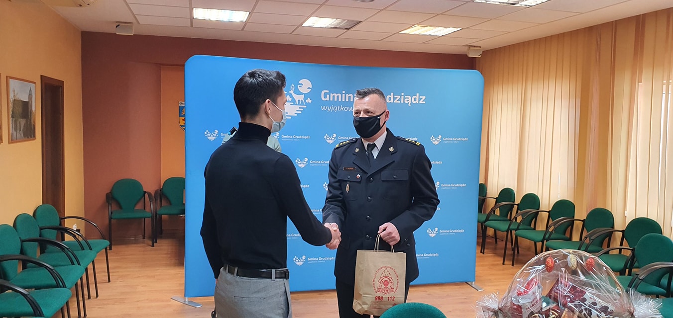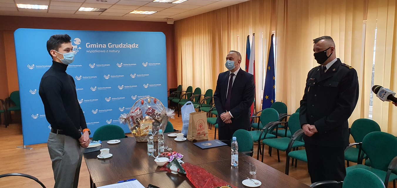 Dziś w Urzędzie Gminy Grudziądz miała miejsce skromna lecz doniosła uroczystość. Wójt gminy pan Andrzej Rodziewicz, wraz z Komendantem Miejskim PSP st. bryg. Robertem Gutowskim, złożył podziękowania i wręczył drobne upominki 18-letniemu mieszkańcowi wsi Kobylanka za bohaterską i godną naśladowania postawę. Przypomnijmy, że 13 grudnia w godzinach wieczornych, Kamil i jego 8-letnia bratanica Joasia jako pierwsi zareagowali przy rozwijającym się pożarze mieszkania w budynku wielorodzinnym na ul. Fortecznej w Grudziądzu. Dzięki ich postawie i działaniu w zdarzeniu tym nie doszło do ludzkiej tragedii. Brawa dla naszych bohaterów.