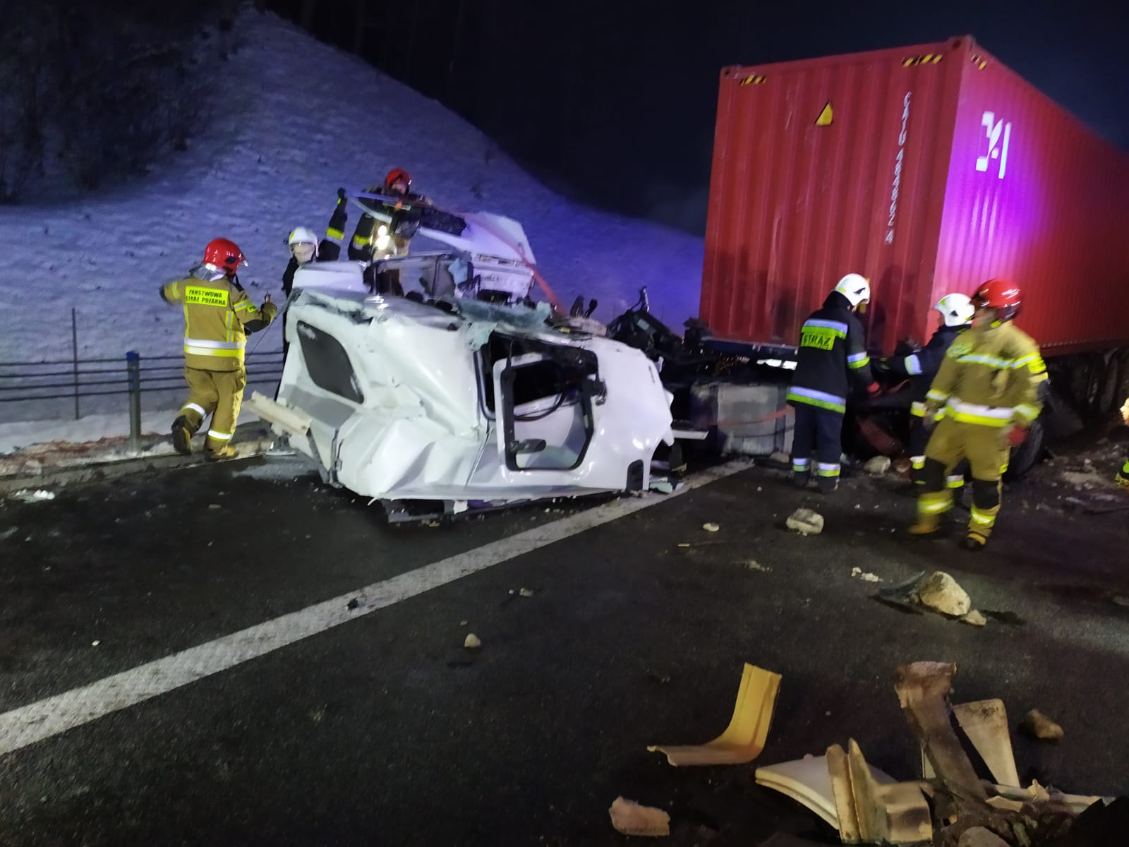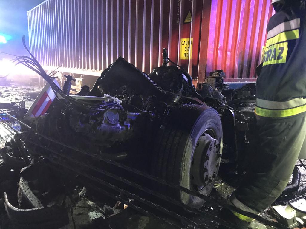 W poniedziałek, o godz. 0:20, Stanowisko Kierowania KM PSP w Grudziądzu otrzymało zgłoszenie o wypadku pojazdu ciężarowego na grudziądzkim odcinku autostrady A1 w miejscowości Ruda. Do działań ratowniczych udały się zastępy z OSP w Rudzie i Szynychu, oraz obydwu grudziądzkich JRG. Na miejscu strażacy zastali zniszczony, w wyniku zdarzenia, ciągnik siodłowy w zestawie z naczepą, stojący na pasie awaryjnym i jednym z trzech pasów ruchu. Kabina ciężarówki zerwała się z ramy i leżała na jezdni. Wewnątrz znajdował się zakleszczony kierowca. Aby go ewakuować, wykonano dostęp przy użyciu sprzętu hydraulicznego. Poszkodowany mężczyzna został wstępnie zaopatrzony i zabrany przez Zespół Ratownictwa Medycznego do szpitala. W późniejszej fazie akcji przepompowano paliwo z uszkodzonego ciągnika do pojemników zastępczych. W wyniku zdarzenia uszkodzone zostały jeszcze 2 inne pojazdy ciężarowe. Straty wstępnie oszacowano na 213 tys. PLN. W czasie prowadzenia działań ruch na jezdni w kierunku Łodzi był utrudniony, ponieważ odbywał się jednym pasem. W trwającej niespełna 2 godziny akcji łącznie brało udział 7 zastępów, Policja i pracownicy operatora autostrady.