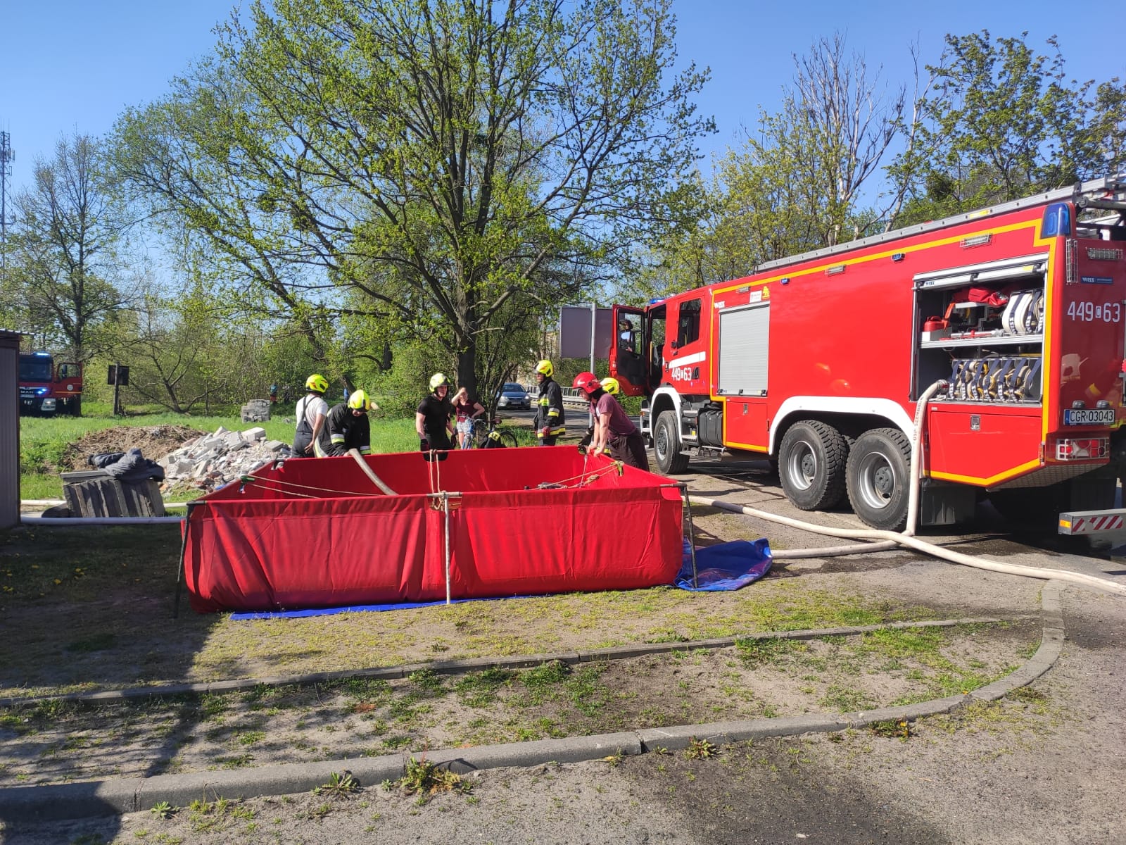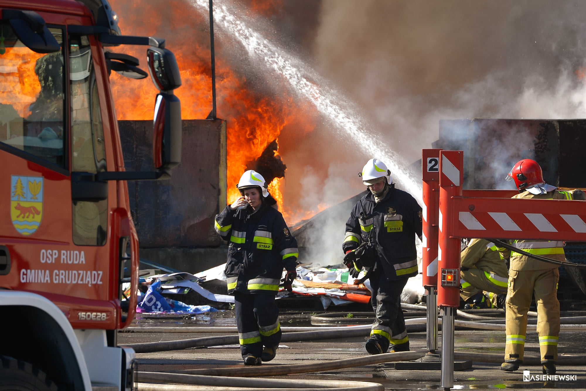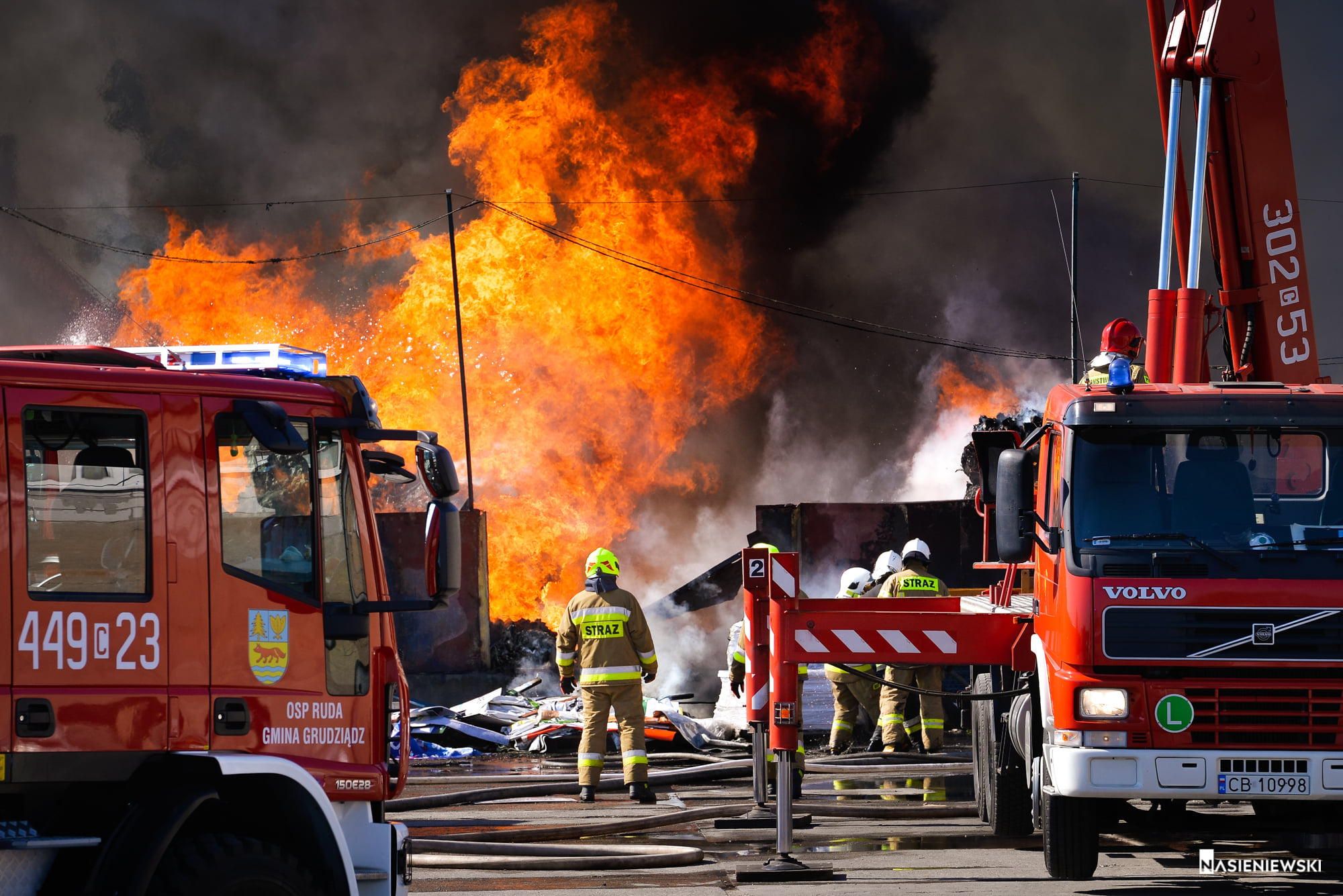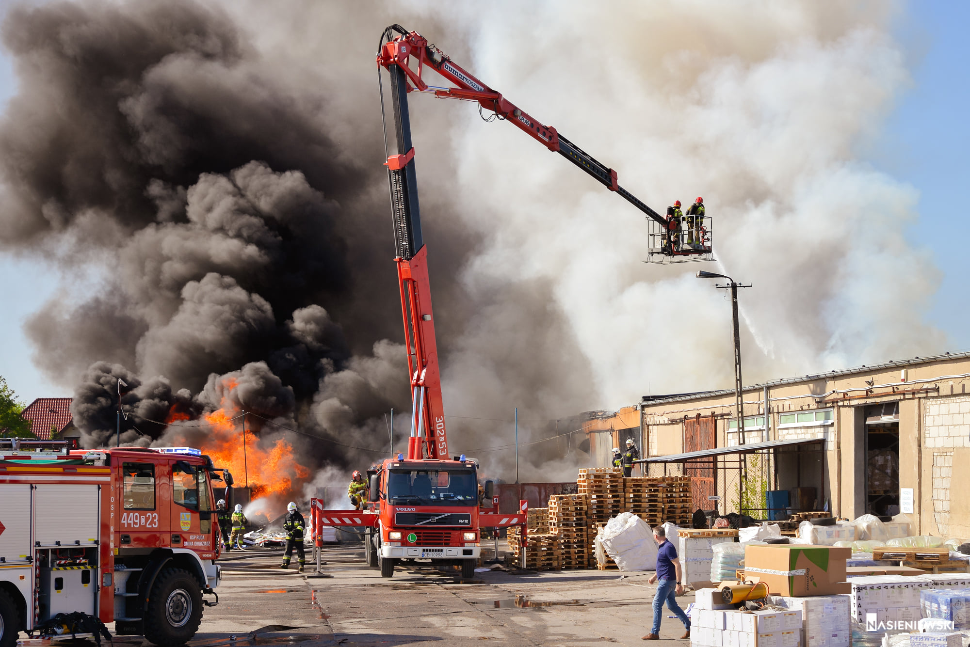 11 maja, chwilę po godzinie 15 do Stanowiska Kierowania KM PSP w Grudziądzu zaczęły wpływać informację o pożarze składu makulatury na ul. Mieczykowej. Zadysponowane w pierwszej fazie zastępy z JRG zastały szybko rozwijający się pożar makulatury i tworzyw sztucznych sprasowanych w baloty i ułożonych na placu. Silny wiatr, wysoka temperatura i duże zadymienie nie pozwoliły na lokalizację błyskawicznie przybierającego na sile pożaru. W wyniku oddziaływania strumienia cieplnego, wytwarzanego przez płomienie, zapaleniu uległo pokrycie dachowe obiektu produkcyjno – magazynowego. Do działań zadysponowano kolejne siły i środki z terenu powiatu grudziądzkiego. Dzięki temu możliwe było zrealizowanie natarcia okrążającego cały obwód pożaru oraz działań w obronie dwóch zagrożonych obiektów budowlanych znajdujących się na terenie sąsiednich firm. W kulminacyjnym punkcie podawanych było 14 prądów gaśniczych. Zaopatrzenie wodne realizowano przy wykorzystaniu miejskiej sieci hydrantowej, z pobliskich zakładów oraz punktu czerpania wody na kanale Trynka. Chronione obiekty udało się obronić. Kolejna faza akcji wymagała użycia ciężkiego sprzętu w postaci ładowarek kołowych, które zorganizował właściciel firmy. Przy ich wykorzystaniu transportowano i rozbijano baloty sprasowanej makulatury i tworzyw sztucznych jednocześnie przelewając je wodą. Wyburzone zostały także elementy ścian hali grożące zawaleniem. Oprócz sił i środków OSP i PSP z Grudziądza i powiatu ziemskiego na miejsce działań przybyła grupa operacyjna KW PSP w Toruniu ze st. bryg. Sławomirem Herbowskim na czele. Akcję gaśniczą wspierały także Policja, Straż Miejska, Pogotowie Ratownicze, Pogotowie Energetyczne, Wydział Zarządzania Kryzysowego, WIOŚ oraz inne podmioty. W trwających ponad 8 godzin działaniach udział brały 32 zastępy i dodatkowy sprzęt. W wyniku zdarzenia poszkodowany został jeden z pracowników firmy -podczas próby gaszenia pożaru w zarodku. Doznał on lekkich poparzeń. Straty wstępnie oszacowano na 1,3 mln PLN. Przyczynę pożaru ustalają funkcjonariusze KMP w Grudziądzu.