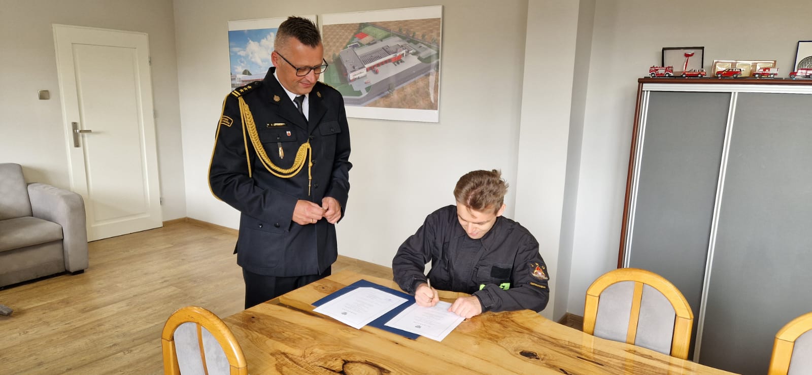 Dziś w gabinecie Komendanta Miejskiego PSP w Grudziądzu, strażackie ślubowanie złożył, kolejny w tym roku przyjęty do służby funkcjonariusz, str. Sebastian Rutyna. Strażak będzie pełnił służbę w podziale bojowym Jednostki Ratowniczo – Gaśniczej nr 1. Na początku pożarniczej kariery Sebastianowi życzymy wytrwałości potrzebnej w tej trudnej profesji oraz samych szczęśliwie zakończonych akcji.