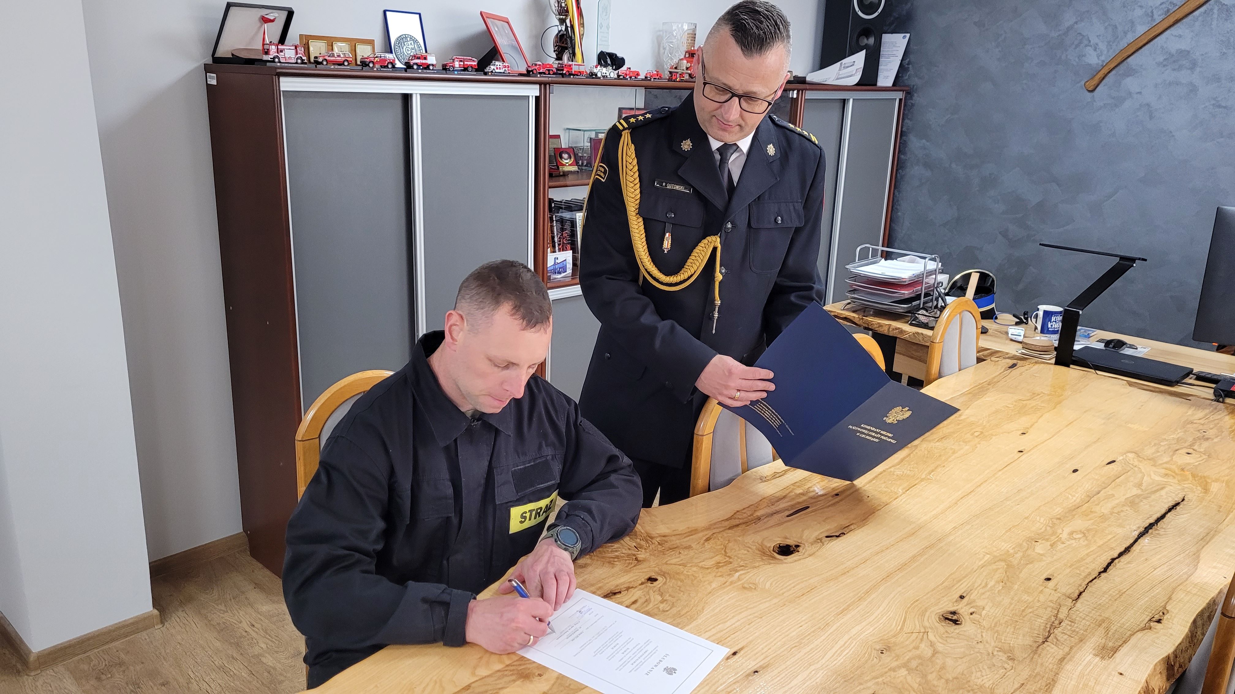W Dzień Strażaka w gabinecie Komendanta Miejskiego PSP w Grudziądzu, dwóch funkcjonariuszy, którzy w maju rozpoczęli służbę, złożyło ślubowanie na sztandar naszej komendy. Rotę ślubowania za st. bryg. Robertem Gutowskim wypowiedzieli: str. Artur Szmelcer z JRG nr 1 i str. Michał Kozłowski z JRG nr 2. Nowym Kolegom życzymy zadowolenia z pełnienia tej wymagającej służby.
