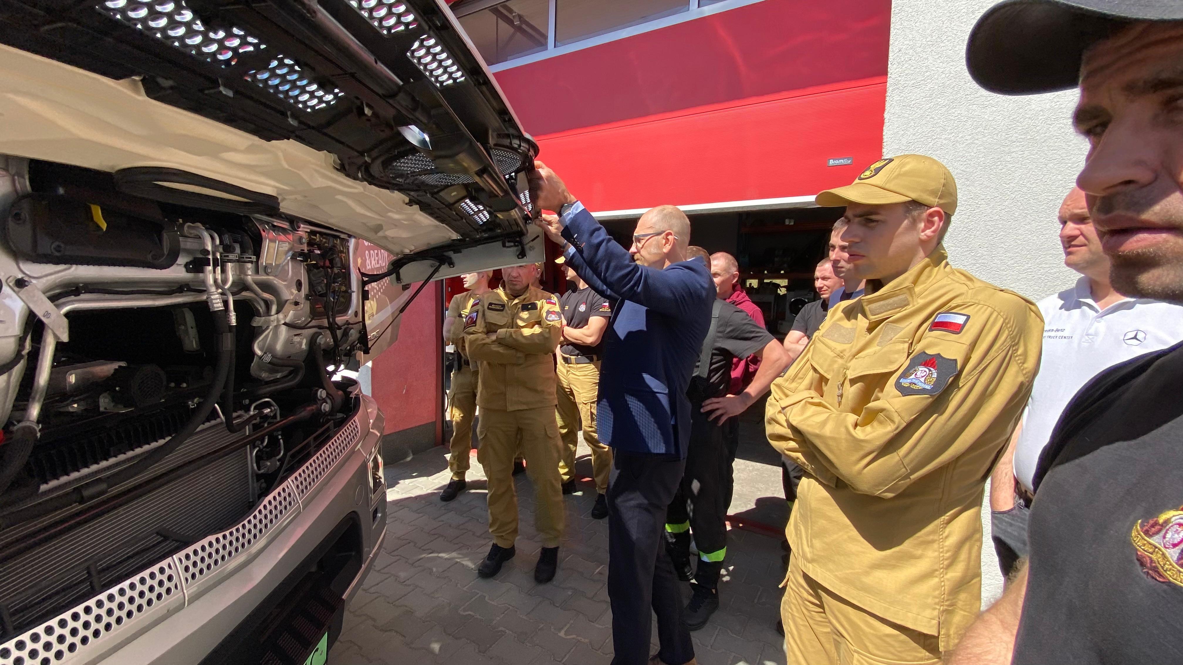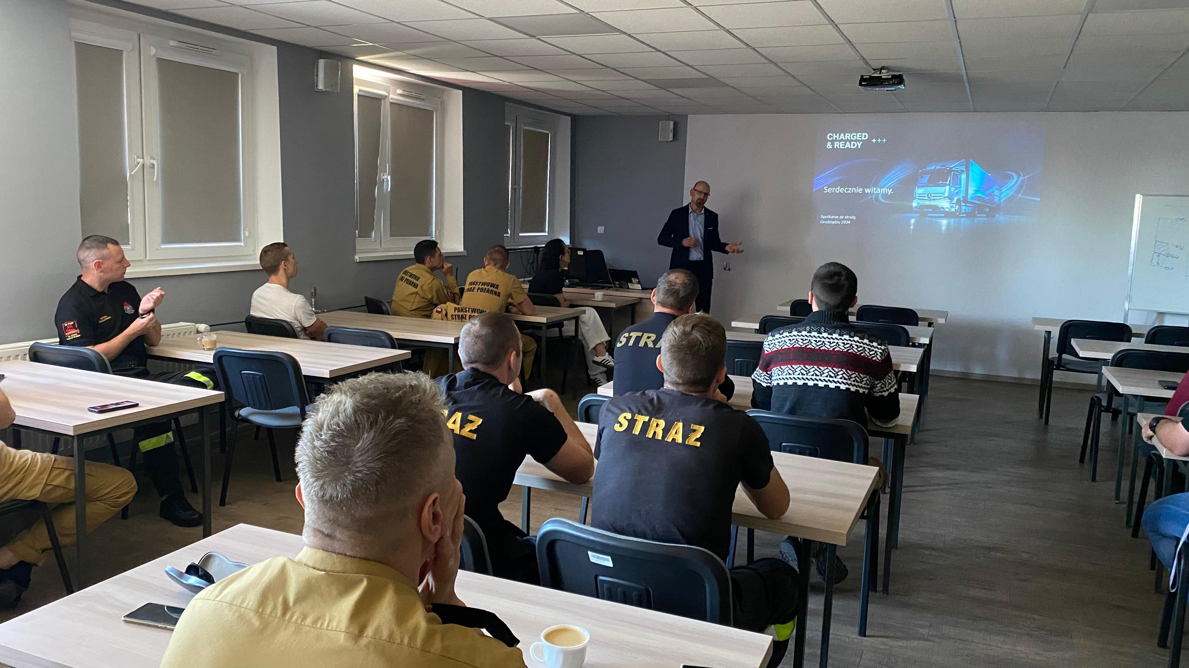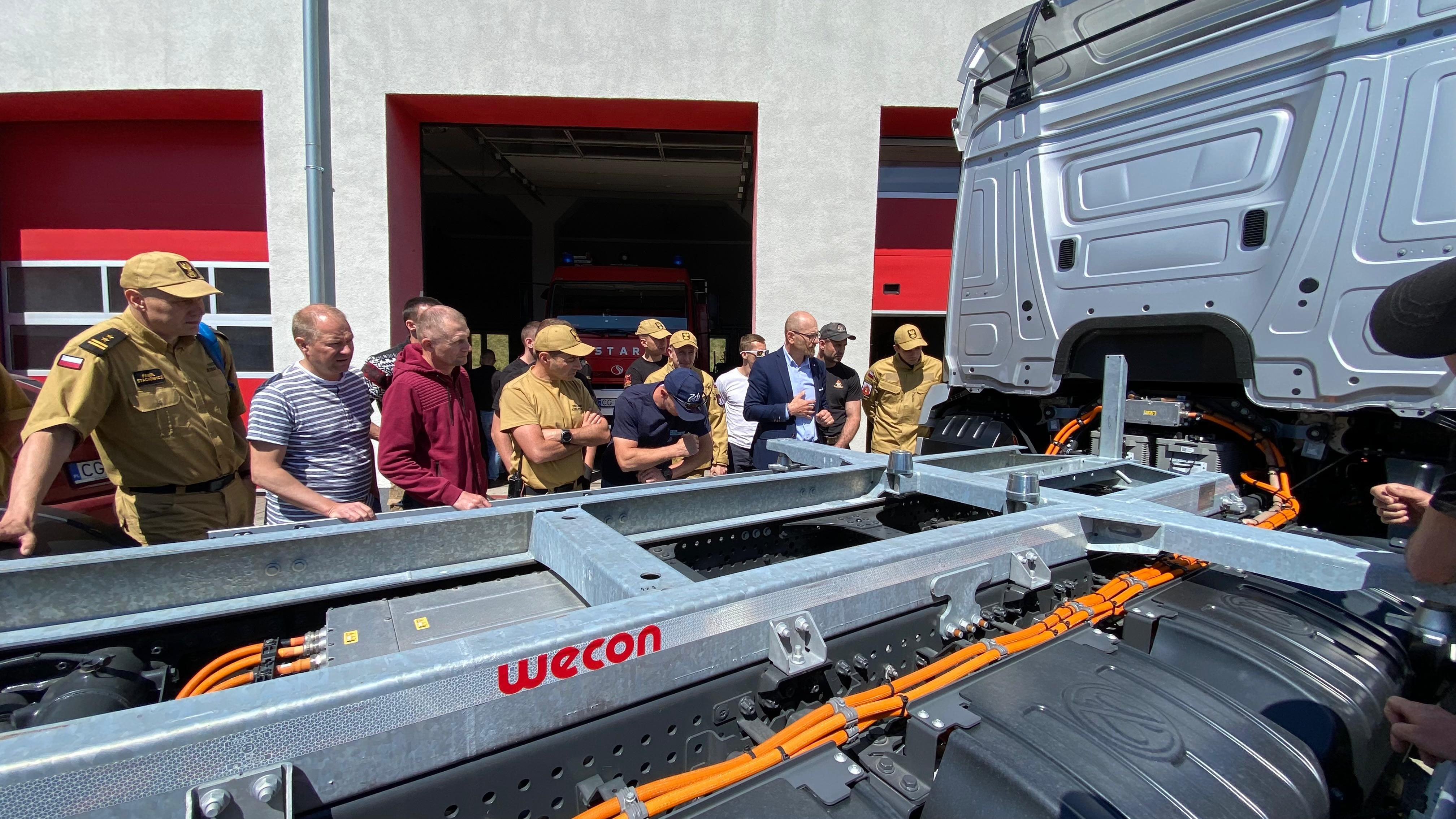 Przed południem na terenie JRG nr 2 w Grudziądzu odbyło się szkolenie z zakresu bezpieczeństwa działań ratowniczych podczas zdarzeń z udziałem pojazdów ciężarowych o napędzie elektrycznym. W części teoretycznej spotkania strażacy zapoznali się z informacjami o pojazdach elektrycznych, ich układach napędowych, a także o zastosowanych w nich systemach bezpieczeństwa. Drugi etap szkolenia obejmował zagadnienia praktyczne z zakresu bezpiecznego prowadzenia działań ratowniczo - gaśniczych.