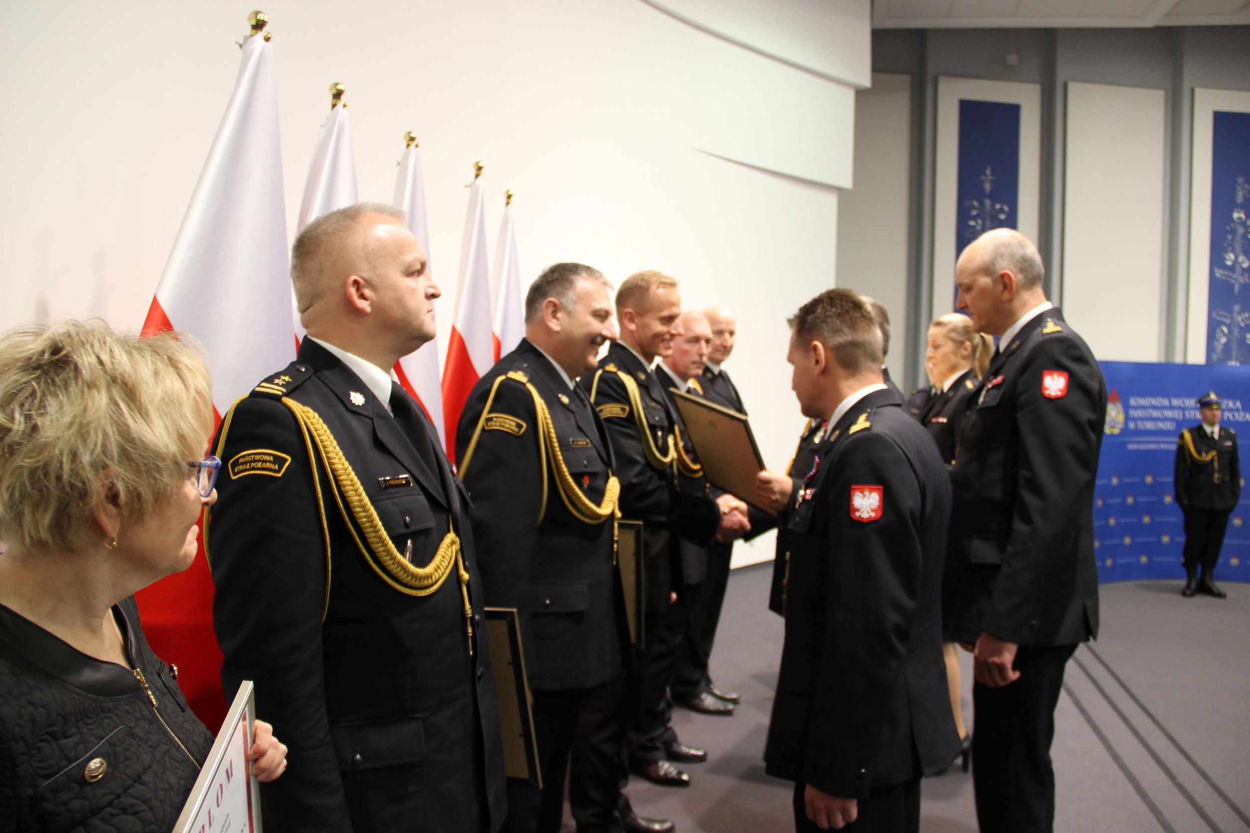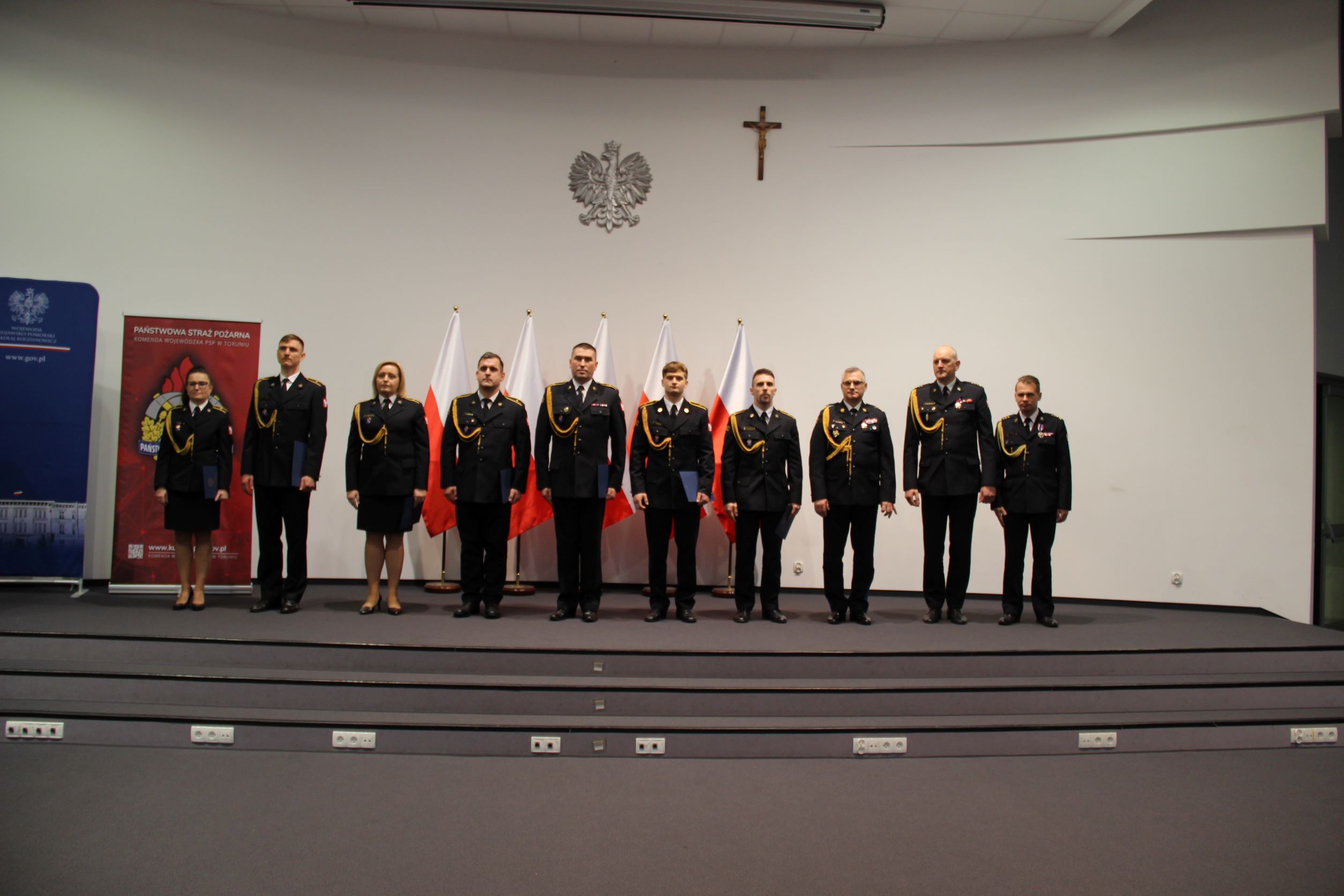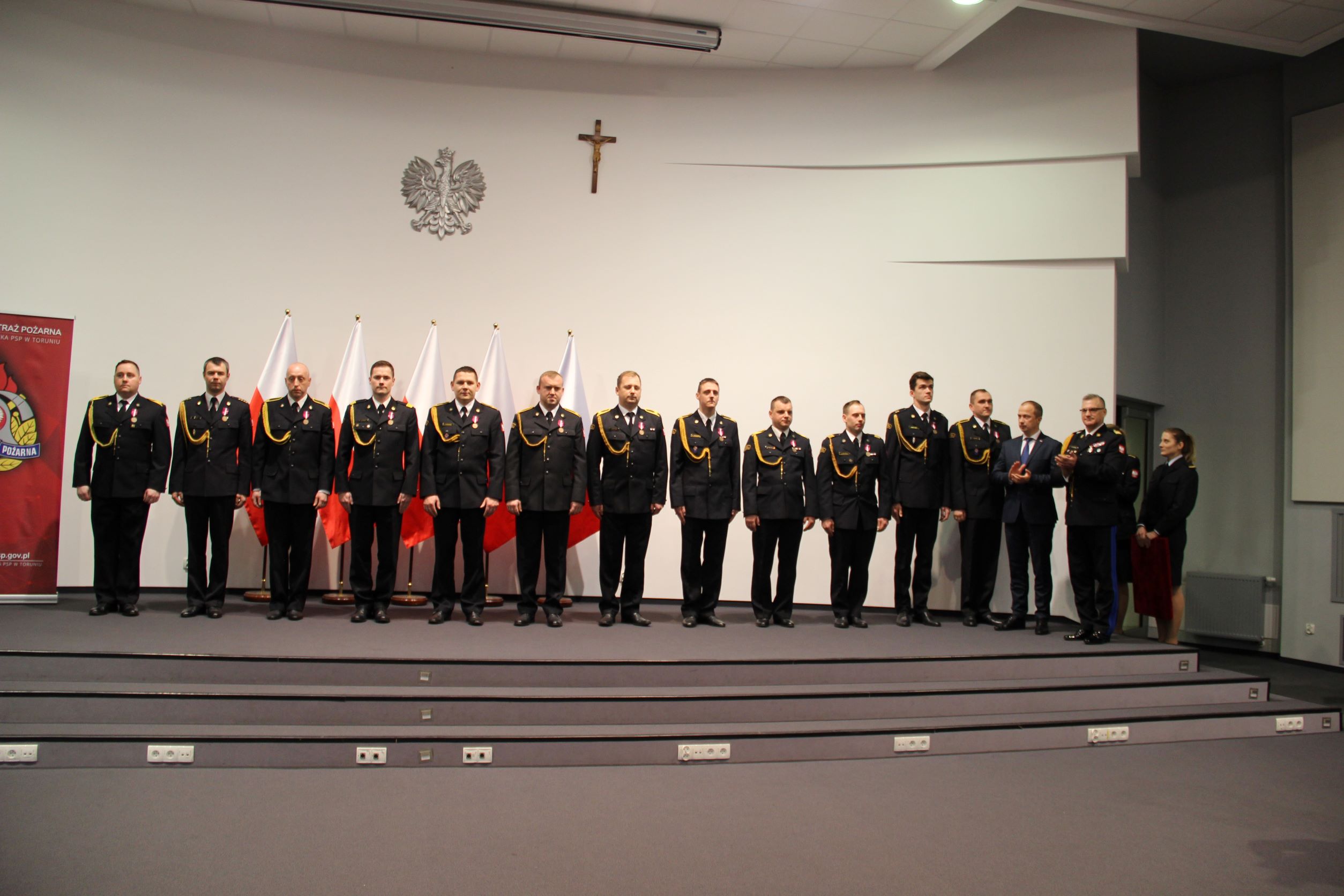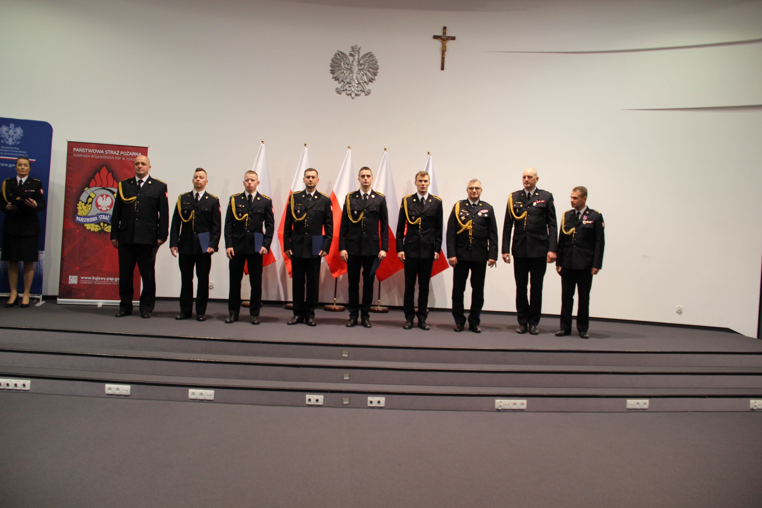 Dziś w Kujawsko-Pomorskim Urzędzie Wojewódzkim w Bydgoszczy odbyła się uroczysta zbiórka z okazji Narodowego Święta Niepodległości. W tym patriotycznym wydarzeniu oprócz strażaków wszystkich komend naszego regionu wzięli udział zaproszeni goście m.in.: Ewa Kozanecka - Poseł na Sejm RP, wicewojewoda kujawsko-pomorski Radosław Kempinski, komendant wojewódzki Policji w Bydgoszczy - nadinsp. Piotr Leciejewski, szefowie i przedstawiciele służb oraz instytucji na co dzień współpracujących ze strażakami. W trakcie uroczystości zostały wręczone medale, odznaczenia i wyróżnienia oraz awanse na wyższe stopnie służbowe dla funkcjonariuszy i pracowników PSP. Z naszej komendy awansowanych, odznaczonych lub wyróżnionych zostało 11 funkcjonariuszy.