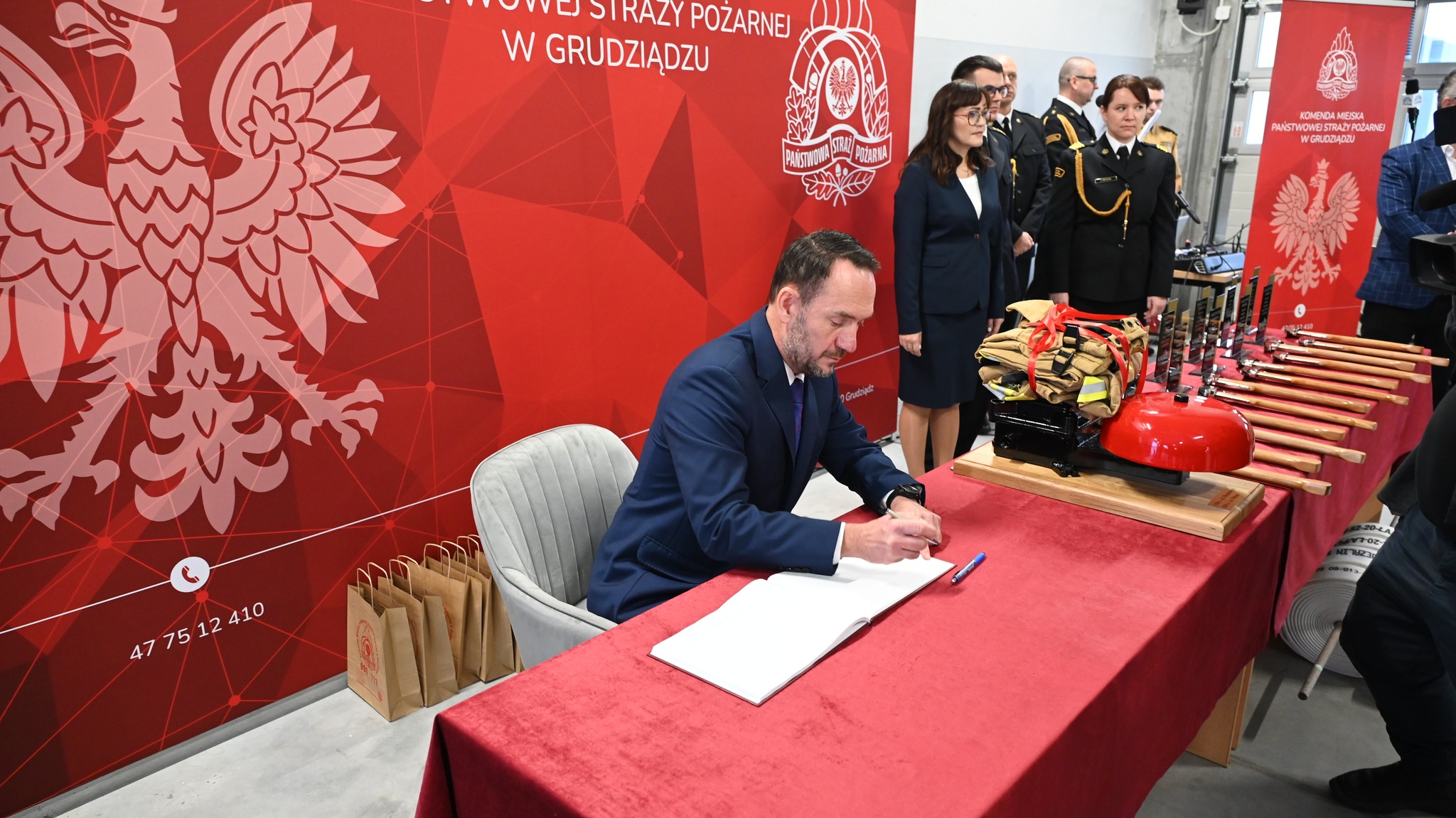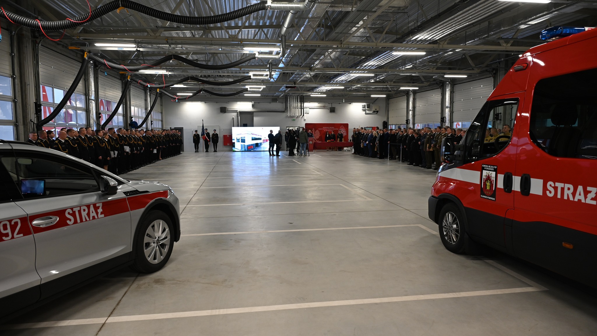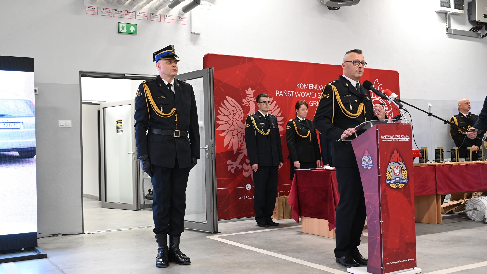 Symboliczny klucz do nowej siedziby st. bryg. Robertowi Gutowskiemu wręczył minister Szymański. Obiekt oraz symbole religijne zostały poświęcone przez księdza kanonika Dariusza Kunickiego. Komendant Miejski złożył serdeczne podziękowania wręczając pamiątkowe toporki i statuetki wszystkim osobom, które przyczyniły się do realizacji tej inwestycji. Nasi szanowni goście dokonali wpisów w okolicznościowej księdze pamiątkowej. Uroczysty apel był okazją do wręczenia odznaczeń, awansów i nagród dla strażaków z Grudziądza, Świecia, Wąbrzeźna i Chełmna z okazji przypadającego w tym tygodniu Narodowego Święta Niepodległości. Oficjalnie przekazane zostały także 3 nowe pojazdy, które otrzymaliśmy w ostatnim czasie dwa elektryczne samochody operacyjne oraz dostawczy samochód kwatermistrzowski. Kolejnym punktem dzisiejszej uroczystości było odsłonięcie tablicy upamiętniającej strażaków, którzy polegli na służbie. Na koniec nastąpiło podpisanie listu intencyjnego pod zawiązanie Honorowego Społecznego Komitetu Organizacyjnego dla ufundowania i nadania sztandaru Komendzie Miejskiej PSP w Grudziądzu.