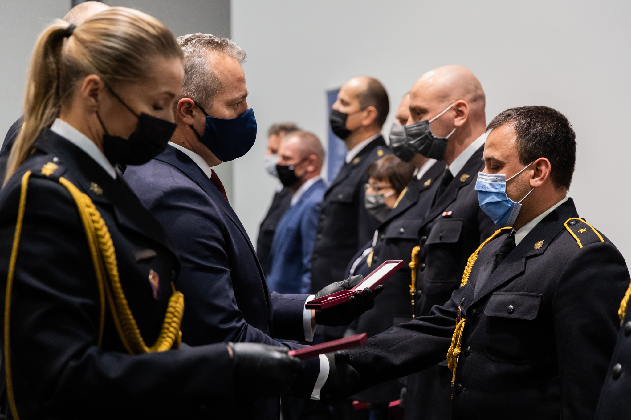 Wręczenia medali i odznaczeń dokonali Wojewoda Kujawsko-Pomorski - Mikołaj Bogdanowicz oraz Zastępca Kujawsko-Pomorskiego Komendanta Wojewódzkiego PSP - st. bryg. Sławomir Herbowski. W swych wystąpieniach obaj podziękowali zarówno funkcjonariuszom wykonującym wzorowo swoje „tradycyjne” obowiązki służbowe jak i tym, którzy czynnie wspierali służbę zdrowia w walce o życie i zdrowie Polaków zagrożone przez COVID-19. Wszystkim awansowanym i odznaczonym serdecznie gratulujemy.