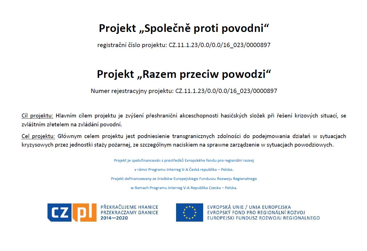 Informujemy, że KM PSP w Jastrzębiu-Zdroju jest beneficjentem projektu „Razem przeciw powodzi“ ze środków Europejskiego Funduszu Rozwoju Regionalnego w Ramach Programu Interreg V-A Republika Czeska – Polska. Realizacja projektu odbyła się od 1 stycznia 2018 roku do 30 czerwca 2019 roku. W związku z realizacją trwałości projektu organizowane jest spotkanie partnerów w dniu 30.10.2021r. w Zebrzydowicach.