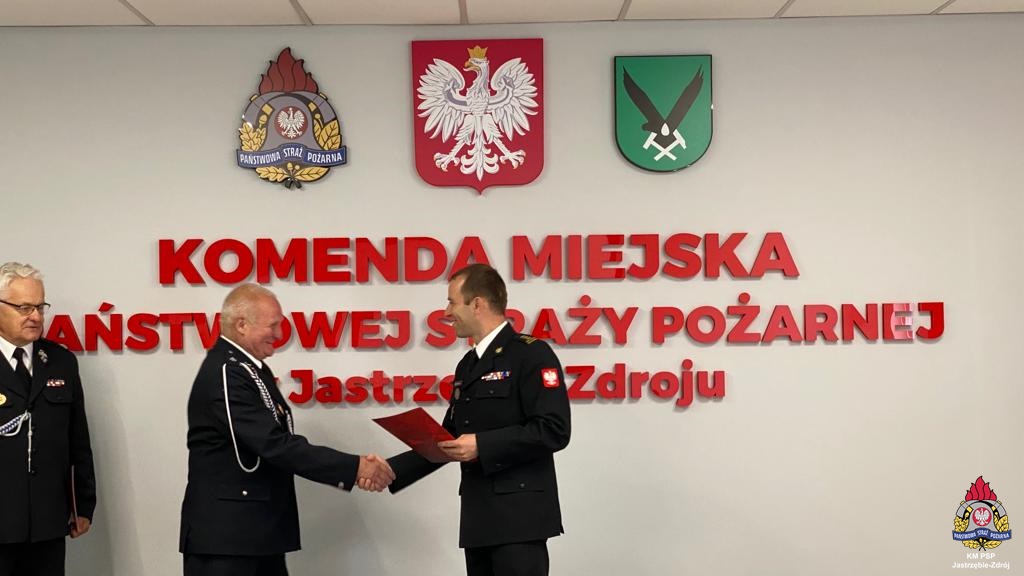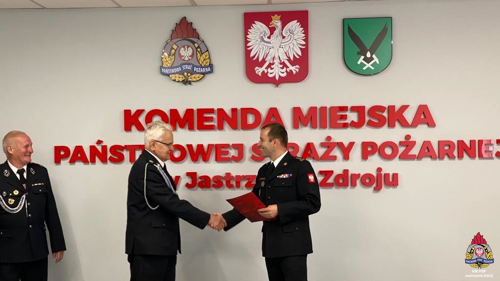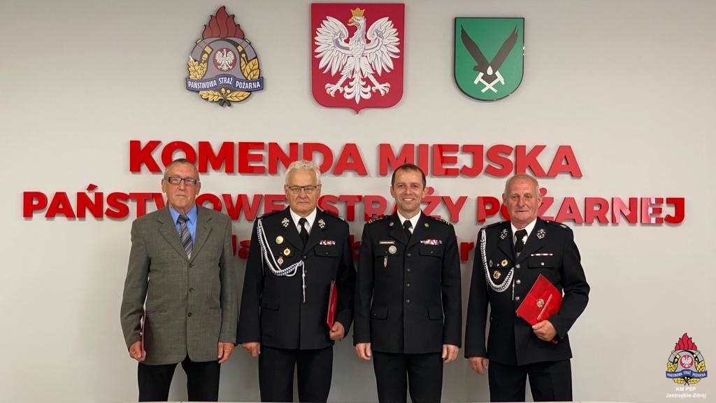 W dniu 15 lipca 2022 roku w siedzibie naszej jednostki Komendant Miejski Państwowej Straży Pożarnej w Jastrzębiu-Zdroju st. bryg. Wojciech Piechaczek wręczył kolejne decyzje o przyznaniu świadczenia ratowniczego z tytułu wysługi lat druhom Ochotniczych Straży Pożarnych z terenu miasta Jastrzębie-Zdrój. Otrzymało je dwóch druhów z OSP Ruptawa oraz jeden druh z OSP Górne. Jeden z druhów OSP służył w swojej jednostce ponad 50 lat. Zajmował stanowisko Prezesa OSP Górne, a później Prezesa Oddziału Powiatowego ZOSP RP w Jastrzębiu-Zdroju. Gratulujemy kolejnym zasłużonym otrzymania decyzji o przyznaniu świadczenia. Dziękujemy za Wasz wkład w ochronę przeciwpożarową na terenie miasta Jastrzębie-Zdrój i poświęcenie się służbie w OSP.