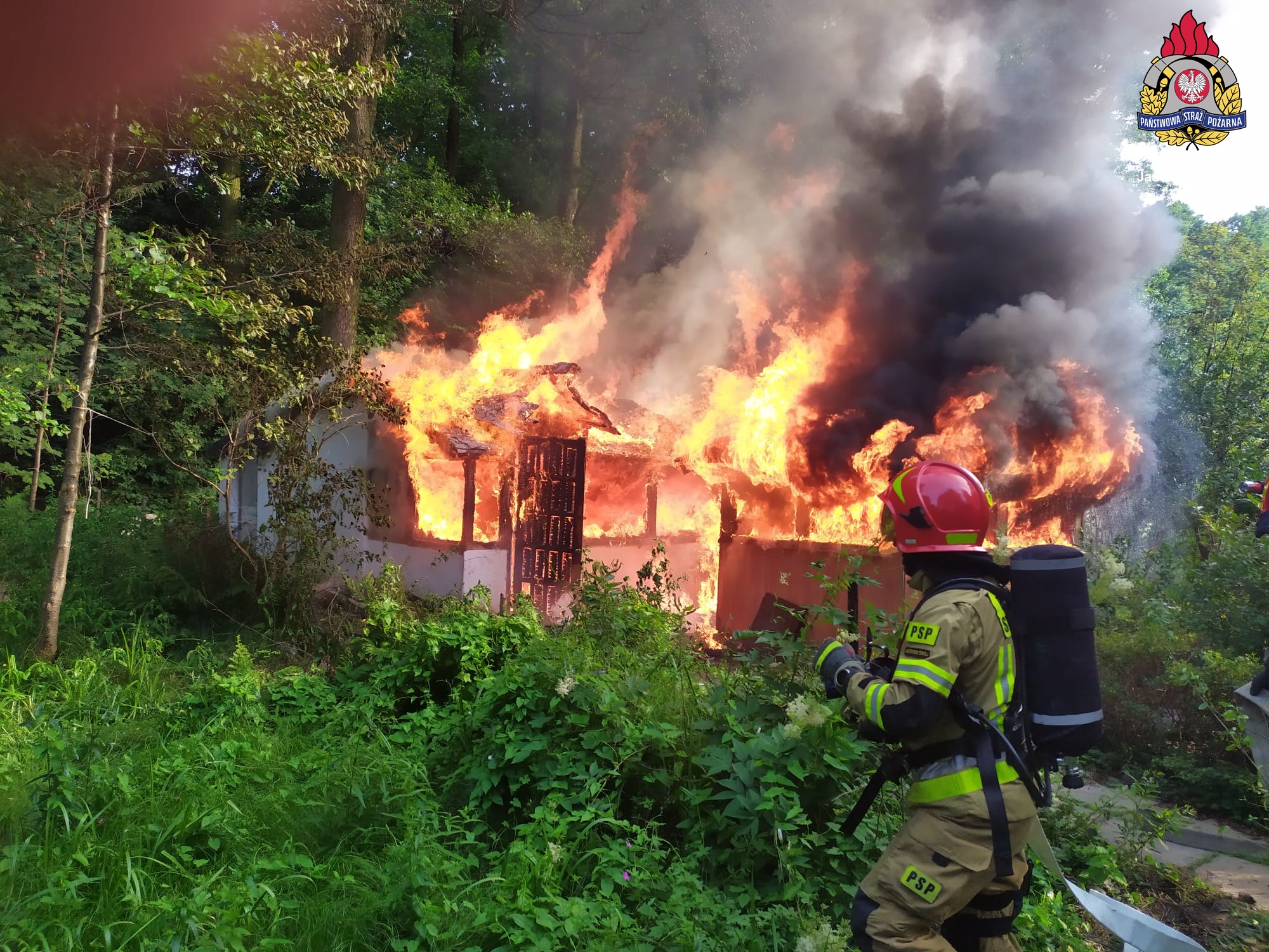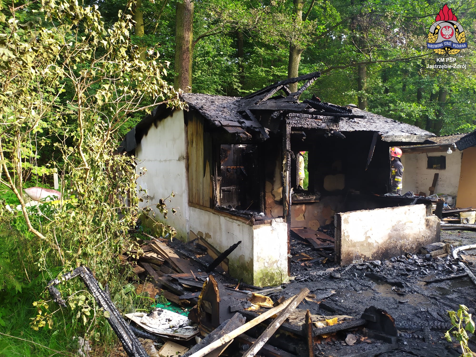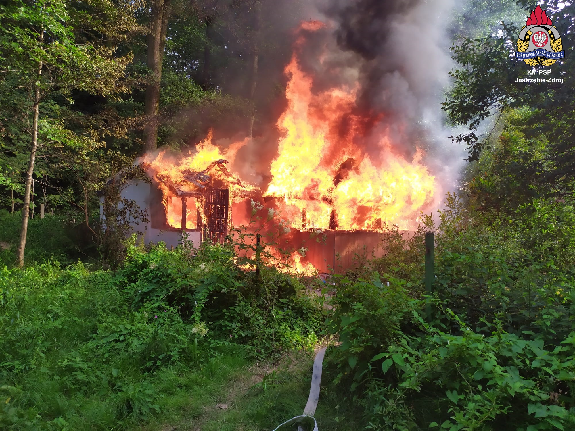 W dniu 13 lipca 2021 roku o godzinie 18:00 otrzymaliśmy zgłoszenie o pożarze altany przy ul. Podhalańskiej w Jastrzębiu-Zdroju. Po przyjeździe zastępów na miejsce zdarzenia stwierdzono, że pożarem objęta jest cała altana oraz przyległa do niej pergola. Natychmiast przystąpiono do działań gaśniczych podając dwa prądy wody w natarciu na palące się budowle. Równocześnie strażacy prowadzili rozpoznanie celem odnalezienia ewentualnych osób poszkodowanych. Po ugaszeniu pożaru zabudowań potwierdzono brak osób poszkodowanych. Strażacy przystąpili do oględzin pogorzeliska przy pomocy kamery termowizyjnej celem wykrycia pożarów ukrytych i ewentualnego dogaszenia zarzewi ognia.