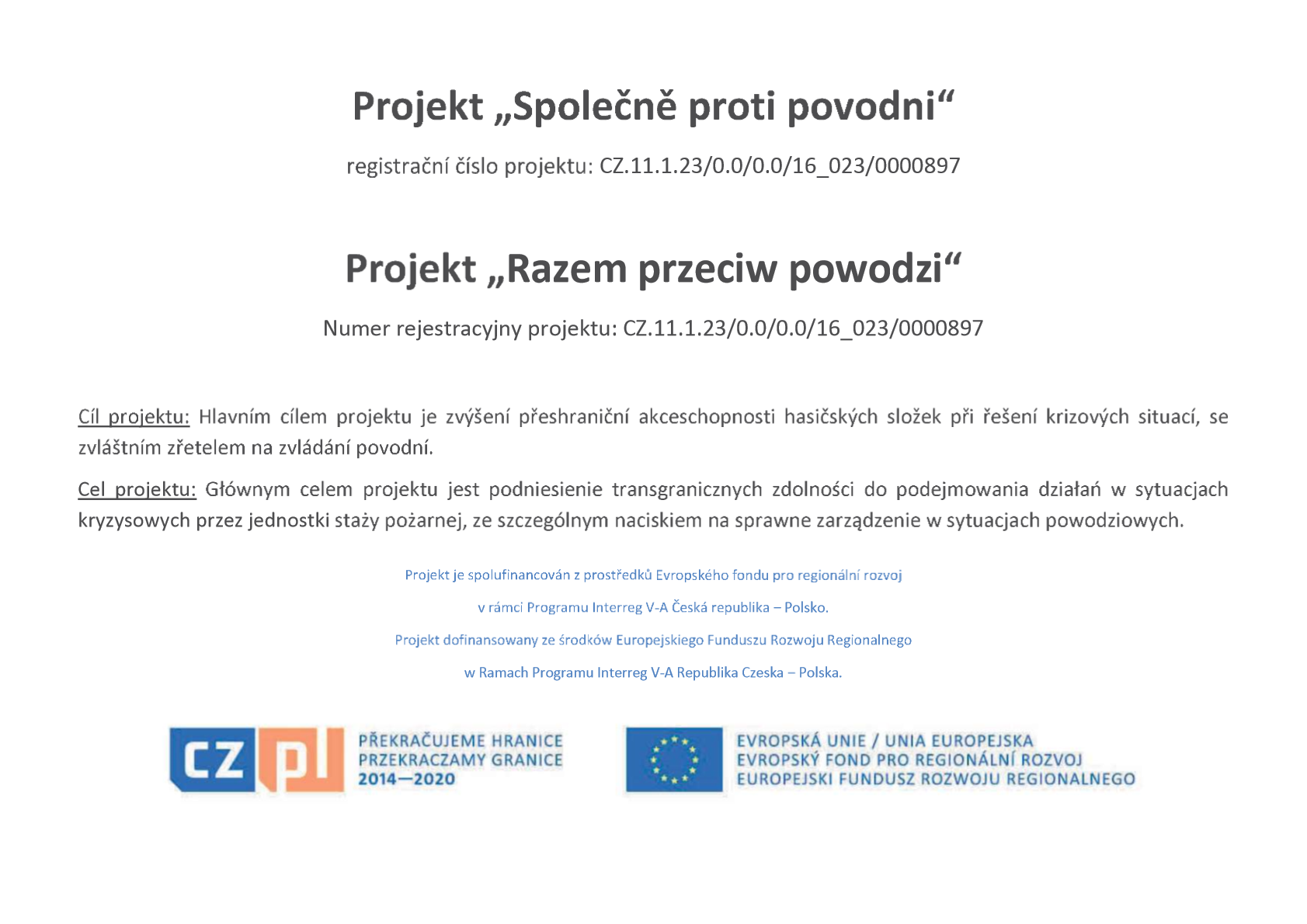 Informujemy, że KM PSP w Jastrzębiu-Zdroju jest beneficjentem projektu „Razem przeciw powodzi“ dofinansowanego ze środków Europejskiego Funduszu Rozwoju Regionalnego w Ramach Programu Interreg V-A Republika Czeska – Polska. Realizacja projektu rodbywała się od 1 stycznia 2018 roku do 30 czerwca 2019 roku.