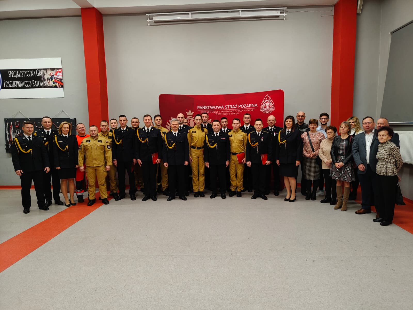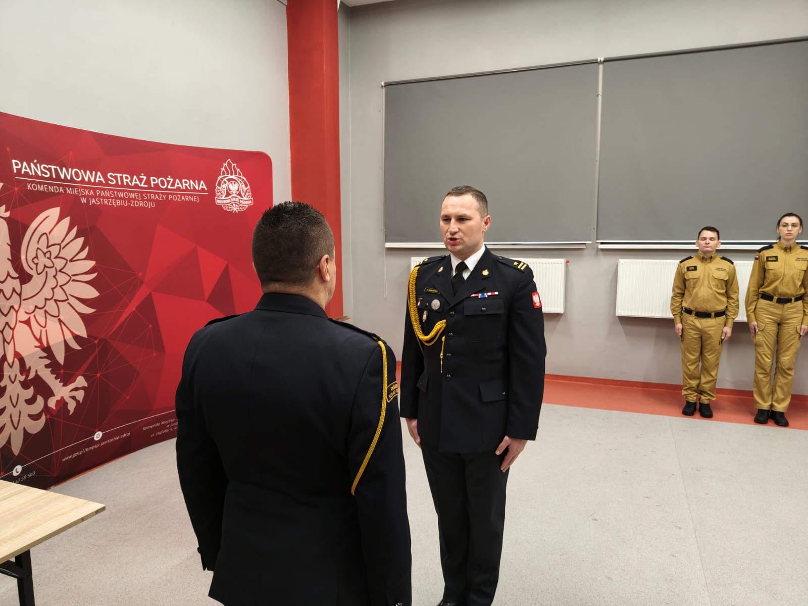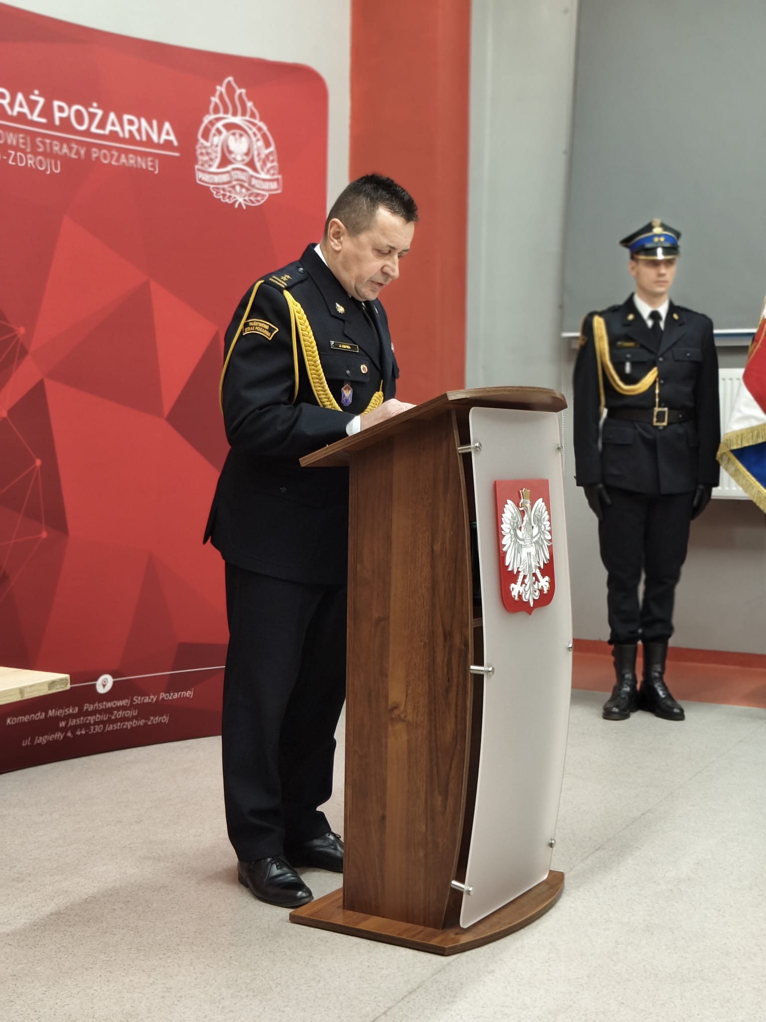 Uroczystość rozpoczęła się od złożenia meldunku przez mł. bryg. Piotra Markiewicza Komendantowi Miejskiemu PSP w Jastrzębiu-Zdroju, bryg. Janowi Cepielowi. W zbiórce uczestniczyła kadra kierownicza oraz funkcjonariusze Komendy, a jej rangę podkreślała obecność pocztu sztandarowego.