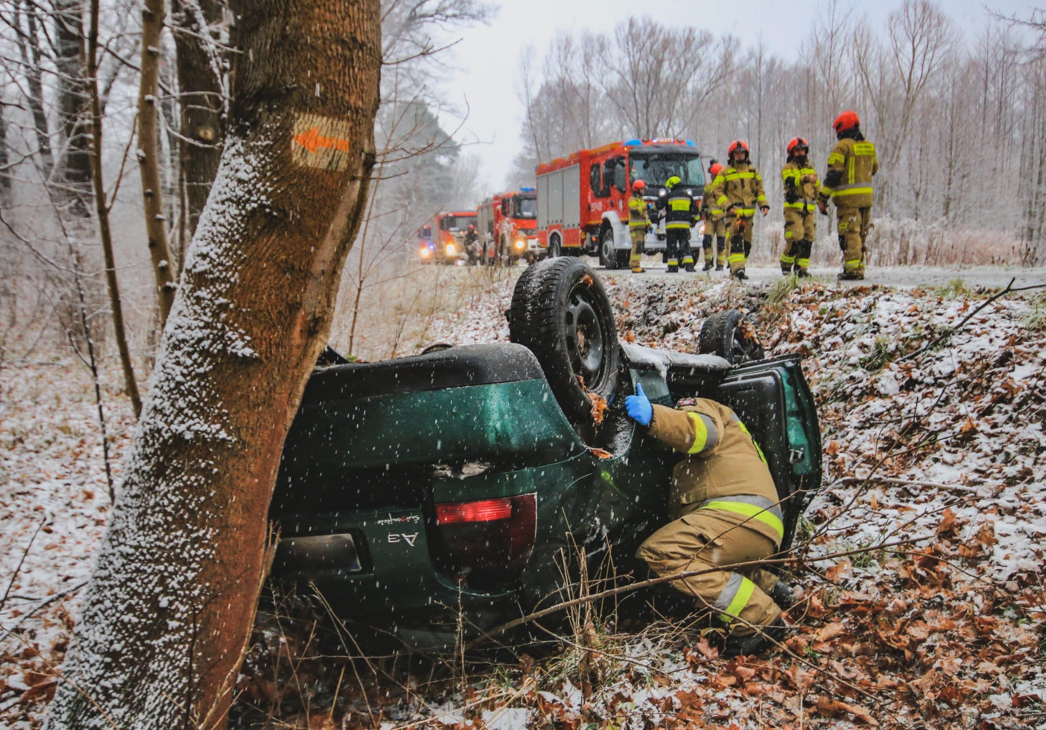 Po przyjeździe na miejsce działań kierujący działaniem ratowniczym potwierdził, że samochód osobowy marki audi znajduje się na dachu poza drogą.