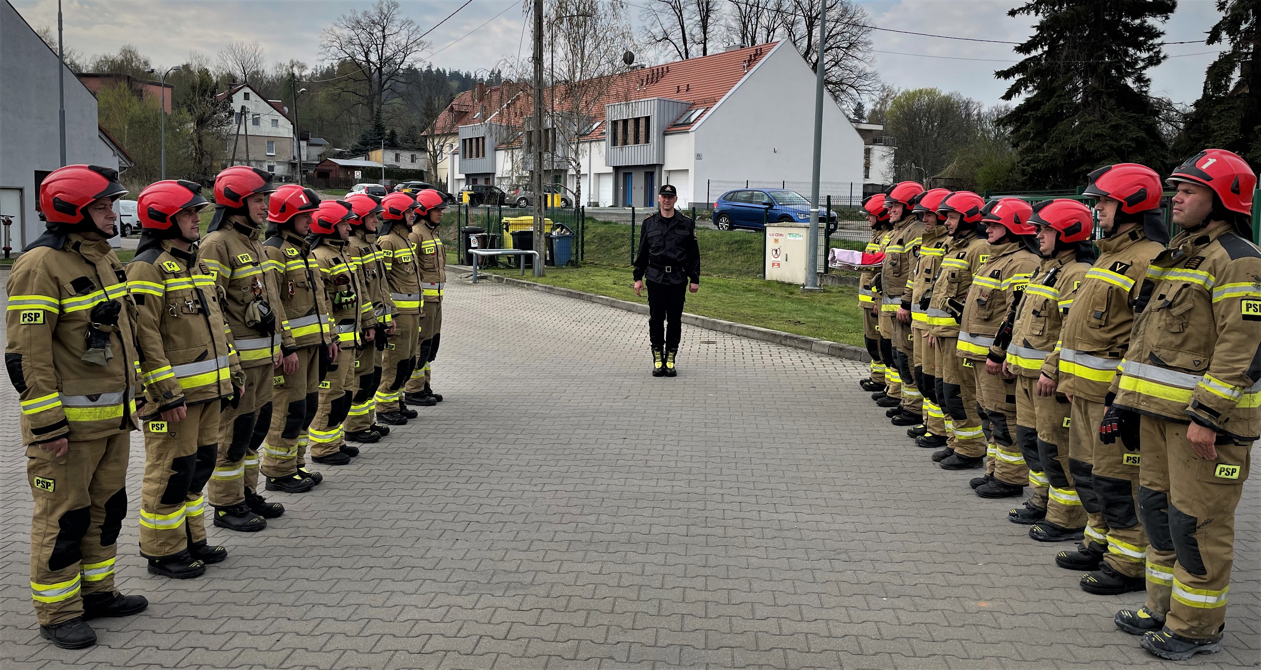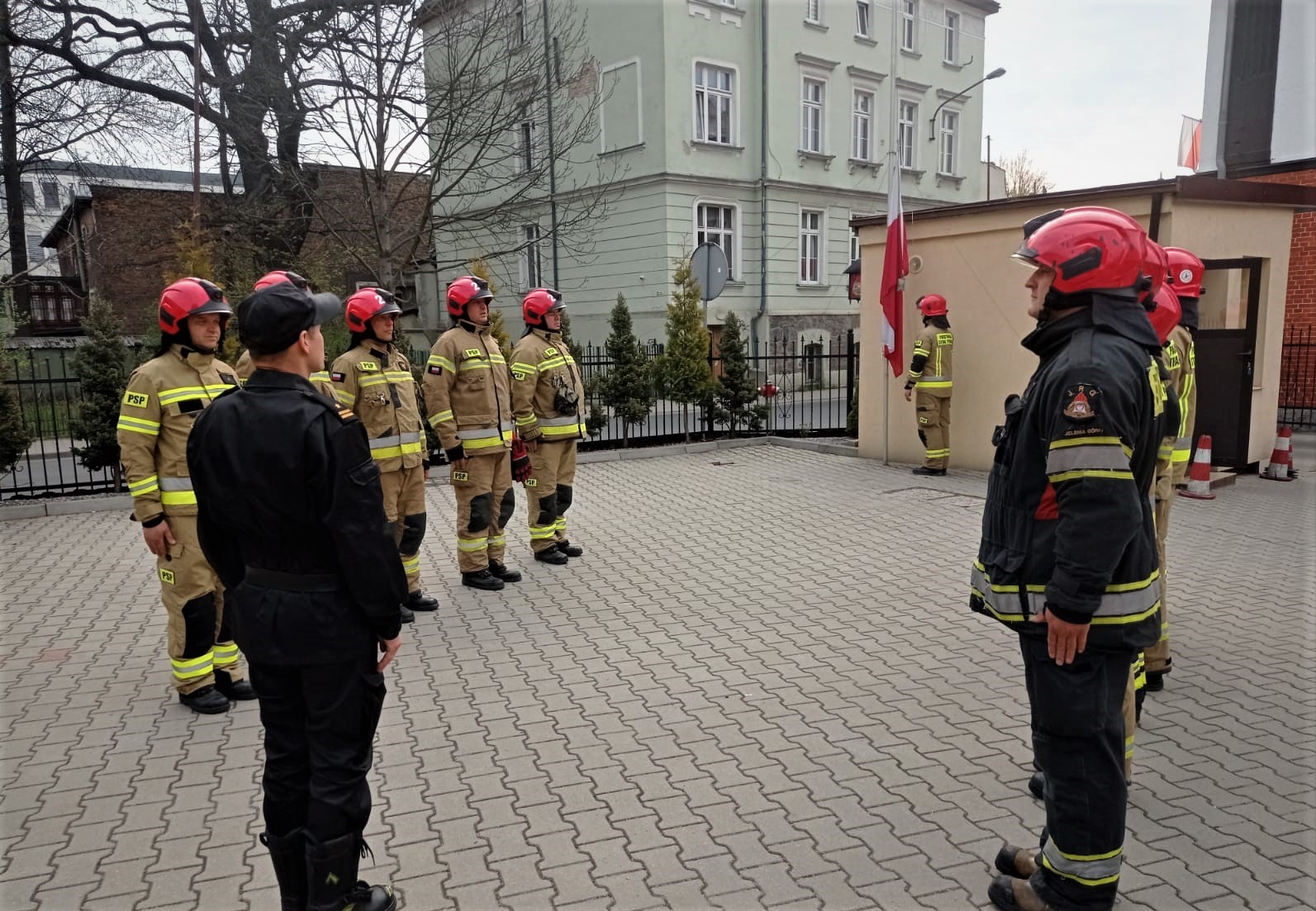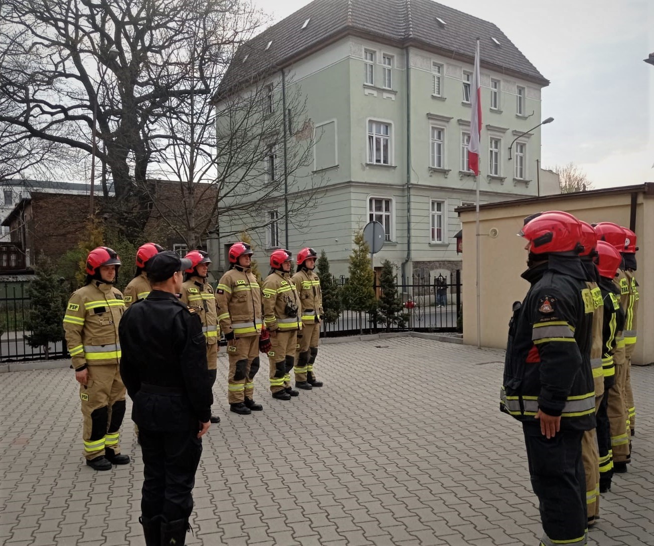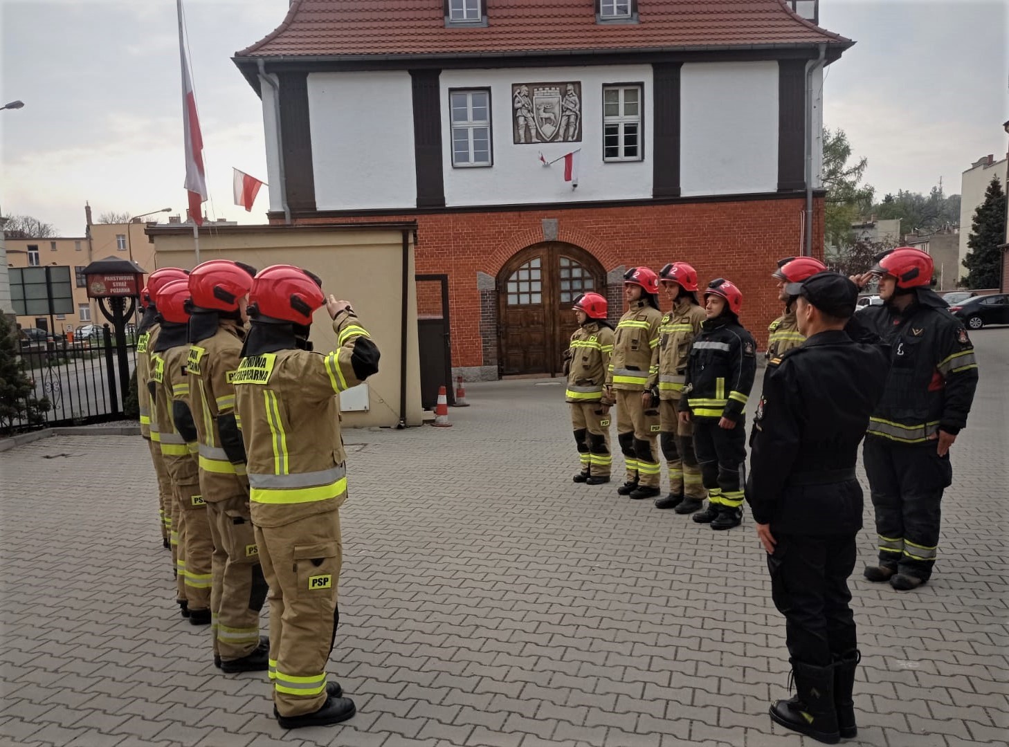Uroczysta zmiana służby w Komendzie Miejskiej PSP w Jeleniej Górze z okazji Dnia Flagi Państwowej.