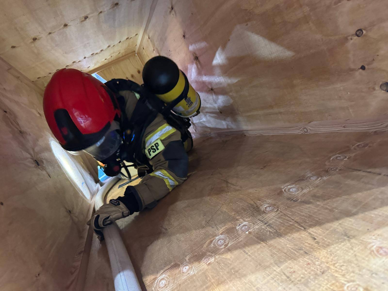 wejście do pomieszczenia imitującego garaż podziemny z zasłoniętymi maskami w podpiętych AOUO i odnalezienie poszkodowanego ratownika (80kg + AOUO)