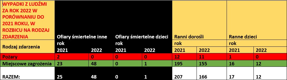 Wypadki z ludźmi w 2022 roku w porównaniu do 2021 roku, w rozbiciu na rodzaj zdarzenia