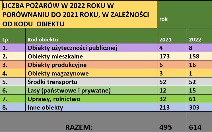 Liczba Pożarów i Miejscowych Zagrożeń w 2022 roku w porównaniu do 2021 roku, w zależności od kodu obiektu