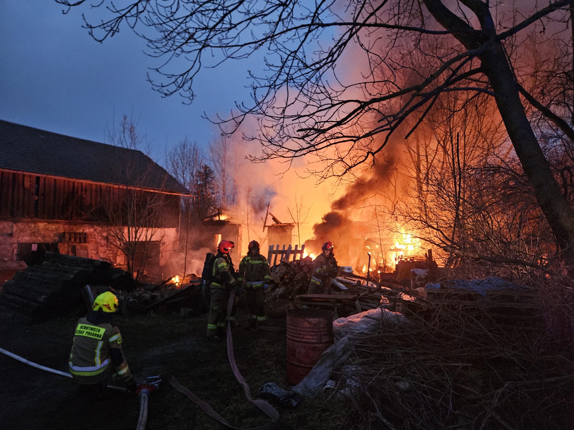 Po przybyciu na miejsce zdarzenia zastano pożar drewnianej stodoły (obiekt w całości objęty pożarem) oraz pożar fragmentu elewacji i dachu budynku oddalonego o 3 m od stodoły,