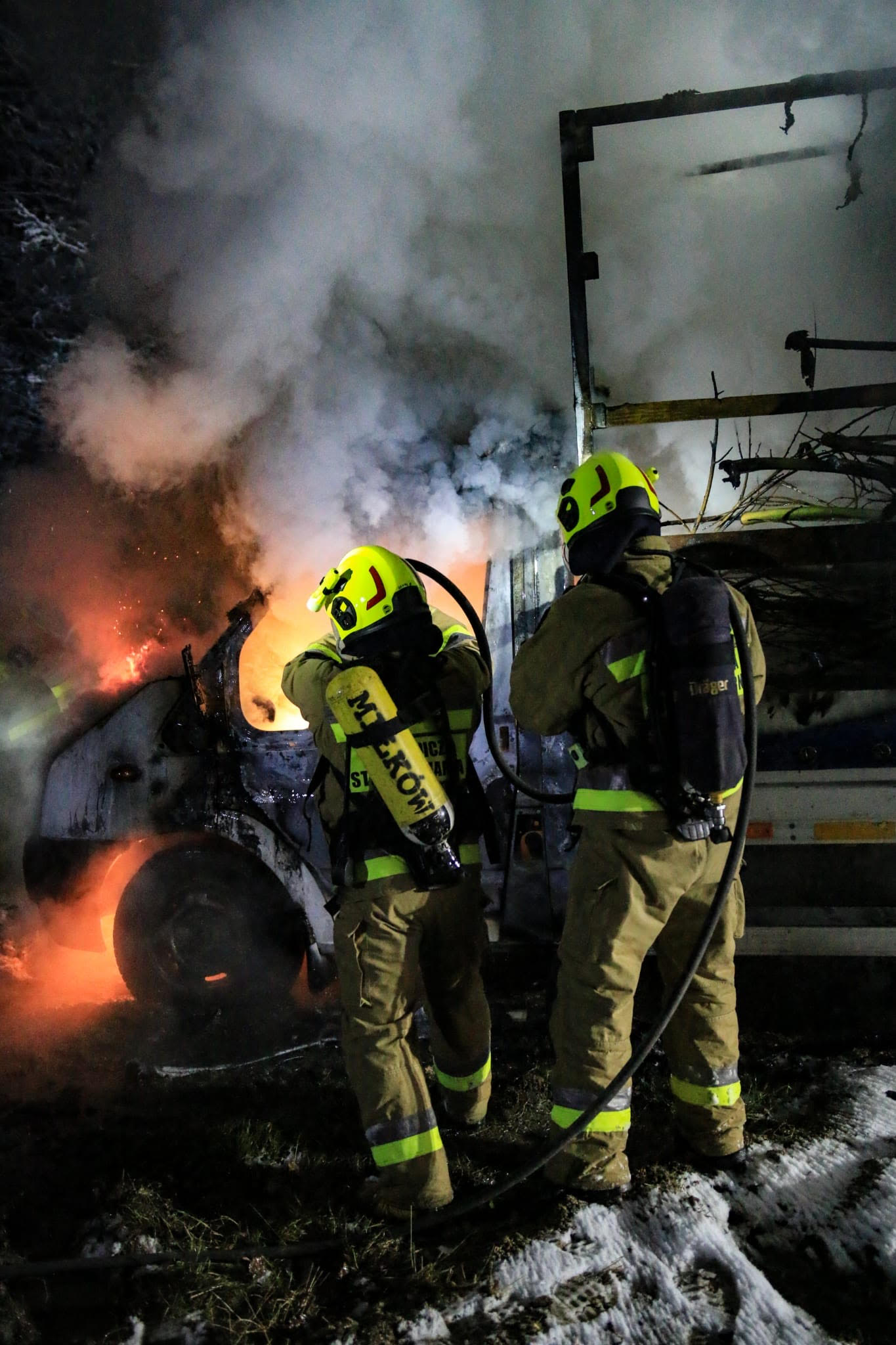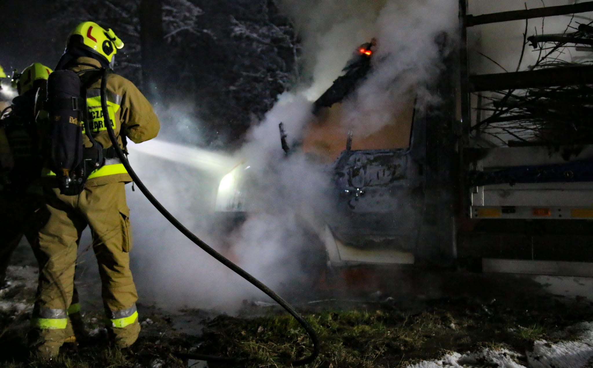 Po przyjeździe na miejsce zdarzenia kierujący działaniami potwierdził pożar samochodu dostawczego marki Ford Transit. Kabina samochód dostawczego w całości objęta była ogniem. Po rozpoznaniu sytuacji strażacy zabezpieczyli miejsce zdarzenia, podali jeden prąd wody w natarciu aby ugasić palący się samochód.