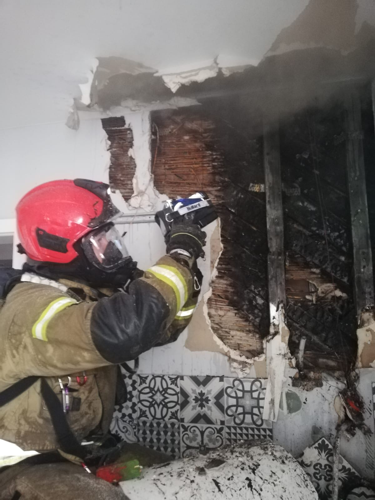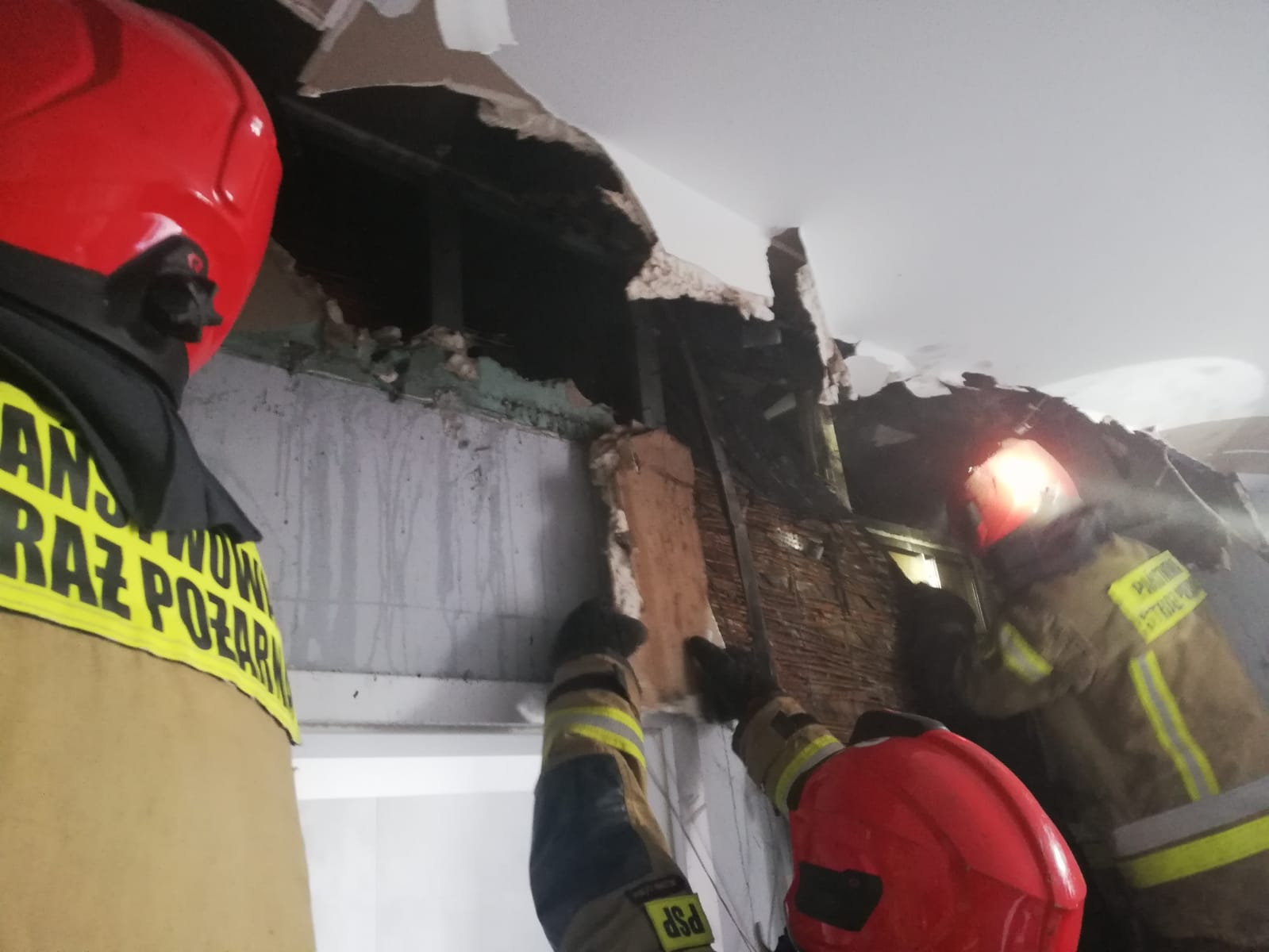 Po zabezpieczeniu miejsca zdarzenia, wyłączeniu zasilania w energię elektryczną w mieszkaniu i przeprowadzonym rozpoznaniu ustalono, że pali się ścianka działowa pomiędzy pokojem (pomieszczenie mieszkalne z częścią kuchenną) a łazienką oraz strop. Pożar ukryty wewnątrz za konstrukcją z płyt gipsowo - kartonowych, ogień wydobywał się tylko przez otwór gniazdka.