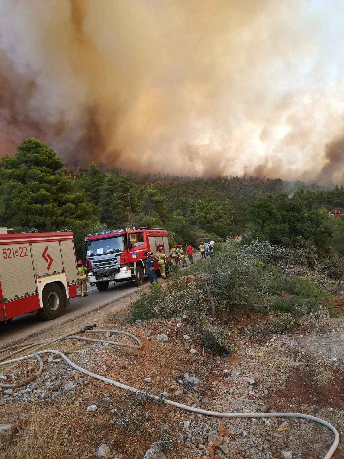 Działania gaśnicze w m. Vilia: zgodnie z informacją przekazaną przez dowództwo modułu GFFFV Poland, w środę nasi strażacy pracowali w pięciu sektorach równolegle. Co należy podkreślić, ostatni sektor uruchomiony został interwencyjnie ze względu na dynamiczną zmianę sytuacji pożarowej w okolicach m. Vilia, do której niebezpiecznie szybko zaczął się zbliżać front pożaru. Na prośbę greckich służb, wszystkie dostępne w Bazie Operacji zastępy PSP, które odtwarzały gotowość bojową po wcześniejszych działaniach, zostały natychmiast zadysponowane. Polakom postawiono dwa zadania: obronić przed żywiołem m. Vilia oraz zapewnić wodę do zbiorników, z których tankowały się śmigłowce gaśnicze. Polscy strażacy utworzyli ostatnią linię obrony miasta na długości ok. 3 km. Dzięki ogromnemu zaangażowaniu i poświęceniu, po wielogodzinnej walce do późnych godzin nocnych, miasto oraz jego mieszkańców udało się uratować.