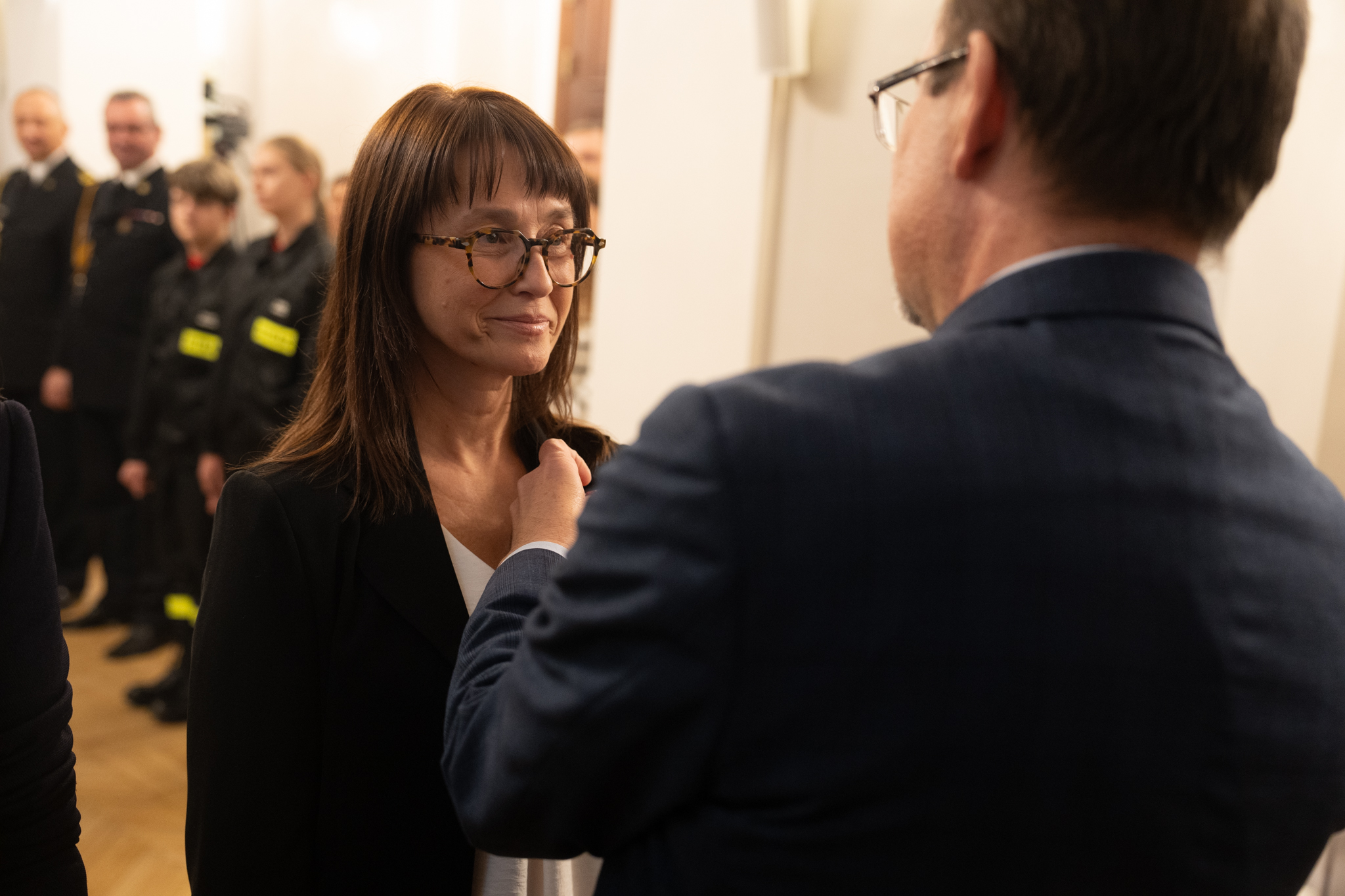 Pani Edycie Kluczyńskiej, Dyrektor Wydziału Zarządzania Kryzysowego i Spraw Obronnych w Starostwie Powiatowym w Jeleniej Górze. Pani Dyrektor na co dzień wspiera KM PSP w Jeleniej Górze nie tylko przy działaniach ratowniczych, ale także w sprawach szkoleniowych i organizacyjnych.