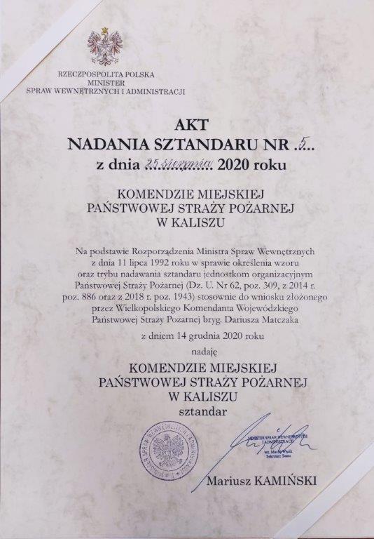 Komenda Miejska Państwowej Straży Pożarnej w Kaliszu z wielką satysfakcją i radością chce poinformować, iż jesteśmy już w posiadaniu nowego sztandaru oraz aktu jego nadania. Związane jest to z obchodzonym w 2020 roku jubileuszem 75-lecia powstania zawodowej straży pożarnej w Kaliszu.
