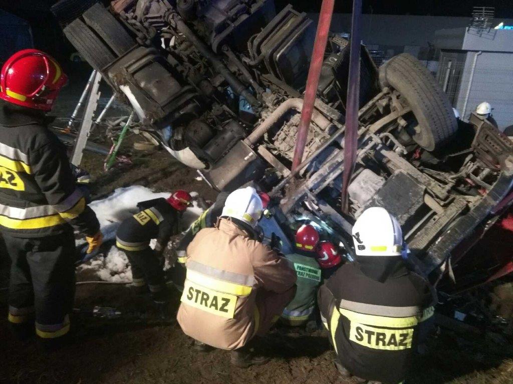 Działania straży pożarnej w pierwszej fazie polegały na zabezpieczeniu miejsca zdarzenia, stabilizacji pojazdu przy użyciu podpór mechanicznych, drabiny, klinów, podkładów stabilizacyjnych oraz przygodnego sprzętu. Zabezpieczono wyciek paliwa poprzez podstawienie beczki pod zbiornik z którego wyciekało paliwo, a następnie podano prąd piany ciężkiej wokół wycieku. Równocześnie podjęto próbę wydobycia osoby zakleszczonej z pojazdu poprzez podkopanie się pod fotel kierowcy oraz podniesienie naprężonych elementów konstrukcji kabiny przy użyciu sprzętu hydraulicznego. Ze względu na wyczerpanie możliwości technicznych obecnych na miejscu zdarzenia zastępów na polecenie dowódcy na miejsce zdarzenia zadysponowano SGRT „TECHNIKA”. Podczas działań prowadzonych przez strażaków ratownicy medyczni cały czas sprawowali opiekę nad osobą poszkodowaną. Przybyła na miejsce grupa techniczna dodatkowo ustabilizowała pojazd przy użyciu podnośnika HDS oraz wysięgnika będącego na wyposażeniu SCRT MEGA CITY. Dalsze działania miały na celu wycinanie fragmentów karoserii, deski rozdzielczej. Po około 2,5 godziny i współpracy ratowników osoba została wydobyta z pojazdu i zabrana przez ZRM do szpitala.