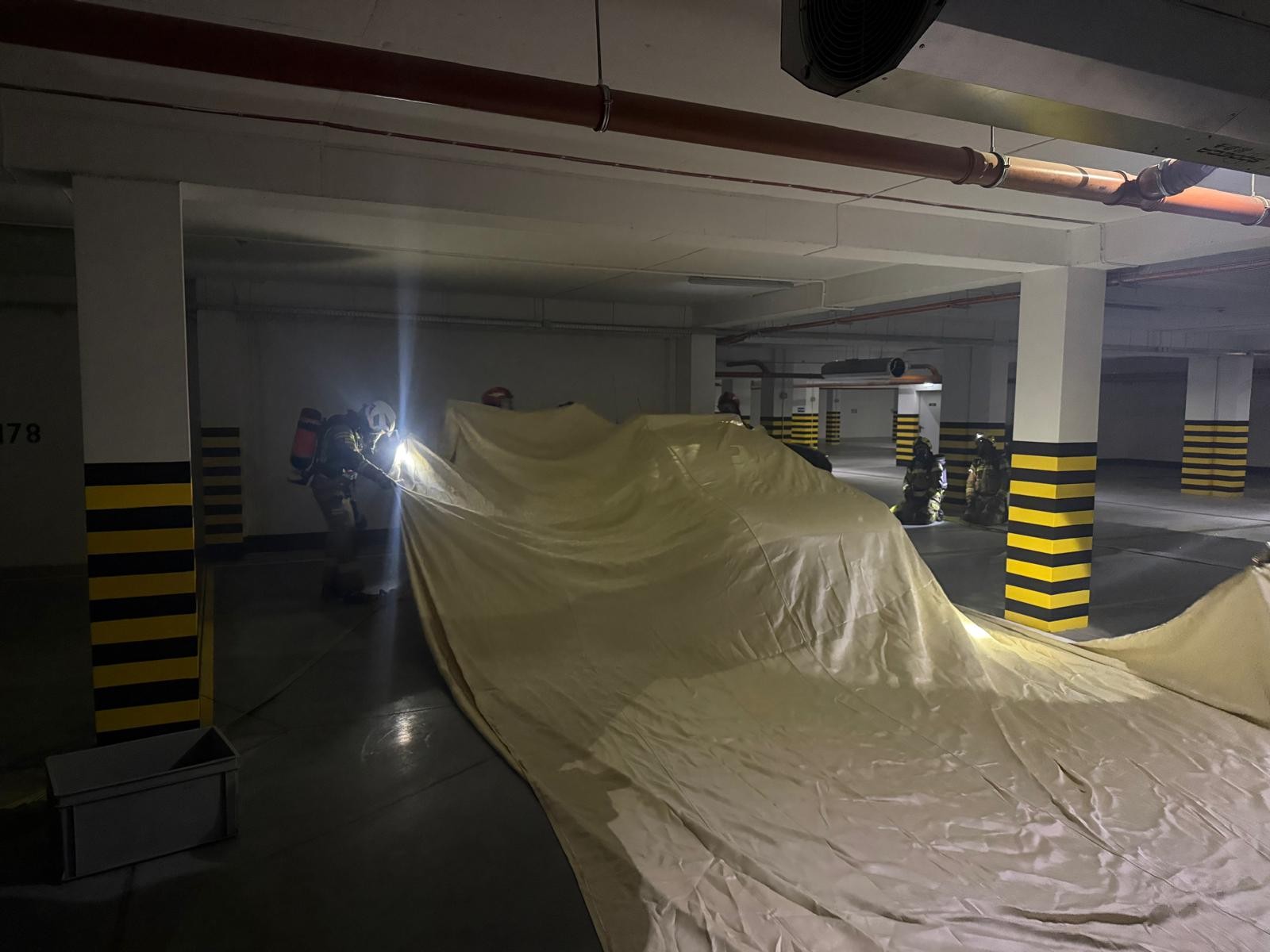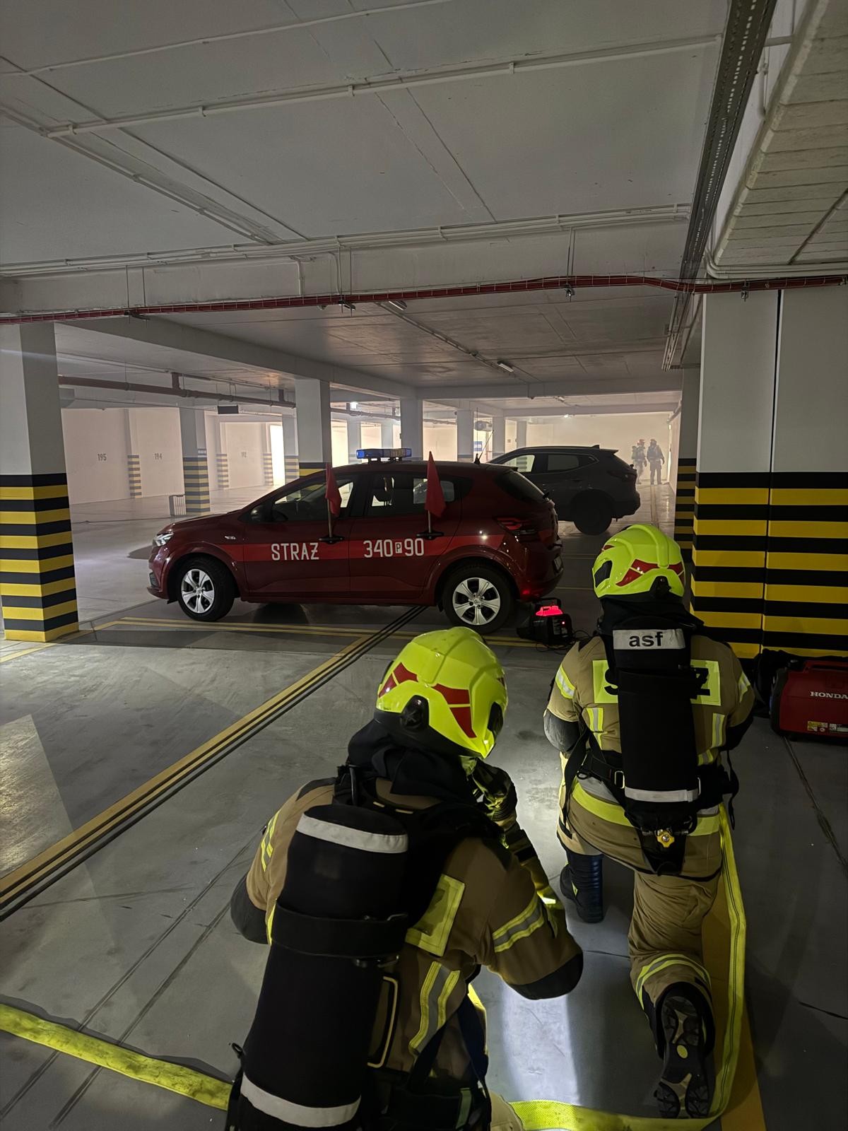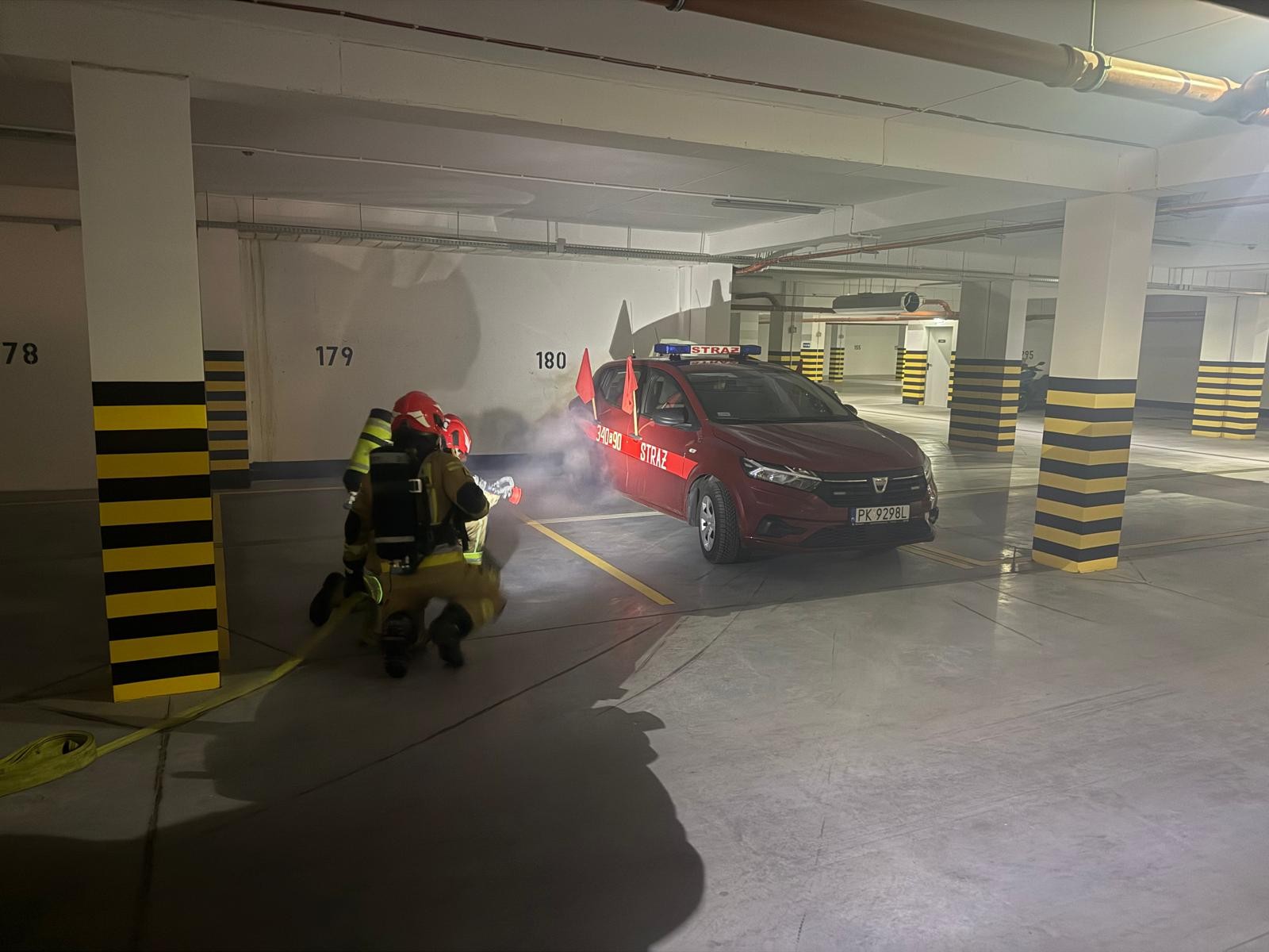 Ćwiczenia dotyczące pożaru auta elektrycznego w garażu podziemnym
