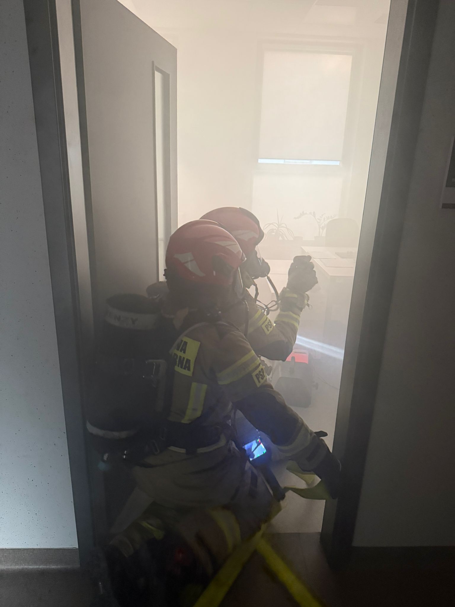 Po przybyciu na miejsce pierwszych zastępów, Kierujący Działaniem Ratowniczym (KDR) potwierdził rozwinięty pożar obejmujący pomieszczenia biurowe. Podjęto decyzję o zbudowaniu zaopatrzenia wodnego w oparciu o samochód gaśniczy (GCBA) oraz sieć hydrantową, a rota ratownicza wprowadziła prąd wody w natarciu do wnętrza obiektu.