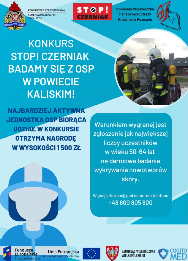 Konkurs dotyczy bezpłatnego badania videodermatoskopem pod kątem wykrywania nowotworów skóry. Badania przeznaczone są dla strażaków ochotników OSP oraz ich rodzin, znajomych i sąsiadów w grupie wiekowej 50-64 lata. Ponadto najbardziej aktywna jednostka OSP biorąca udział w konkursie otrzyma nagrodę w wysokości 1 500 zł na dowolne cele, związane z działalnością jednostki. Nagroda ta zostanie przekazana jednostce OSP przez Wielkopolskiego Komendanta Wojewódzkiego PSP w dniu 26 maja 2023 r. podczas powiatowych obchodów Dnia Strażaka w Kaliszu. Wszystkie osoby zainteresowane udziałem w konkursie prosimy zgłaszać telefonicznie pod numerem 800 805 600. Pierwsze badania będą wykonywane w Komendzie Miejskiej PSP w Kaliszu (ul. Nowy Świat 40-42) w terminach 1, 2, 23 kwietnia 2023 r. w godzinach od 10:00 do 18:00.