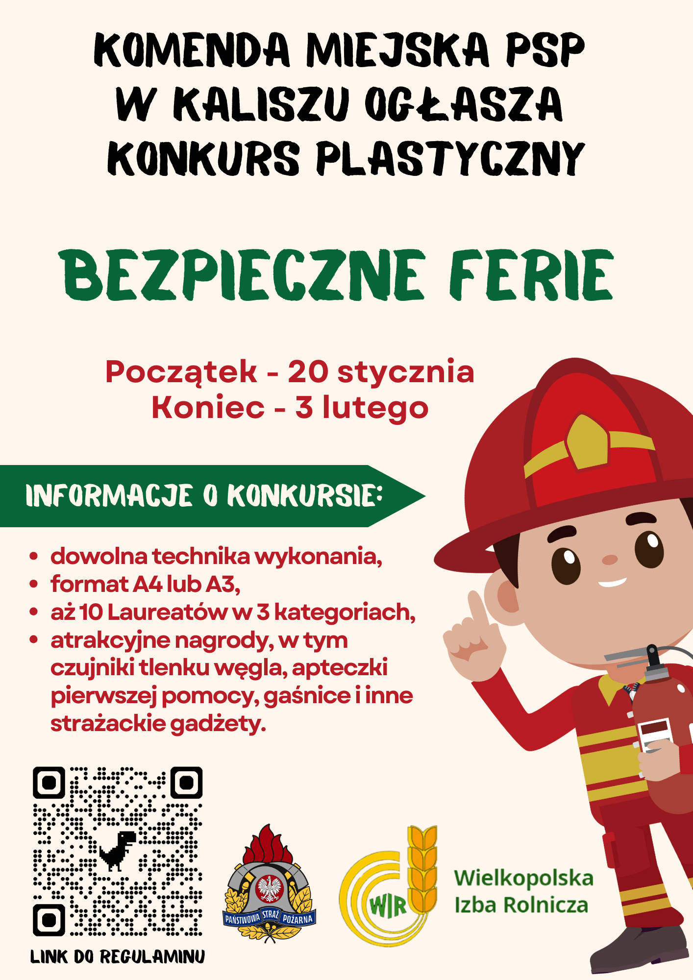 Komenda Miejska Państwowej Straży Pożarnej w Kaliszu ogłasza dwa konkursy w okresie ferii zimowych dla mieszkańców Kalisza i powiatu kaliskiego: