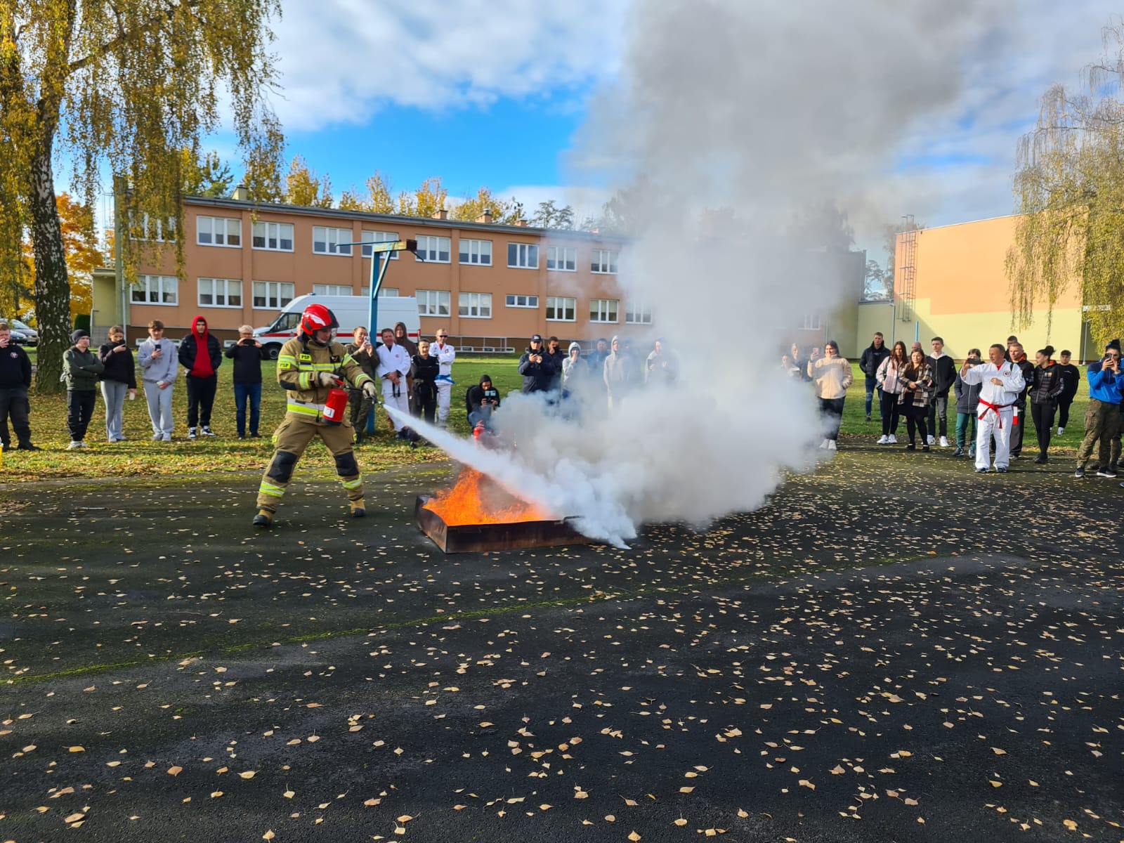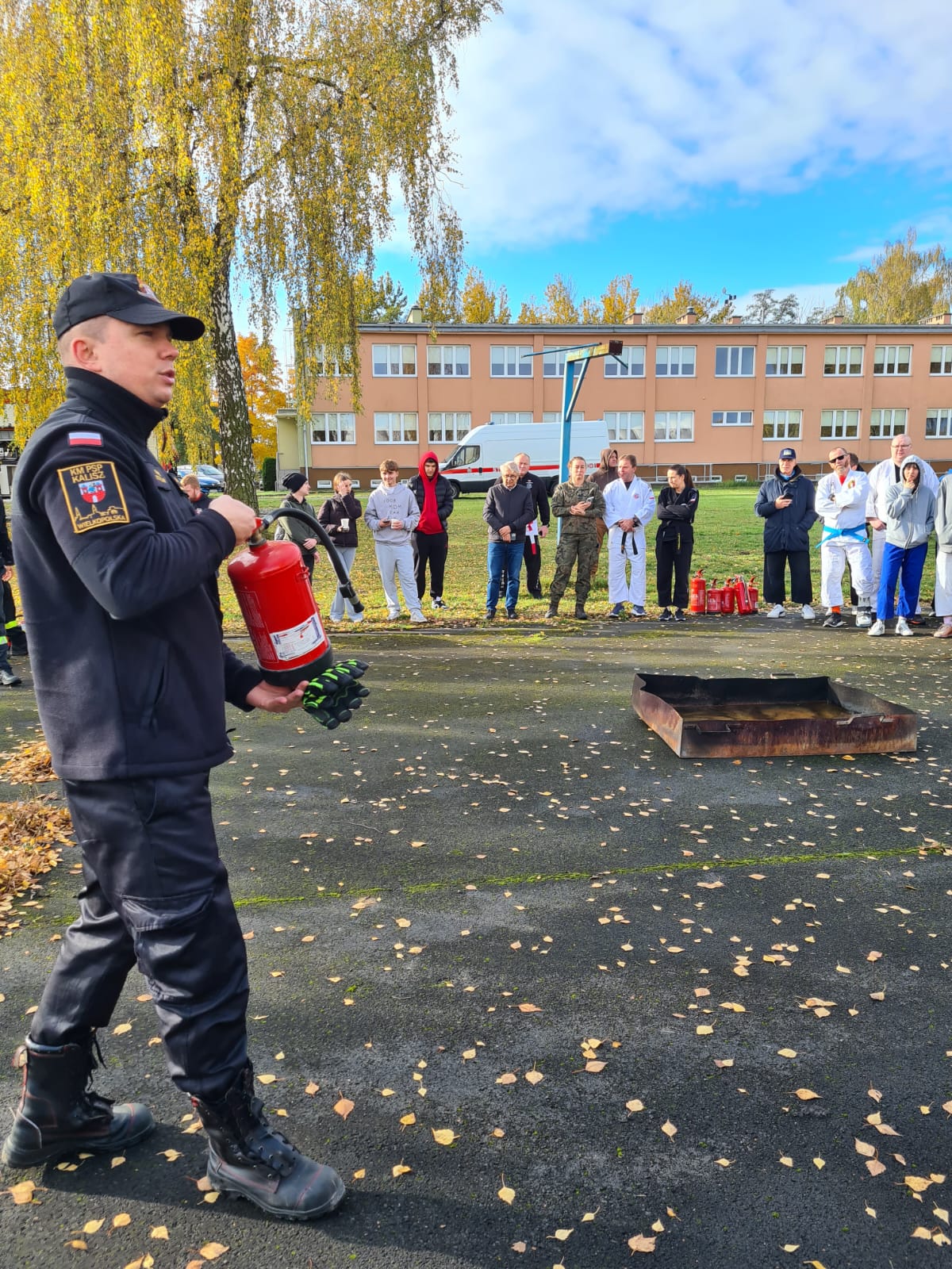 25.10.2025r. na terenie Uniwersytetu Kaliskiego im. Prezydenta Stanisława Wojciechowskiego podczas Międzynarodowych Warsztatów Naukowych Technik Interwencyjnych i Samoobrony strażacy z KM PSP w Kaliszu przeprowadzili warsztaty poświęcone praktycznym aspektom używania gaśnic oraz zasadom postępowania w przypadku wybuchu pożaru.