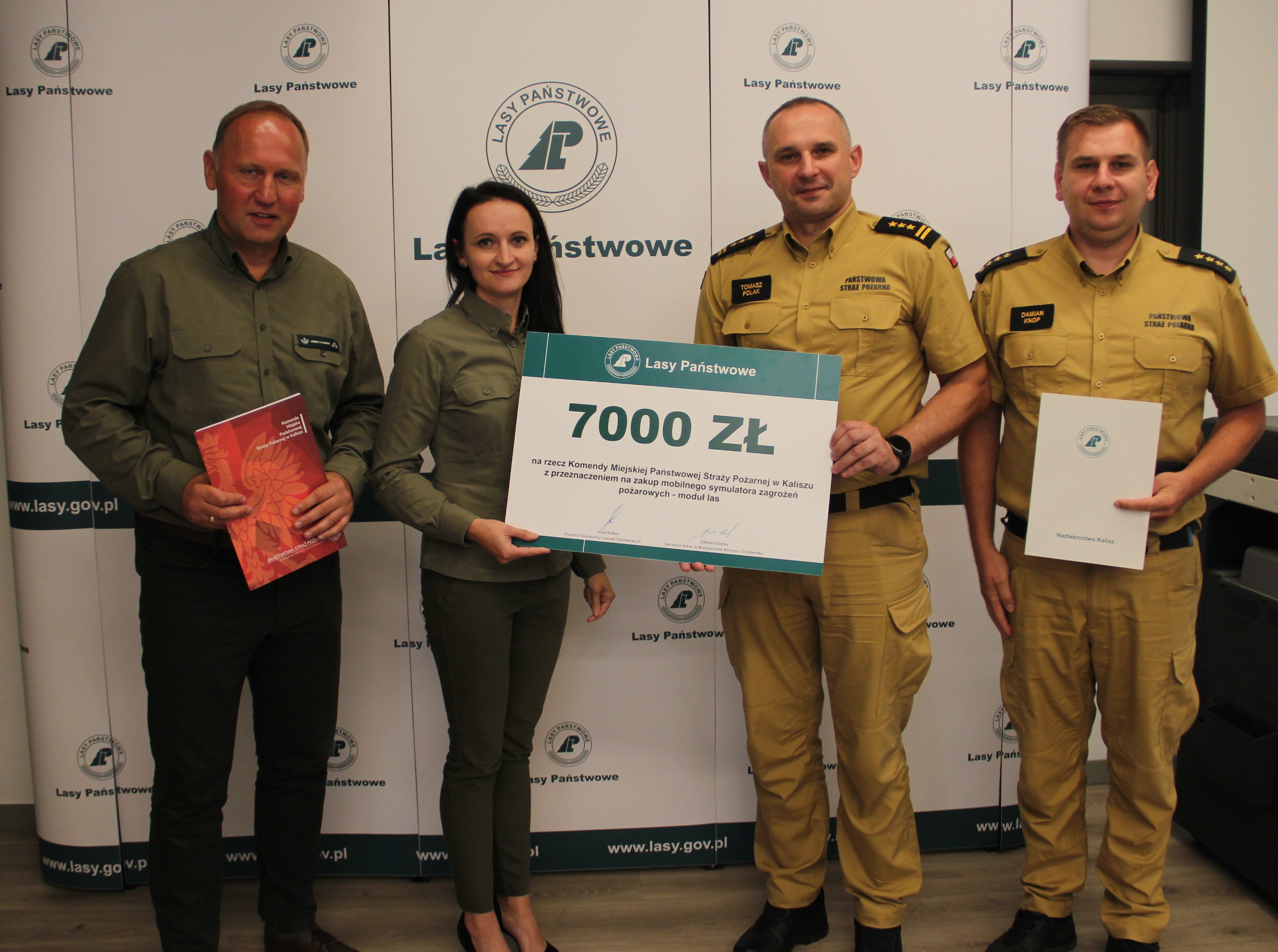W dniu 28 sierpnia 2023 roku w siedzibie Nadleśnictwa Kalisz podpisano umowę na przekazanie darowizny finansowej przez Lasy Państwowe, poprzez „Wojewódzki Fundusz Wsparcia Państwowej Straży Pożarnej” w kwocie 7000 zł dla Komendy Miejskiej Państwowej Straży Pożarnej w Kaliszu, z przeznaczeniem na dofinansowanie projektu p.n. „Zakup mobilnego symulatora zagrożeń pożarowych (moduł lasu), niezbędnej infrastruktury technicznej i multimedialnej do celów edukacji o właściwej gospodarce odpadami oraz pożarów traw i lasów”. Umowę podpisali Nadleśniczy Szymon Lis oraz Komendant Miejski Państwowej Straży Pożarnej w Kaliszu st. bryg Tomasz Polak w obecności Zastępcy Komendanta Miejskiego Państwowej Straży Pożarnej w Kaliszu st. kpt. Damiana Knopa. Najważniejszą funkcją symulatora jest dynamiczna prezentacja zagrożeń pożarowych i innych niebezpiecznych zdarzeń, jakie mogą mieć miejsce w lesie oraz na terenie otwartym. Sterowane przez komputery efekty świetlne, dźwiękowe oraz wydobywający się dym realnie oddają grozę sytuacji, pobudzając wyobraźnię widzów. To doskonałe narzędzie do edukacji w zakresie bezpieczeństwa pożarowego.