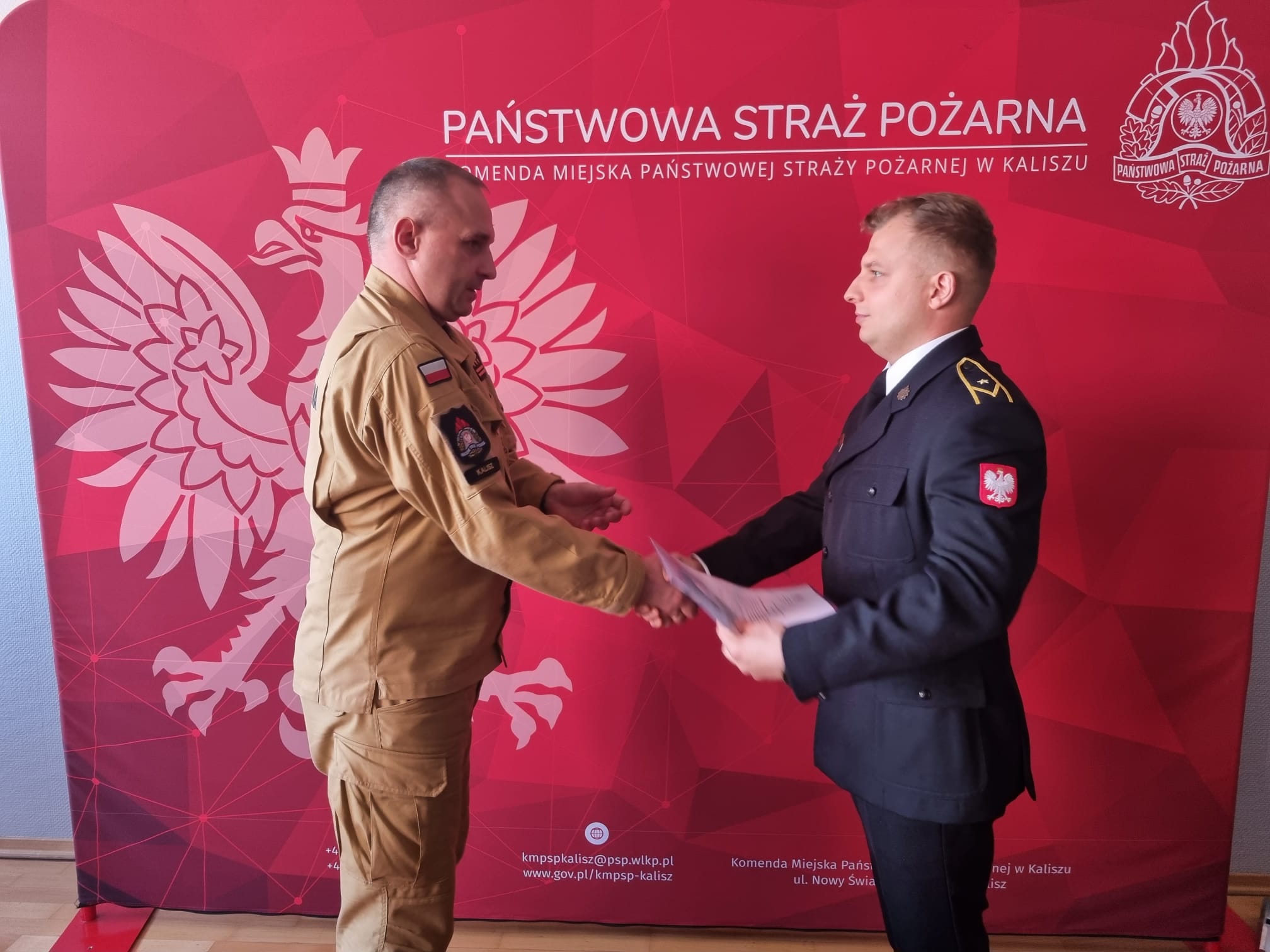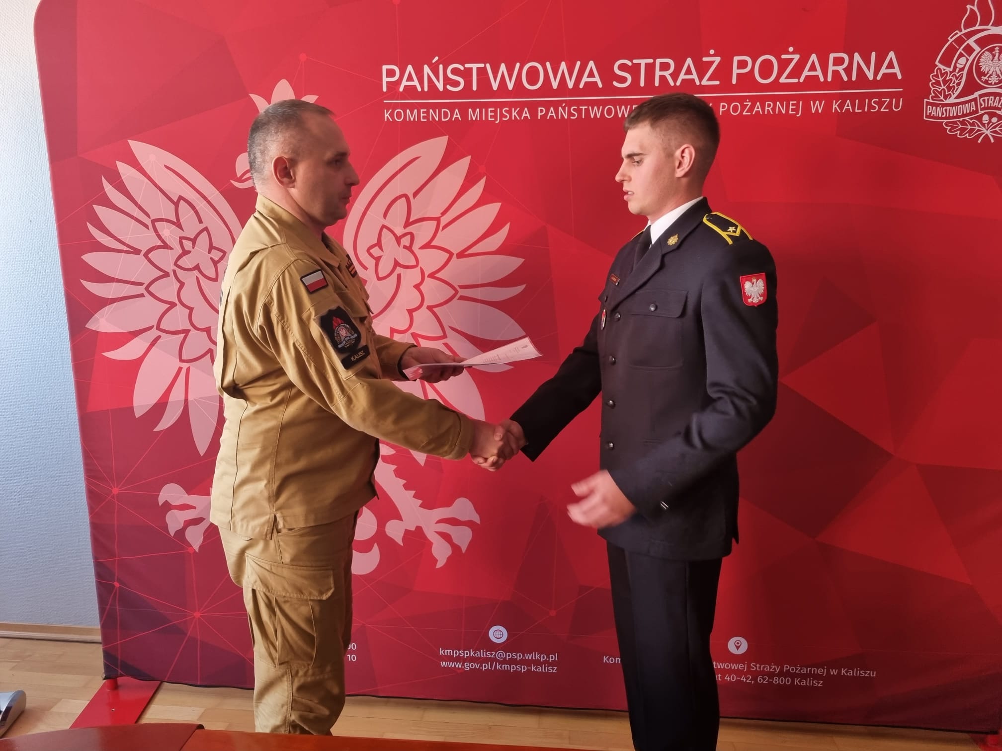 W dniu 22 września 2023 r. Komendant Miejski Państwowej Straży Pożarnej w Kaliszu st. bryg. Tomasz Polak przywitał dwóch absolwentów szkół pożarniczych, którzy zostali skierowani do służby w Komendzie Miejskiej Państwowej Straży Pożarnej w Kaliszu. Nowi funkcjonariusze to mł. asp. Adam Werner absolwent Szkoły Aspirantów PSP w Poznaniu oraz mł. asp. Krystian Kurzawa absolwent Centralnej Szkoły PSP w Częstochowie. Nowym funkcjonariuszom życzymy wielu sukcesów w życiu zawodowym i prywatnym, a także zadowolenia w nowym miejscu pełnienia służby.