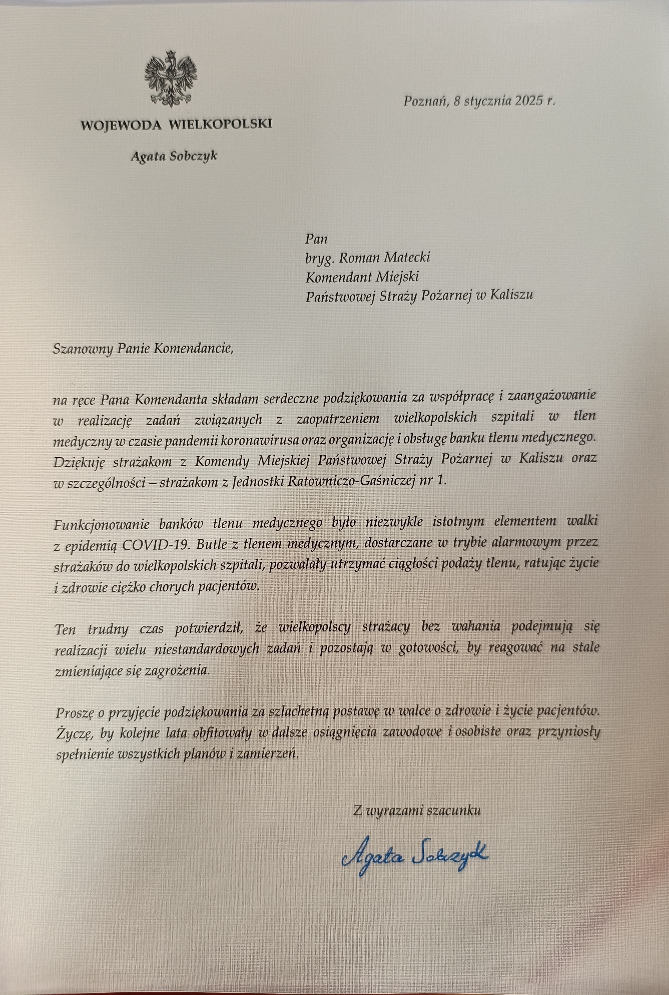 W dalszej części odprawy głos zabrali zaproszeni goście na czele z Zastępcą Wielkopolskiego Komendanta Wojewódzkiego PSP, st. bryg. Sławomirem Brandtem, dziękując za zaangażowanie oraz skuteczną i profesjonalną działalność w minionym roku. Na ręce Komendanta Miejskiego PSP w Kalisz bryg. Romana Mateckiego przekazano również pisemne podziękowania Wojewody Wielkopolskiego Pani Agaty Sobczyk, która podziękowała za współpracę i zaangażowanie w realizację zadań związanych z zaopatrzeniem wielkopolskich szpitali w tlen medyczny w czasie pandemii koronowirusa organizację i obsługę banku tlenu medycznego.