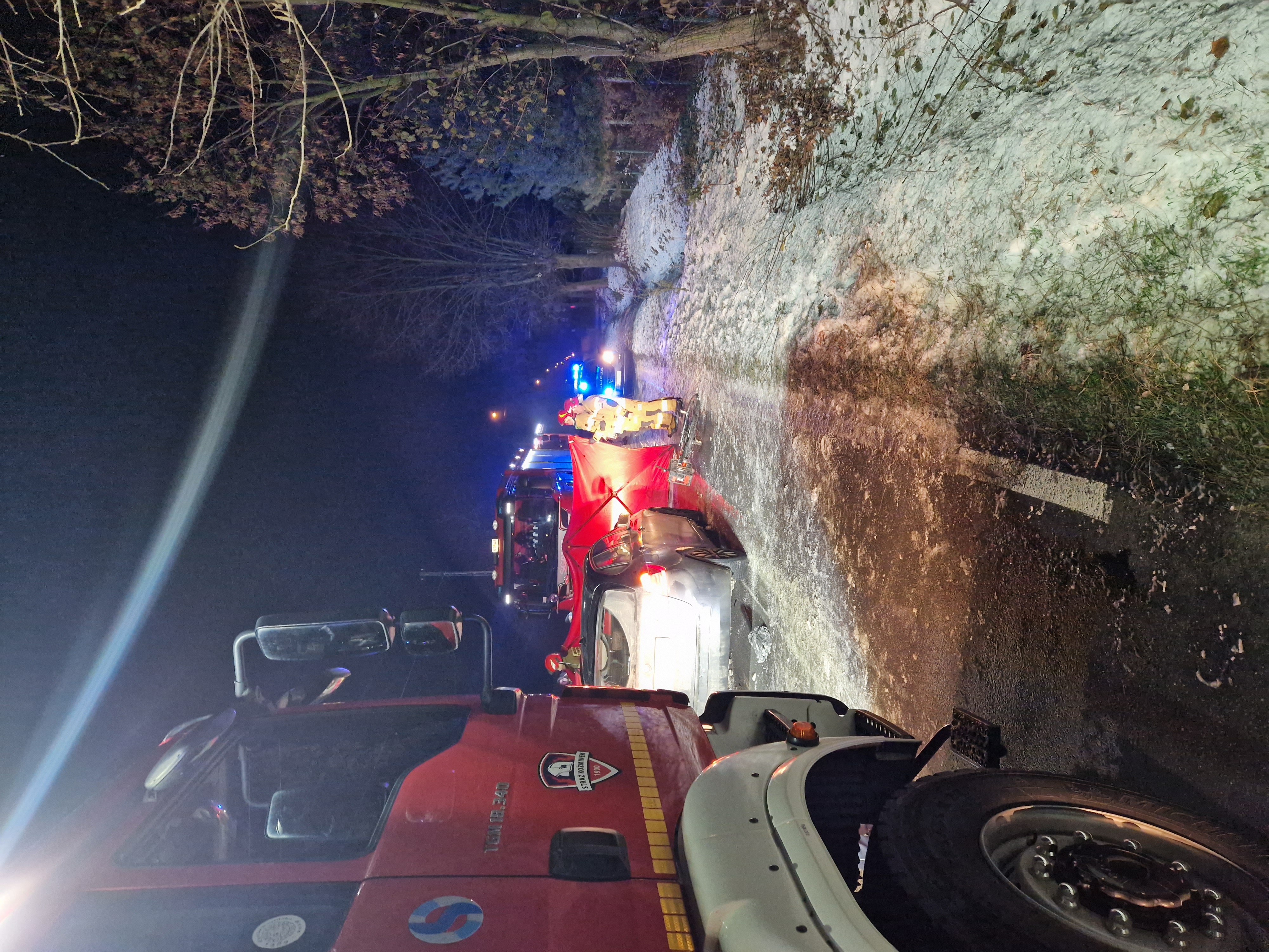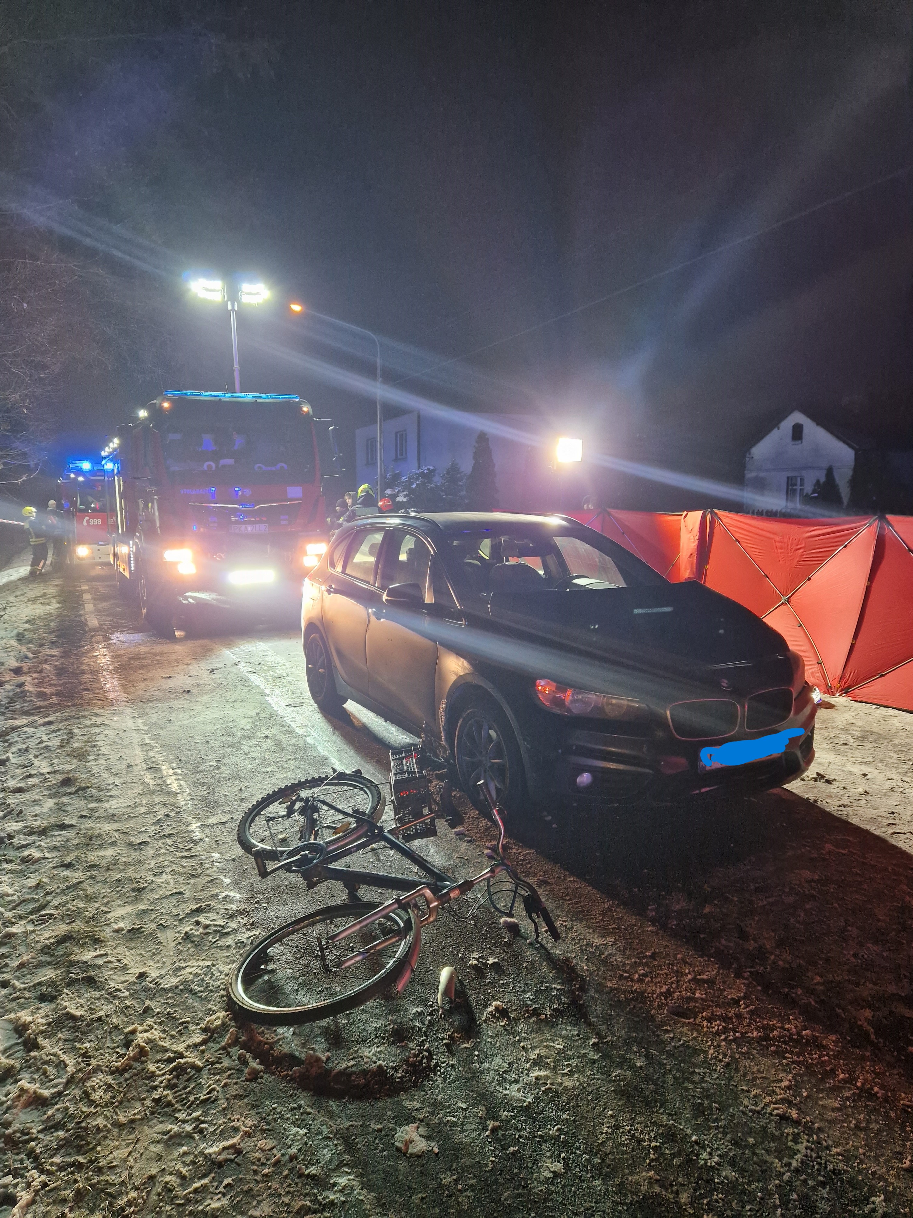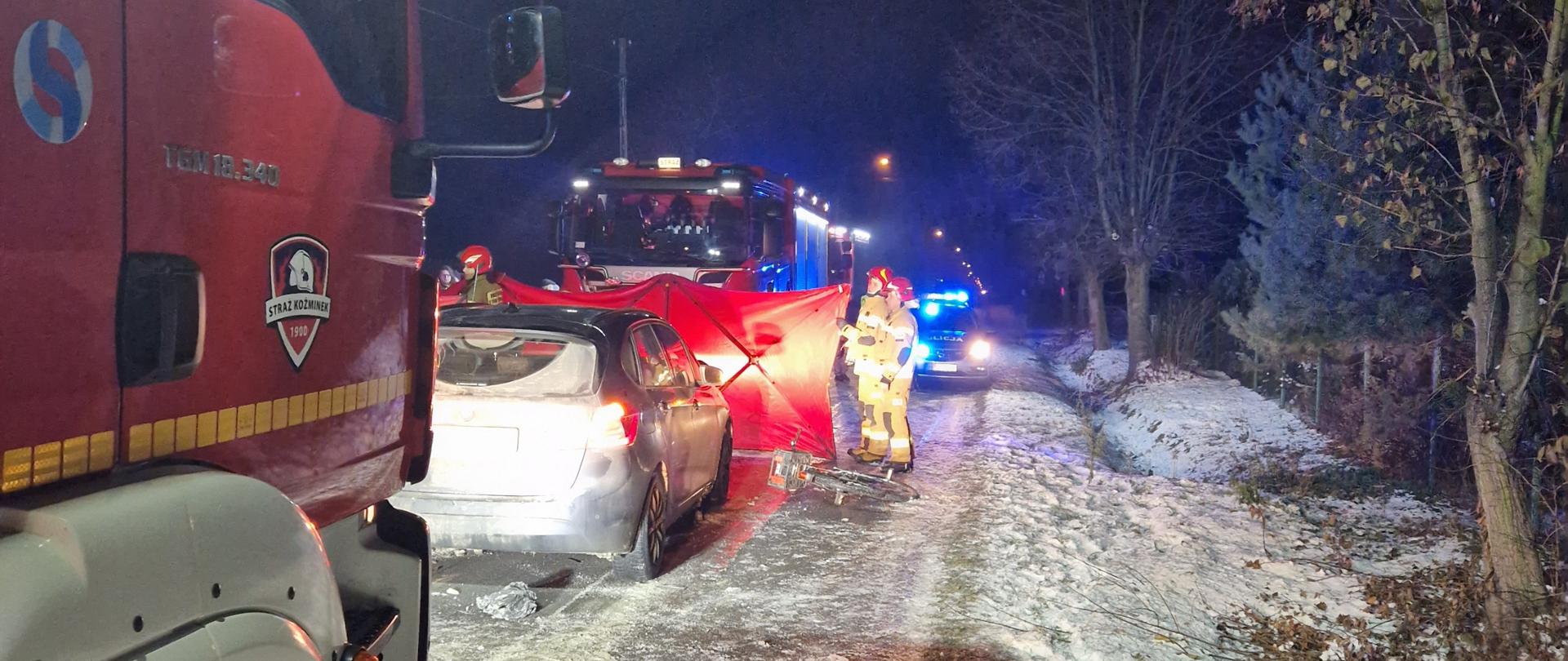 6.12.2023 r. o godz. 18.22 dyżurny SKKM w Kaliszu odebrał zgłoszenie o potrąceniu rowerzysty w miejscowości Stary Nakwasin przy numerze 6 w gm. Koźminek. Na miejsce zdarzenia z wcześniejszego pożaru sadzy w Koźminku zostały przedysponowane zastępy OSP Koźminek oraz zastęp GCBA z JRG 1 w Kaliszu. Dyżurny stanowiska kierowania wysłał również zastęp techniczny z JRG1 oraz Zespół Ratownictwa Medycznego i Policję. Przybyłe zastępy zastały na miejscu potrącenie rowerzysty, który znajdował się nieprzytomny pod pojazdem. Ratownicy podnieśli auto przy użyciu ratowniczego sprzętu pneumatycznego oraz hydraulicznego i wydobyli poszkodowanego spod pojazdu. Następnie podjęli resuscytację nieprzytomnego rowerzysty. Z powodu licznych obrażeń i nie przywrócenia czynności życiowych pomimo interwencji medycznych odstąpiono od dalszej reanimacji. Policja na czas prowadzonych działań i czynności zamknęła ruch na danym odcinku drogi przez ok. 4 godz. W zdarzeniu brało udział 10 strażaków KM PSP JRG 1 Kalisz oraz 12 strażaków z OSP Koźminek.