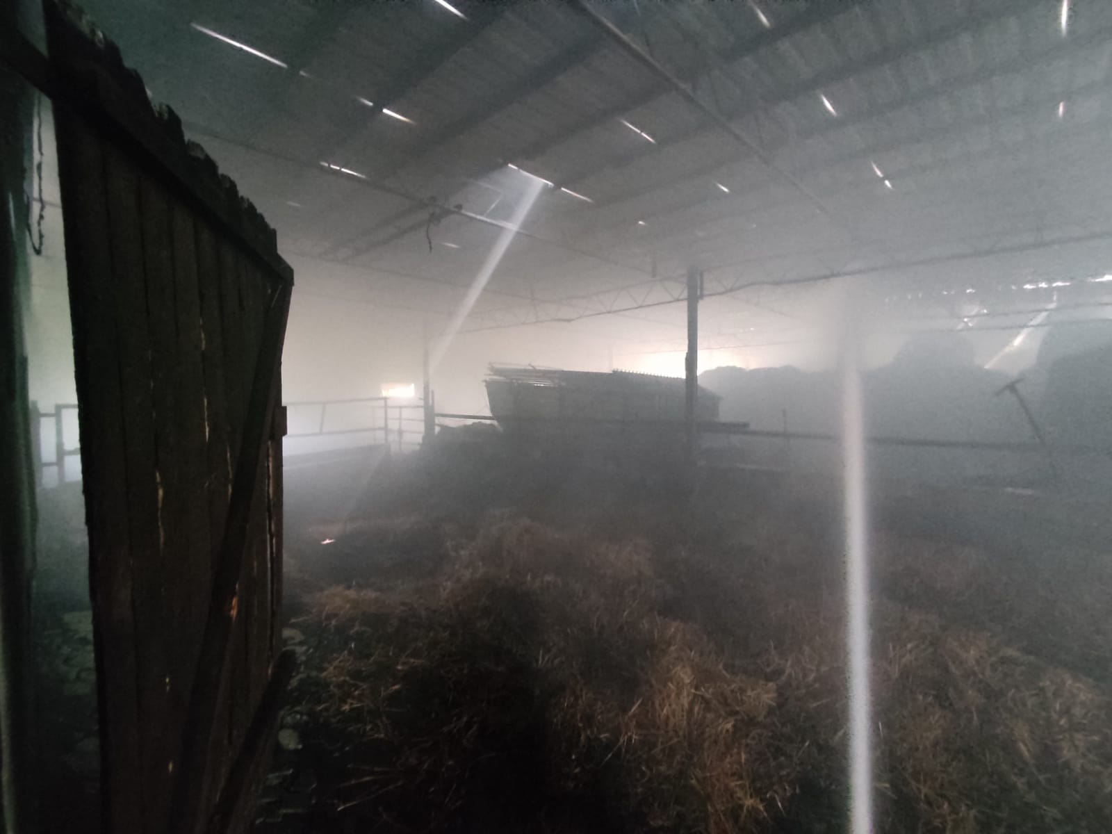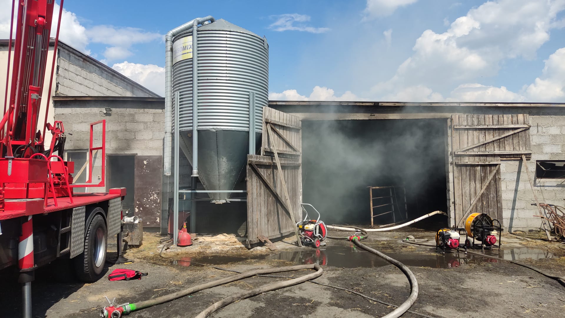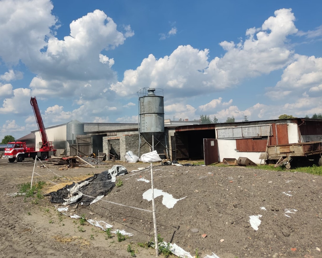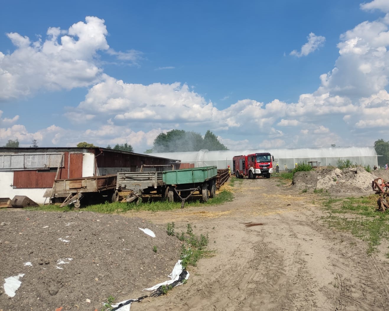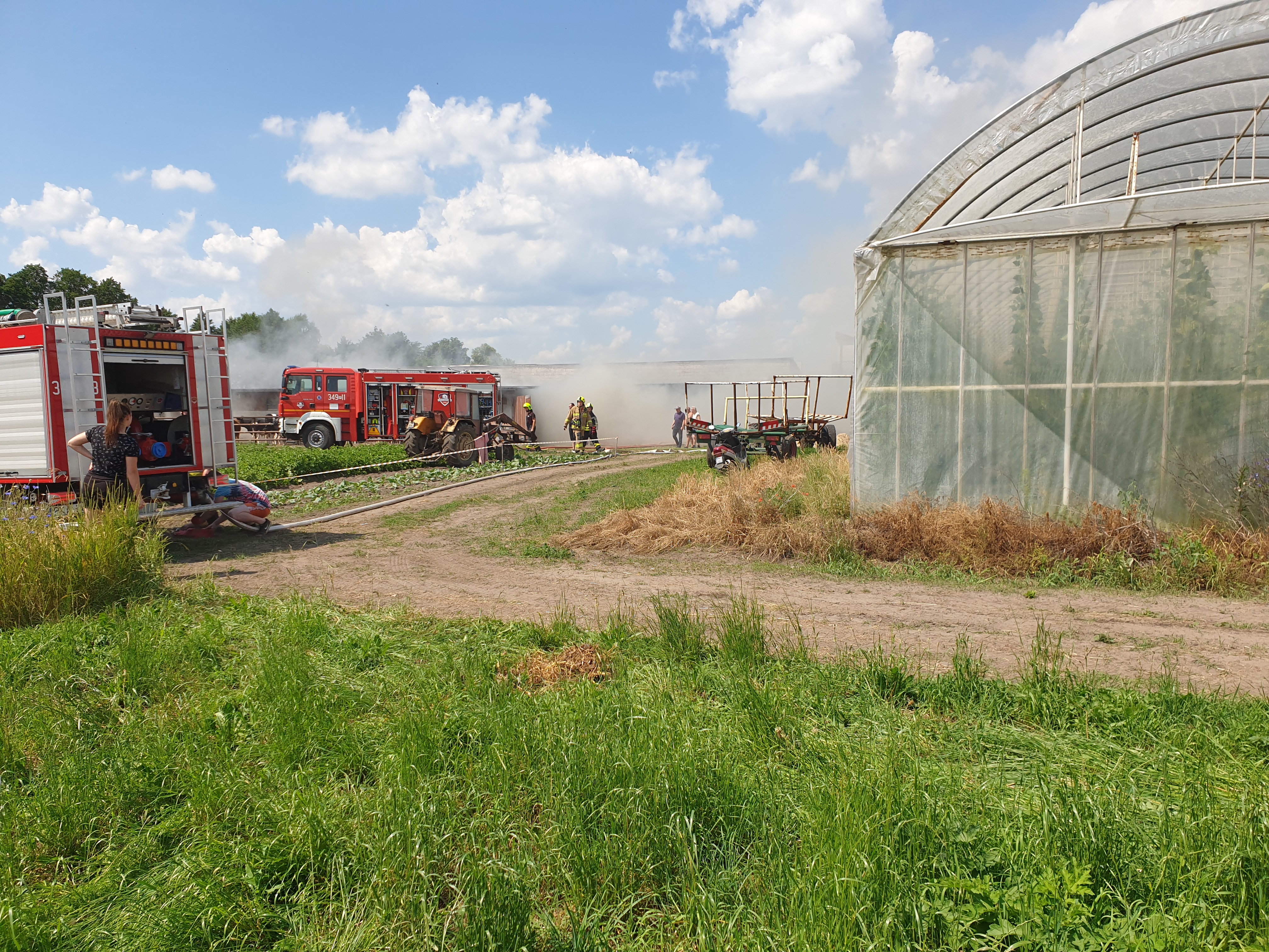 Po dojeździe na miejsce pierwszych zastępów ustalono, że na terenie gospodarstwa rolnego występuje duże zadymienie, a wewnątrz budynku gospodarczego palą się składowane baloty siana oraz sprzęt rolniczy. Działania zastępów polegały na podaniu prądów wody w natarciu do wnętrza z trzech stron budynku oraz prowadzono obronę pobliskich tuneli foliowych przy pomocy kurtyn wodnych. Po zlokalizowaniu pożaru przystąpiono do oddymiania oraz wywożenia balotów wykorzystując do tego ciągnik rolniczy i ładowarkę teleskopową. Po ugaszeniu pożaru sprawdzono budynek przy pomocy kamery termowizyjnej. W akcji trwającej ok. 10 godzin brało udział 15 zastępów straży pożarnej w tym 65 strażaków.