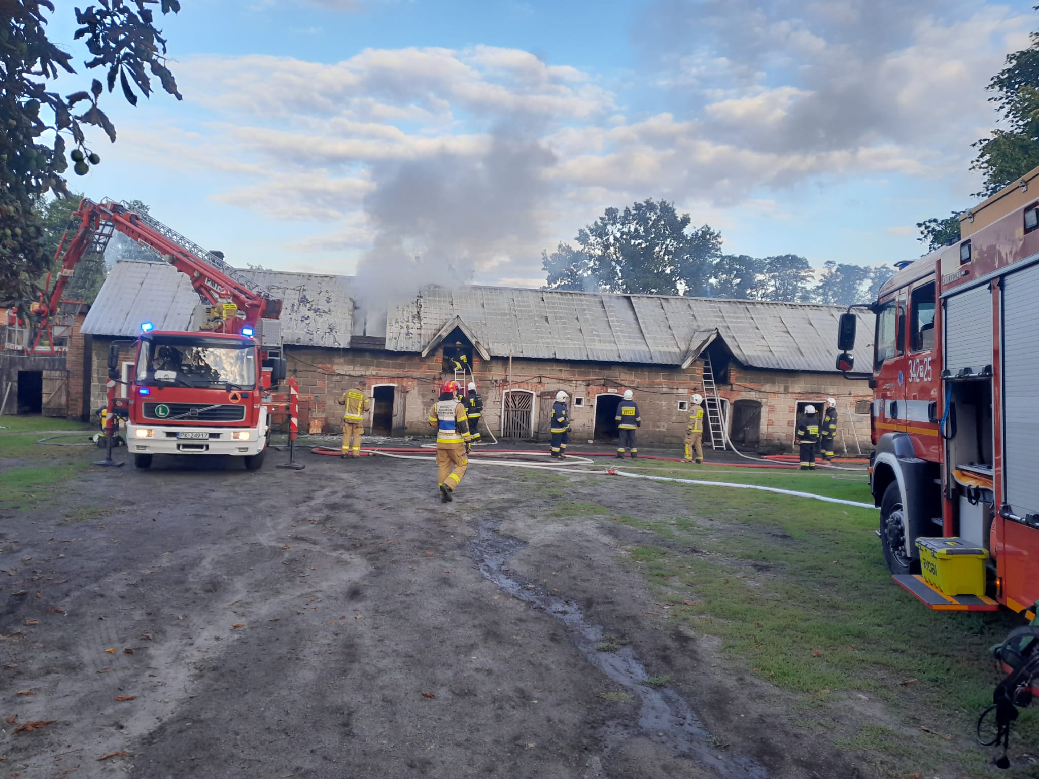 Dnia 30 sierpnia br. o godzinie 17:51 do Stanowiska Kierowania Komendanta Miejskiego Państwowej Straży Pożarnej w Kaliszu wpłynęło zgłoszenie o pożarze budynku gospodarczego w miejscowości Saczyn gm. Godziesze. Po przybyciu pierwszych jednostek straży na miejsce zdarzenia stwierdzono, że pali się drewniana konstrukcja dachu budynku gospodarczego. Z części inwentarskiej właściciel wyprowadził 11 sztuk bydła przed przyjazdem Straży Pożarnej. W budynku nie przebywały żadne osoby. Działania straży w pierwszej fazie pożaru polegały na zabezpieczeniu miejsca zdarzenia i odłączeniu prądu do budynku. Następnie podano 3 prądy wody w natarciu na palącą się konstrukcję dachu budynku. Po opanowaniu pożaru przystąpiono do częściowej rozbiórki dachu i dogaszaniu pożaru. Pożar ugaszono. Działania zakończono.