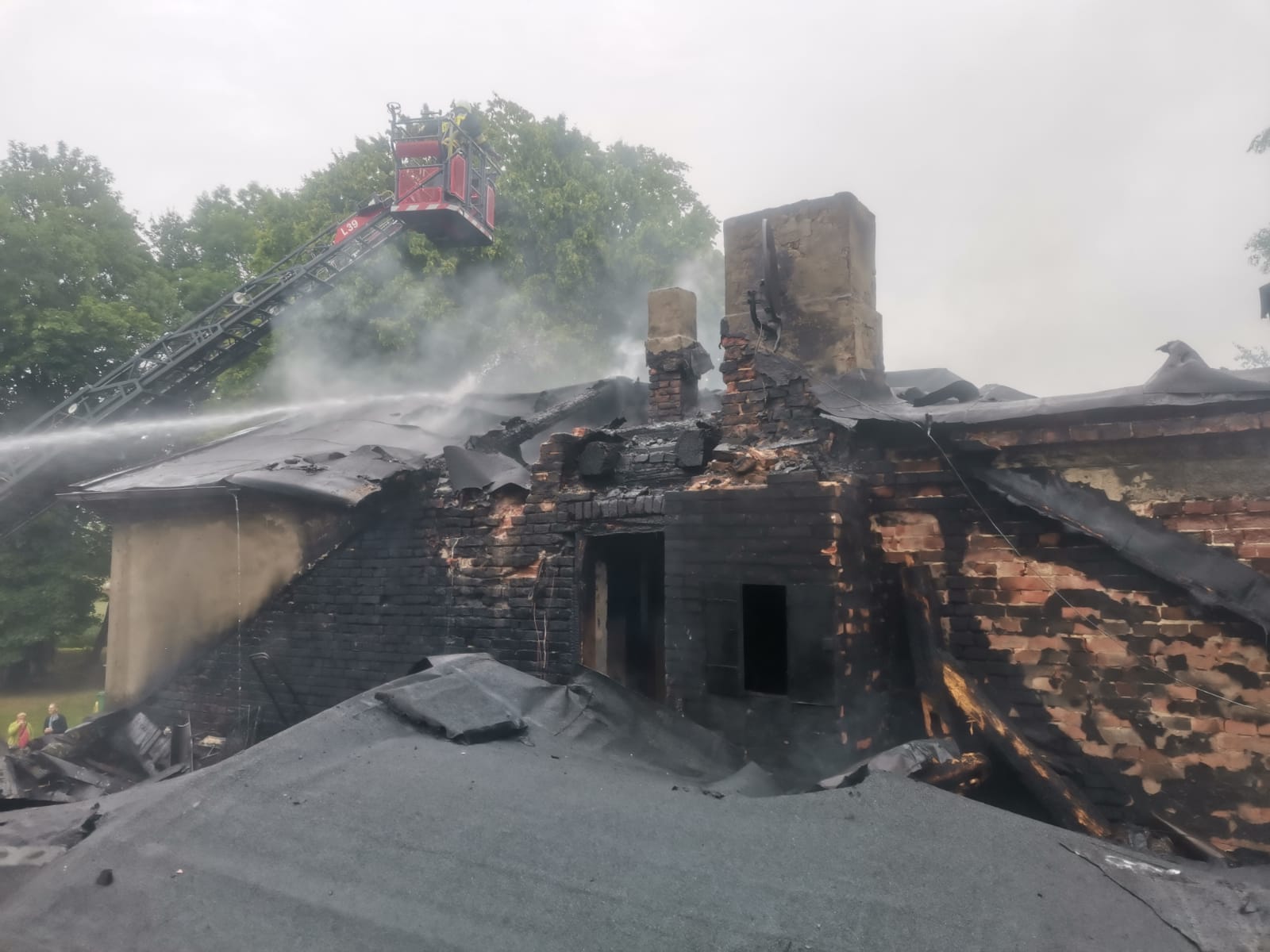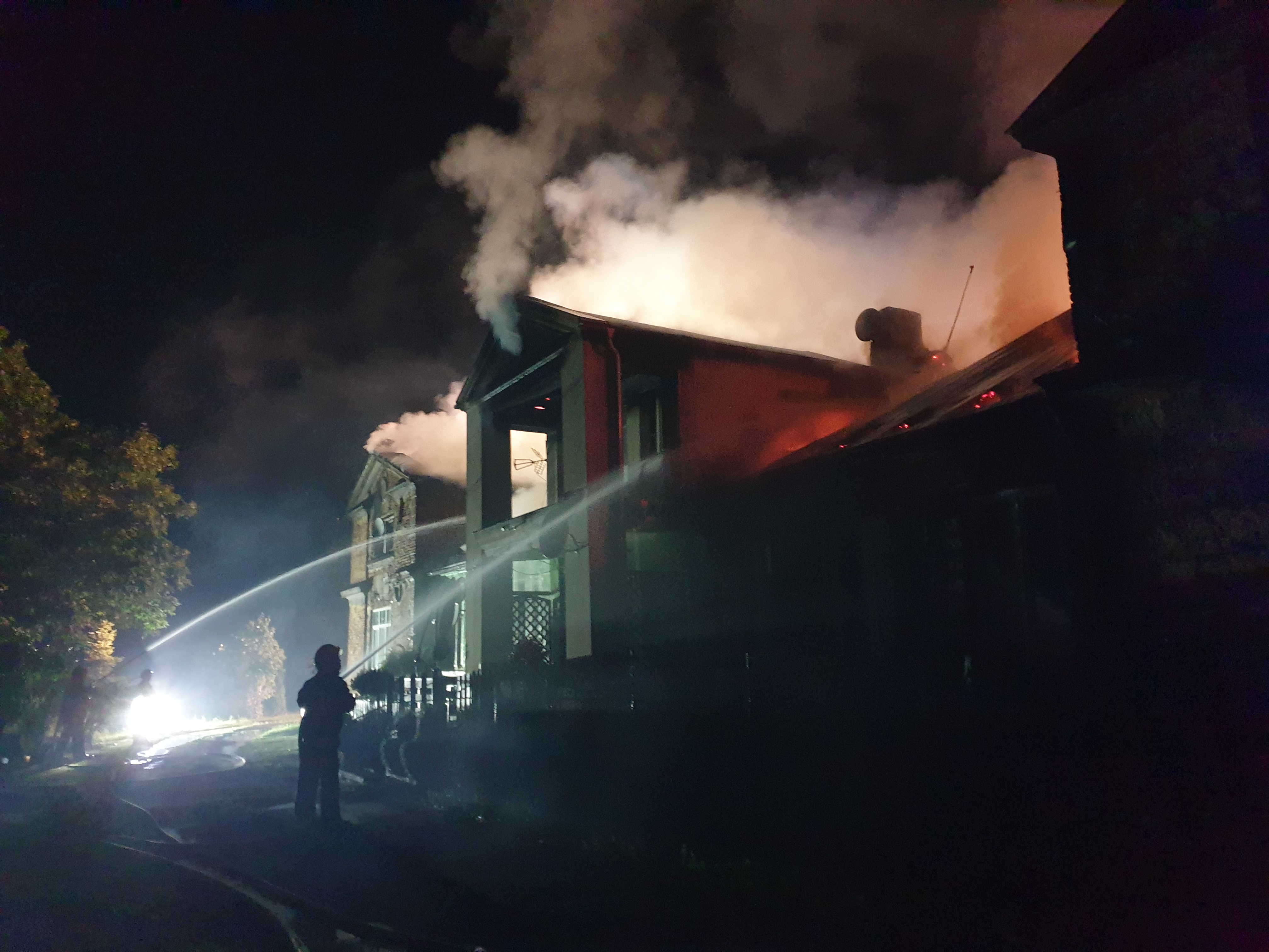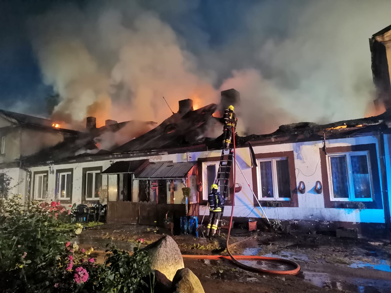 W dniu 1 lipca 2023 roku około godziny 1:30 w nocy do Stanowiska Kierowania Komendanta Miejskiego Państwowej Straży Pożarnej w Kaliszu wpłynęło zgłoszenie o pożarze budynku wielorodzinnego w miejscowości Dębsko-Ośrodek w podkaliskiej gminie Koźminek. Po przybyciu na miejsce zdarzenia Jednostek Ochrony Przeciwpożarowej stwierdzono, że ogniem objęty jest dach oraz poddasze budynku mieszkalnego. Z informacji uzyskanych od mieszkańców wynikało, że w budynku przebywały 24 osoby z czego 21 ewakuowało się o własnych siłach przed przybyciem na miejsce straży pożarnej. Świadkowie przekazali natomiast informację, że w budynku znajdują się jeszcze 3 osoby. W wyniku rozpoznania oraz z informacji uzyskanych od świadków zdarzenia ustalono, że osoby które nie ewakuowały się przebywają na piętrze palącego się budynku. Za pomocą drabiny przenośnej ewakuowano z piętra budynku kobietę, której udzielono następnie kwalifikowanej pierwszej pomocy i przekazano Zespołowi Ratownictwa Medycznego. Dwie roty strażaków dokonywały przeszukania budynku w celu odnalezienia oraz ewakuacji pozostałych osób. W tym samym czasie strażacy zbudowali dwie linie gaśnicze w natarciu, które wprowadzono na kondygnację piętra z dwóch stron budynku. Roty dokonujące przeszukania zlokalizowały pozostałe 2 osoby - jedną z nich ewakuowano i z uwagi na stwierdzenie braku oddechu przystąpiono do RKO. Druga z osób poszkodowanych znajdowała się w pomieszczeniu na piętrze budynku, jednak odstąpiono od udzielenia kwalifikowanej pierwszej pomocy z uwagi na duży stopień zwęglenia ciała. Po kilkudziesięciu minutach prowadzenia resuscytacji krążeniowo-oddechowej stwierdzono zgon drugiego poszkodowanego. Równocześnie na terenie działań budowano kolejne linie gaśnicze w natarciu, w tym linie gaśnicze z podnośnika hydraulicznego oraz drabiny mechanicznej, w celu podania wody na palący się budynek. Zaopatrzenie wodne zorganizowano na bazie systemu mieszanego łącząc dowożenie oraz przetłaczanie. Punkt czerpania wody zorganizowano na moście na rzece Swędrnii w Koźminku. Dodatkowym buforem wody była cysterna z Jednostki Ratowniczo-Gaśniczej nr 1 w Kaliszu. Na miejsce zdarzenia przybył Komendant Miejski PSP w Kaliszu st. bryg. Tomasz Polak, który przejął dowodzenie. Przybyli na miejsce przedstawiciele Gminy, w tym Pani Burmistrz Gminy Koźminek Iwona Michniewicz zorganizowali schronienie dla ewakuowanych osób w pobliskim budynku sali OSP. Dalsze działania polegały na sukcesywnym rozcinaniu oraz usuwaniu konstrukcji palącego się dachu oraz poddasza. Na miejsce zdarzenia przybyła Grupa Operacyjna KM PSP Kalisz oraz KW PSP Poznań. Na miejsce prowadzonych działań przybył również prokurator który przeprowadził oględziny wraz z Policją - czynności Jednostek Ochrony Przeciwpożarowej polegały w tym zakresie na oświetleniu miejsca oględzin. Po lokalizacji pożaru oraz usunięciu i ugaszeniu palących się elementów konstrukcji dachu budynek sprawdzono za pomocą kamery termowizyjnej - zagrożenia nie stwierdzono. W działaniach trwających ponad 10 godzin uczestniczyło w sumie 27 zastępów, składających się ze 108 ratowników.