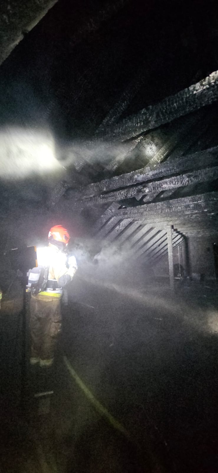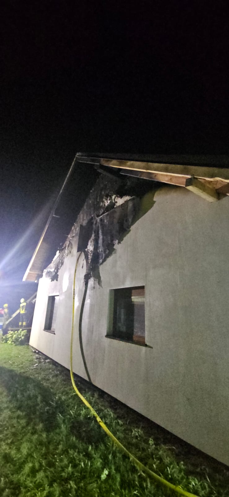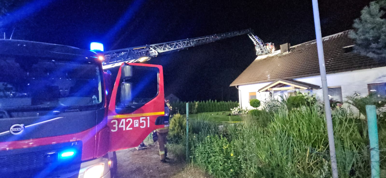 W dniu 25 lipca o godzinie 22:17 do Stanowiska Kierowania Państwowej Straży Pożarnej w Kaliszu wpłynęło zgłoszenie o pożarze budynku jednorodzinnego w miejscowości Krzyżówki (gm. Koźminek). Po dojeździe na miejsce pierwszych jednostek ochrony przeciwpożarowej stwierdzono, że pali się budynek jednorodzinny o wymiarach 18 m x 6 m x 8 m wysokości. Pożarem objęte było całe poddasze budynku oraz dobudowane zadaszenie tarasu, ogień wydostawał się poza obrys dachu krytego papą i blachodachówką. Na dachu dodatkowo znajdowała się instalacja fotowoltaiczna, która nie została objęta pożarem. Czterej mieszkańcy domu opuścili budynek przed przybyciem pierwszych zastępów na miejsce i nie wymagali pomocy medycznej. Działania przybyłych zastępów Straży Pożarnej polegały na zabezpieczeniu miejsca zdarzenia, odłączenia zasilania elektrycznego do budynku, równolegle podano dwa prądy wody z zewnątrz budynku oraz wprowadzono na poddasze dwie roty gaśnicze zabezpieczone sprzętem ochrony układu oddechowego. Z chwilą przybycia kolejnych zastępów sukcesywnie wprowadzono kolejne roty, w tym jedną z sprawionej drabiny mechanicznej. Na miejsce zdarzenia przybył oficer w dyspozycji Komendanta Miejskiego PSP. W trakcie prowadzonych działań, ze względu na złe samopoczucie mieszkańca budynku na miejsce zdarzenia przybył Zespół Ratownictwa Medycznego. Po przebadaniu osoba poszkodowana pozostała na miejscu i nie wymagała dalszej hospitalizacji. Po zlokalizowaniu pożaru dalsze działania polegały na dogaszaniu i kontroli z wykorzystaniem kamer termowizyjnych, oddymieniu budynku, rozbiórce blachy na dachu oraz dobudowanego zadaszenia tarasu przy użyciu sprzętu burzącego i pił ratowniczych. Pożar ugaszono, pomieszczenia na parterze budynku sprawdzono miernikami wielogazowymi pod kątem obecności tlenku węgla – pomiar 0 ppm, działania zakończono.
