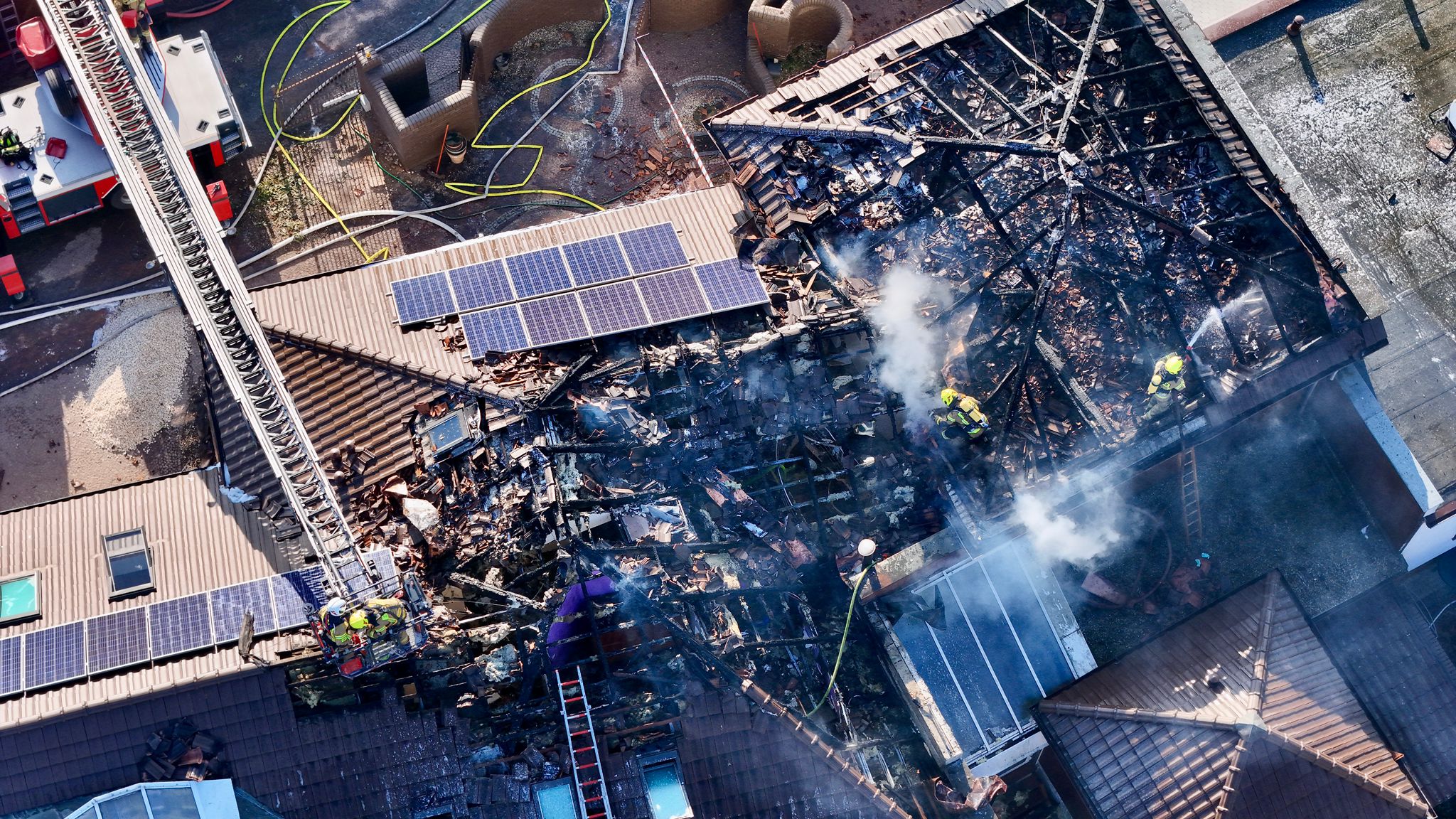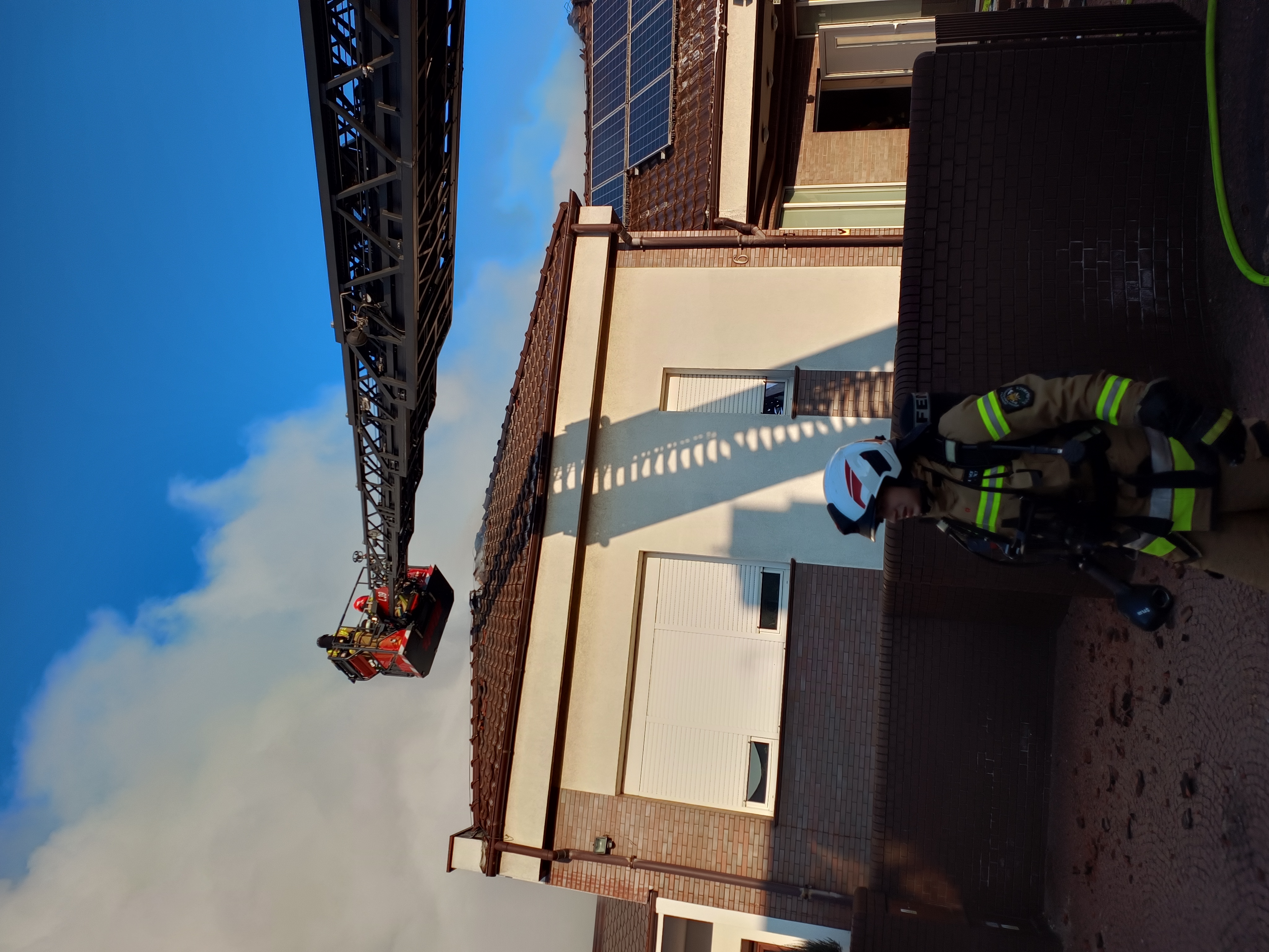 Oprócz drabiny wykorzystywano również podnośnik hydrauliczny. Strażakom udało się odciąć pożar od niespalonej części budynku, dachu. Całość dachu to połać o powierzchni około 570 metrów kwadratowych, przynajmniej połowa z tego objęta była pożarem.