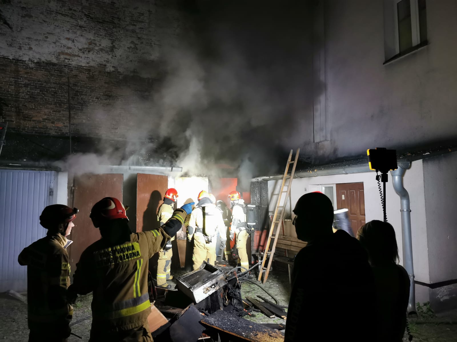 30 lipca br. o godzinie 01:07 wpłynęło zgłoszenie o pożarze budynku gospodarczego wraz z przyległym mieszkaniem w Kaliszu przy ul. Grodzkiej 10. Po przybyciu na miejsce zdarzenia stwierdzono, że pożarem objęty jest drwalnik wraz ze składowanymi materiałami oraz przedpokój mieszkania. Działania straży polegały na podaniu dwóch prądów wody na palący się drwalnik oraz sprawdzania mieszkania pod kątem osób poszkodowanych, których po dokładnym sprawdzeniu nie stwierdzono. Po opanowaniu sytuacji przystąpiono do wynoszenia materiałów składowanych z drwalnika i ich sukcesywnym przelewaniu na zewnątrz. Jednocześnie przystąpiono do prac rozbiórkowych dachu, którego ściągnięte elementy przelewano celem dogaszenia. Po całkowitym ugaszeniu pożaru sprawdzono lokale mieszkalne na obecność tlenku węgla. W działaniach trwających blisko 3 godziny wzięły udział cztery zastępy Państwowej Straży Pożarnej oraz jeden zastęp OSP Kalisz-Lis.
