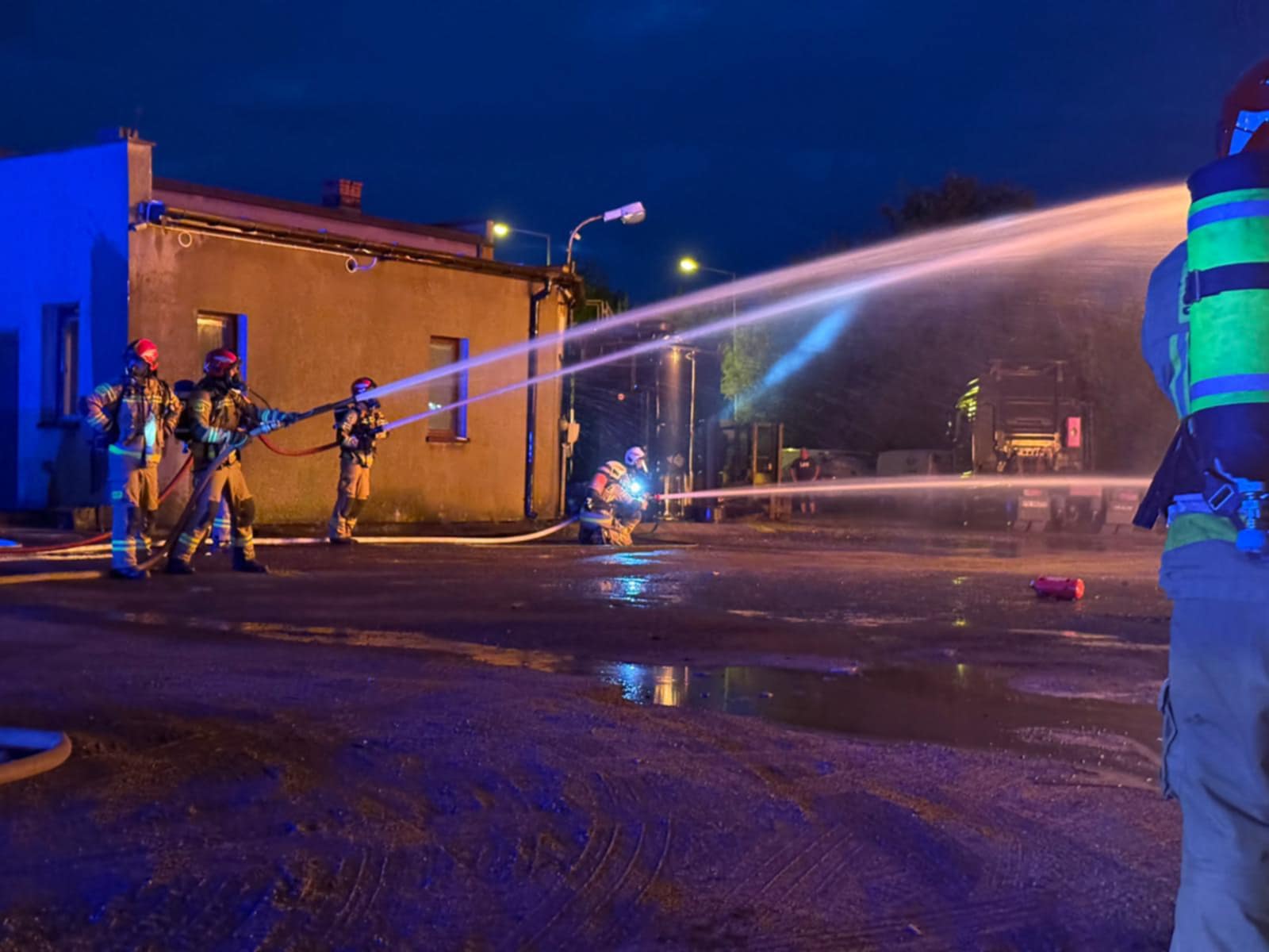 Strażacy podali siedem prądów gaśniczych – zarówno w natarciu na palące się ciężarówki, jak i w obronie innych pojazdów oraz zbiornika z paliwem, w którym znajdowało się około 8 m³ oleju napędowego.