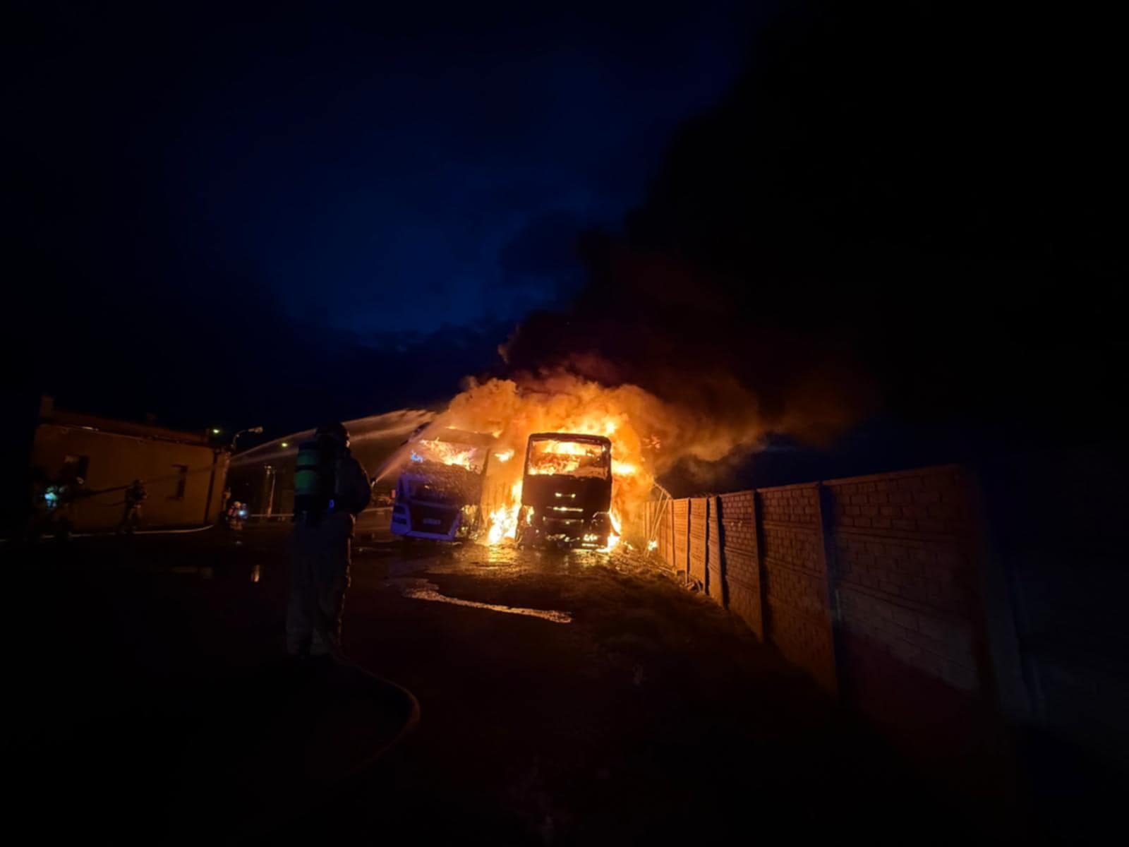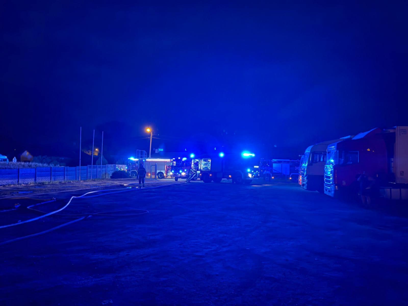 Na szczęście, mimo dużych strat materialnych, w zdarzeniu nikt nie ucierpiał. Spłonęły dwa ciągniki siodłowe wraz z naczepami. Pożarzysko zostało pokryte pianą ciężką w celu dogaszenia ukrytych zarzewi ognia. Dokładne okoliczności zdarzenia ustala Policja.