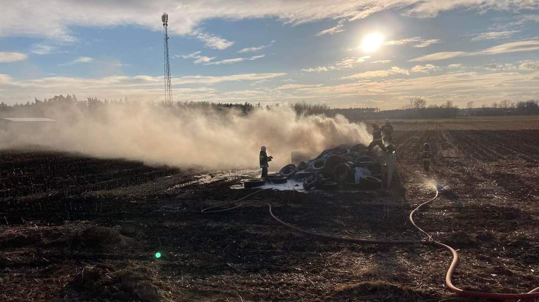 W dniu 08.03.2022r w miejscowości Brzeziny doszło do pożaru ścierniska po skoszonej kukurydzy oraz dużej sterty używanych opon. Działania straży polegały na podaniu dwóch prądów piany na palące się opony, a przy użyciu tłumic i szpadli gaszono pożar rżyska (bardzo podmokły teren uniemożliwiający wjazd samochodami pożarniczymi).
