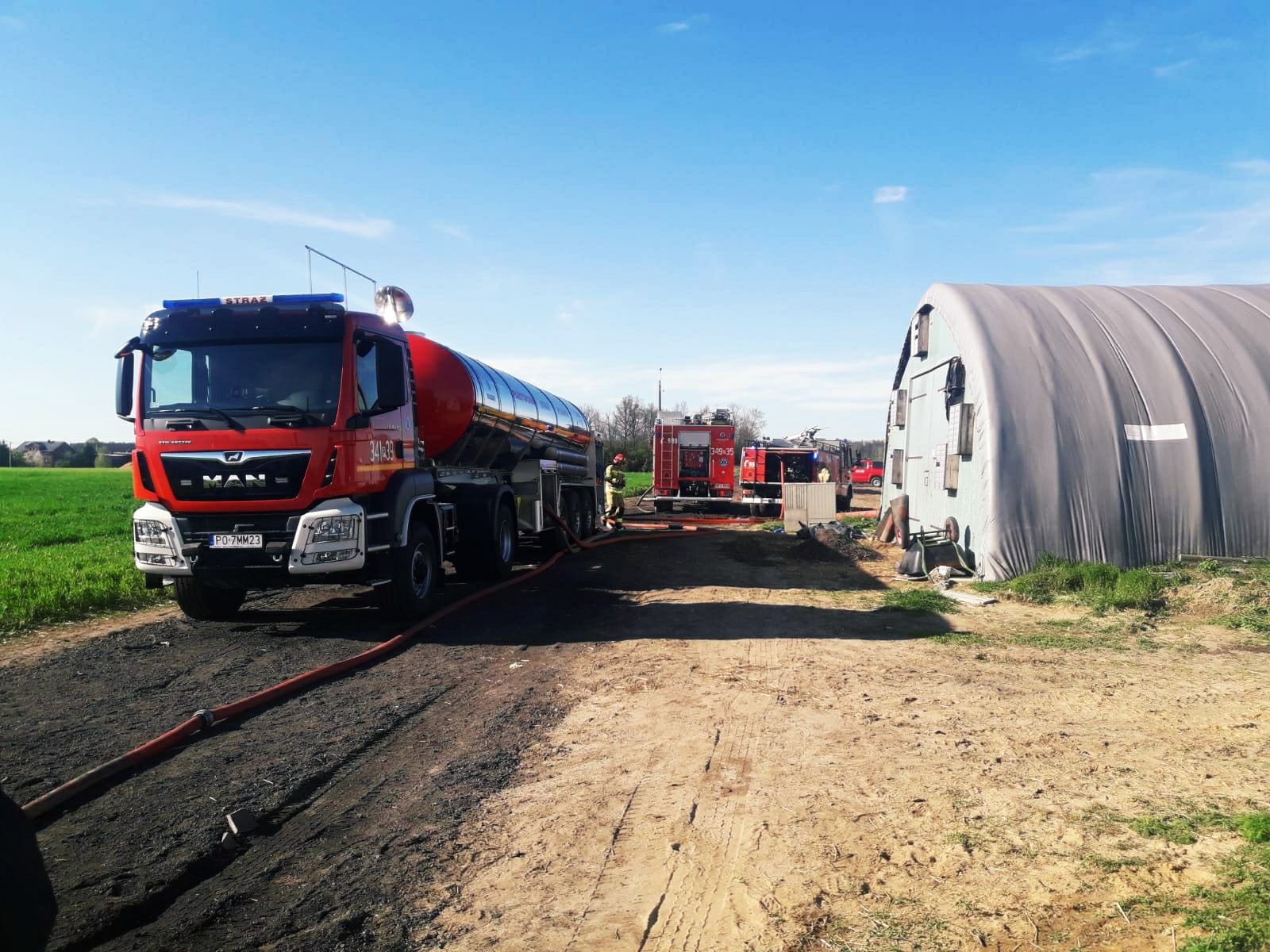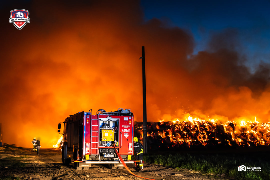 W dniu 10 maja 2021 roku, we wczesnych godzinach porannych Stanowisko Kierowania Komendanta Miejskiego Państwowej Straży Pożarnej w Kaliszu otrzymało zgłoszenie o pożarze stogów słomy w miejscowości Nowy Karolew (Gmina Koźminek). Na miejsce zdarzenia Dyżurny Stanowiska Kierowania zadysponował w pierwszym rzucie zastęp z Jednostki Ratowniczo-Gaśniczej nr 1 oraz zastępy z Ochotniczej Straży Pożarnej w Koźminku. Po dotarciu na miejsce zdarzenia stwierdzono, że pali się w całej objętości stóg słomy w kształcie litery "C" o wymiarach około 60 x 100 x 60 metrów, a Siły i Środki przybyłe na miejsce są niewystarczające do prowadzenia skutecznej akcji gaśniczej. W pobliżu znajdowało się 7 pustych budynków inwentarskich, które narażone były na wysokie promieniowanie cieplne. W pierwszej kolejności odłączono prąd w sąsiednich obiektach inwentarskich, następnie zostały podane cztery prądy wody w obronie przez ratowników ubranych w sprzęt Ochrony Układu Oddechowego. Na polecenie Kierującego Działaniami Ratowniczymi na miejsce zdarzenia zadysponowano kontener z aparatami powietrznymi z Komendy Powiatowej Państwowej Straży Pożarnej w Ostrowie Wielkopolskim. W dalszej kolejności w celu poprawy komfortu pracy ratowników ustawiono cztery kurtyn wodne. Podczas działań utworzono osobną linię gaśniczą z pianą sprężoną i pokryto najbardziej narażone na promieniowanie budynki. Po zakończeniu podawania piany sprężonej linię przystosowano do podawania piany ciężkiej, którą podano na palący się dłuższy bok stogu w pobliżu budynków w celu zmniejszenia emitowanego ciepła. W trakcie działań Kierujący Działaniem Ratowniczym podzielił teren akcji na trzy odcinki bojowe (zaopatrzenie wodne, działania gaśnicze w obronie, działania gaśnicze w natarciu). Utworzono bufor wodny na bazie GCBM 25/16 z Jednostki Ratowniczo-Gaśniczej nr 1 w Kaliszu, oraz zbiorników brezentowych o poj. 13 metrów sześciennych i 2,5 metra sześciennego, do których dowożona była woda z rzeki Swędrni (odległość około 2 kilometrów) oraz równocześnie z tej samej rzeki budowano magistralę o długości 1400 metrów. W trakcie działań, po uzyskaniu zabezpieczenia wodnego zbudowano dodatkowo 3 linie gaśnicze, które zabezpieczały tył pożaru. Po spaleniu znacznej części słomy, wykorzystując bosaki oraz ładowarkę teleskopową, którą operował właściciel, przystąpiono do dogaszania pożaru. Gaszenie oraz przelewanie pogorzeliska rozpoczęto od tyłu pożaru równolegle z dwóch stron oraz w miarę możliwości przesuwano działania w kierunku obiektów inwentarskich ze względu na kierunek wiatru. W trakcie działań Miejsko-Gminne Centrum Zarządzania Kryzysowego dostarczyło posiłek oraz materiały pędne do sprzętu pracującego na terenie akcji. Po zakończeniu działań gaśniczych miejsce zdarzenia przekazano właścicielowi. W działaniach wzięło udział 21 zastępów straży pożarnej, w tym Pluton Gaśniczy Kalisz oraz Grupa Operacyjna KM PSP w Kaliszu. Na miejscu obecny był również Komendant Miejski PSP bryg. Sławomir Kotoński.