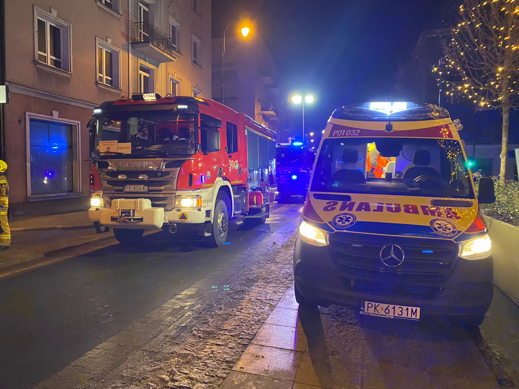 W dniu 21.12.2022r o godz. 2:43 dyżurny SKKM w Kaliszu odebrał zgłoszenie o pożarze w kamienicy na ul. Śródmiejskiej 35. Na miejsce zdarzenia zostały zadysponowane trzy zastępy w tym drabina z JRG 1, jeden zastęp z JRG 2 oraz zastęp z OSP Kalisz-Lis. Łącznie w działaniach brało udział 14 strażaków z JRG 1, 4 z JRG 2 oraz 6 z OSP Kalisz-Lis. Po przybyciu na miejsce pożaru stwierdzono, że pali się mieszkanie na trzecim piętrze z wybitego okna wydobywa się czarny dym oraz płomienie. Na balkonie przyległym do mieszkania znajdowały się trzy osoby wraz z psem. Osoby te i pies w pierwszej kolejności zostały ewakuowane przy użyciu drabiny mechanicznej. Zostały one przetransportowane przez Zespół Ratownictwa Medycznego do kaliskiego szpitala celem hospitalizacji. Następnie strażacy ugasili w mieszkaniu palące się łóżko oraz elementy wystroju mieszkania. Na czas prowadzonych działań z powodu silnego zadymienia ewakuowano mieszkańców powyżej oraz poniżej trzeciego piętra. Łącznie lokal opuściło 14 osób. Na miejsce przybyło także Pogotowie Energetyczne celem odłączenia zasilania w spalonym lokalu mieszkalnym. Po oddymieniu i przewietrzeniu mieszkań oraz klatki schodowej mieszkańcy mogli powrócić do swoich lokali. Po zakończonych działaniach straży, policja rozpoczęła swoje czynności dochodzeniowe w celu ustalenia przyczyn pożaru. Działania trwały do godz. 4:06.