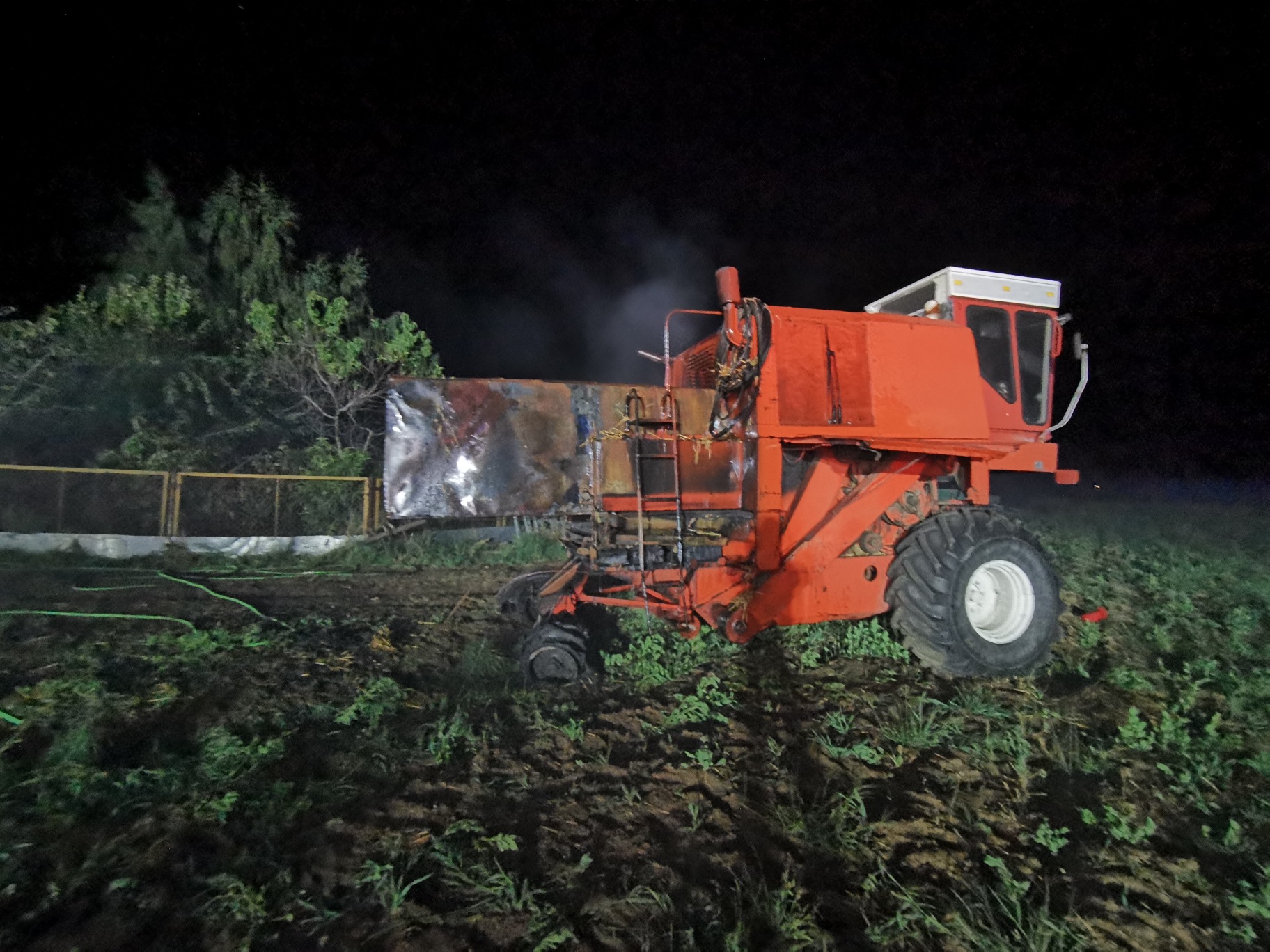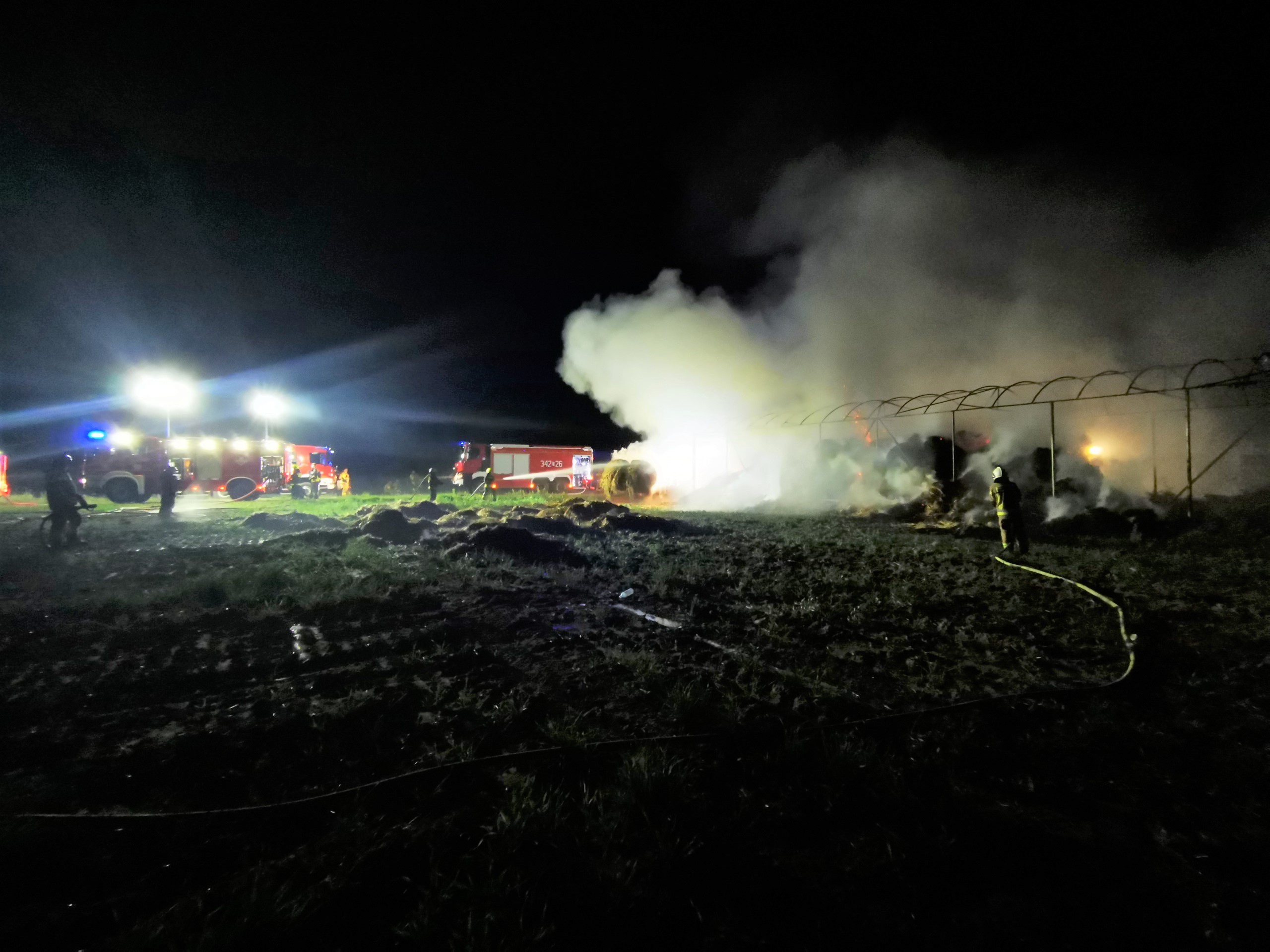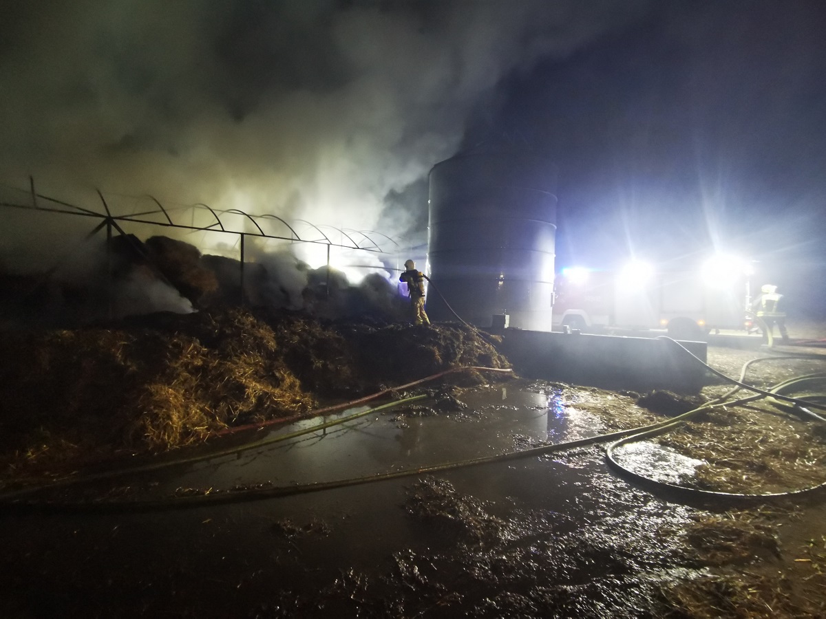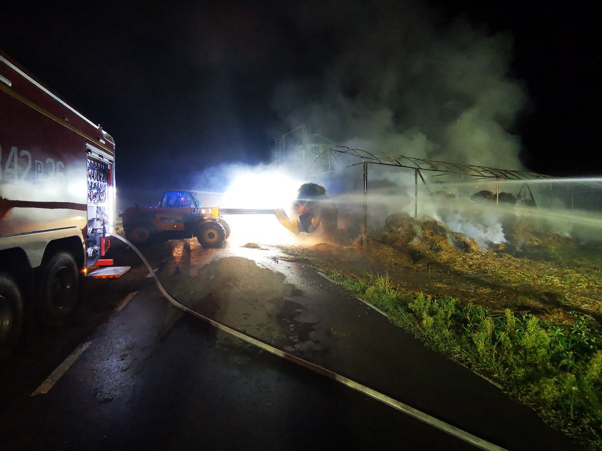 W dniu 12 września ok. godziny 00:15 do Stanowiska Kierowania Komendanta Miejskiego Państwowej Straży Pożarnej w Kaliszu wpłynęło zgłoszenie o pożarze wiaty wypełnionej słomą w miejscowości Smółki gm. Koźminek. Po przybyciu na miejsce zdarzenia pierwszych zastępów stwierdzono, że pożarem objęte zostały baloty słomy znajdujące się pod wiatą, dodatkowo paliło się poszycie dachu wiaty oraz kombajn zbożowy, znajdujący się tuż obok wiaty. W wyniku przeprowadzonego rozpoznania z właścicielem ustalono, iż pod wiatą składowane jest około 200 sztuk balotów. Po przybyciu na miejsce pierwszych zastępów podano 4 prądy wody na palącą się słomę i kombajn. Po przybyciu kolejnych zastępów straży pożarnej sukcesywnie podawano kolejne prądy wody w tym jeden prąd wody w obronie na znajdujący się obok silos wypełniony do połowy zbożem. W chwili przybycia na miejsce zdarzenia zastępu z Państwowej Straży Pożarnej KDR podjął decyzje o wykorzystaniu hydrantu naziemnego zlokalizowanego nieopodal gospodarstwa. Dodatkowo zaopatrzenie wodne realizowano metodą dowożenia z hydrantu oddalonego 1 km od miejsca zdarzenia oraz z cieku wodnego znajdującego się 3 km od miejsca zdarzenia. Teren działania podzielono na trzy odcinki bojowe, gdzie łącznie podawano 10 prądów wody. Po zlokalizowaniu pożaru przystąpiono do wywiezienia nadpalonych balotów słomy na pobliskie pole, gdzie ponownie zostały przelane wodą. Pożar ugaszono, działania zakończono.